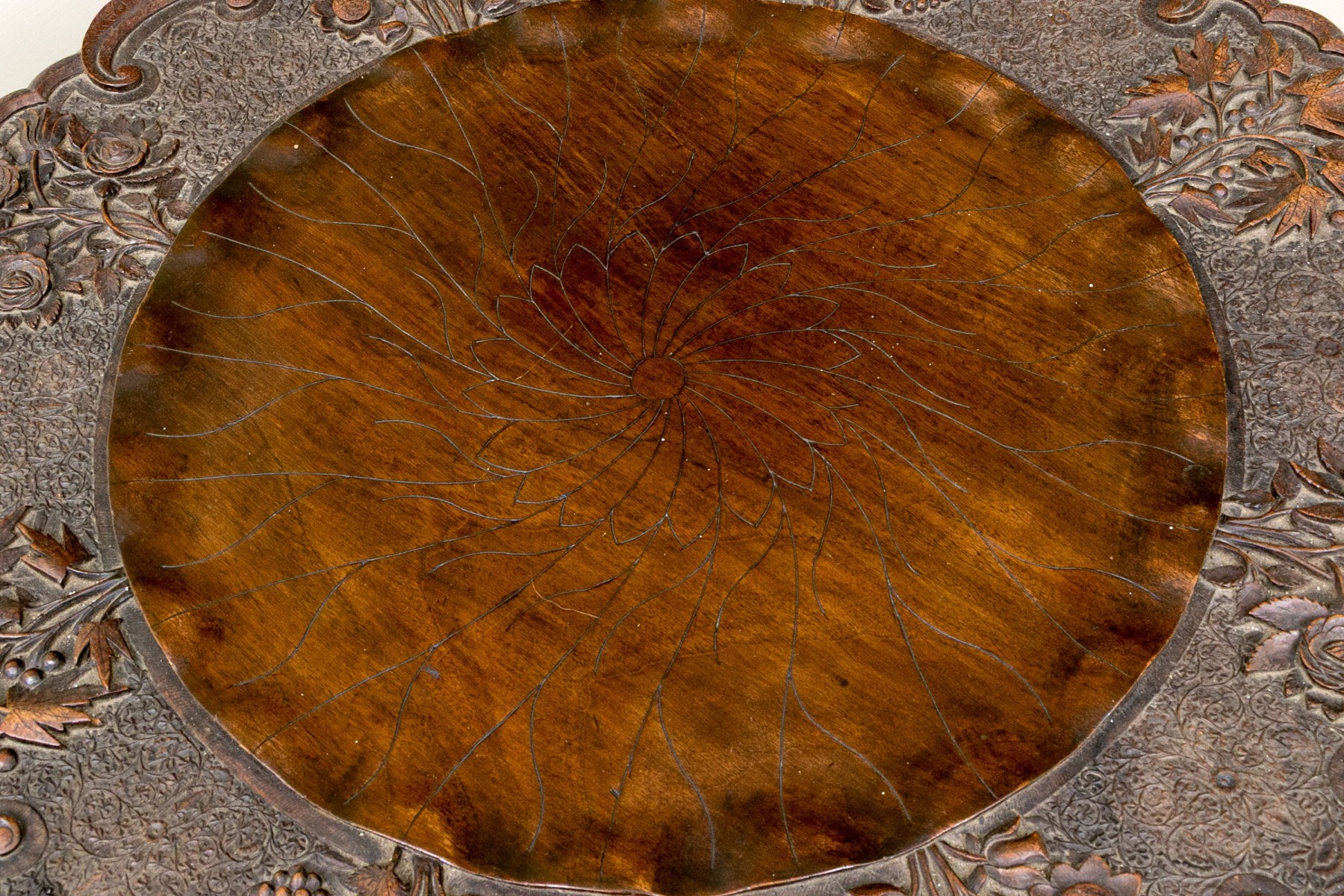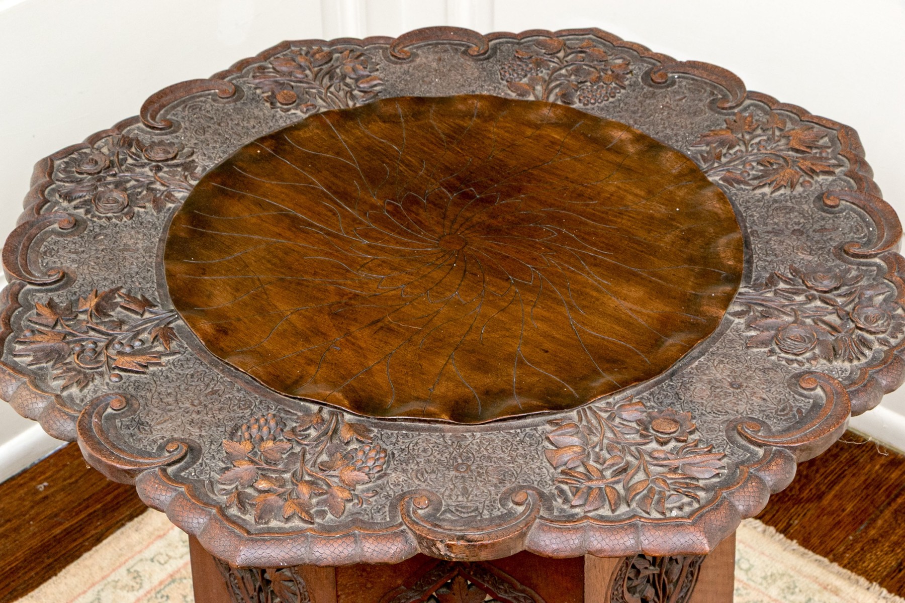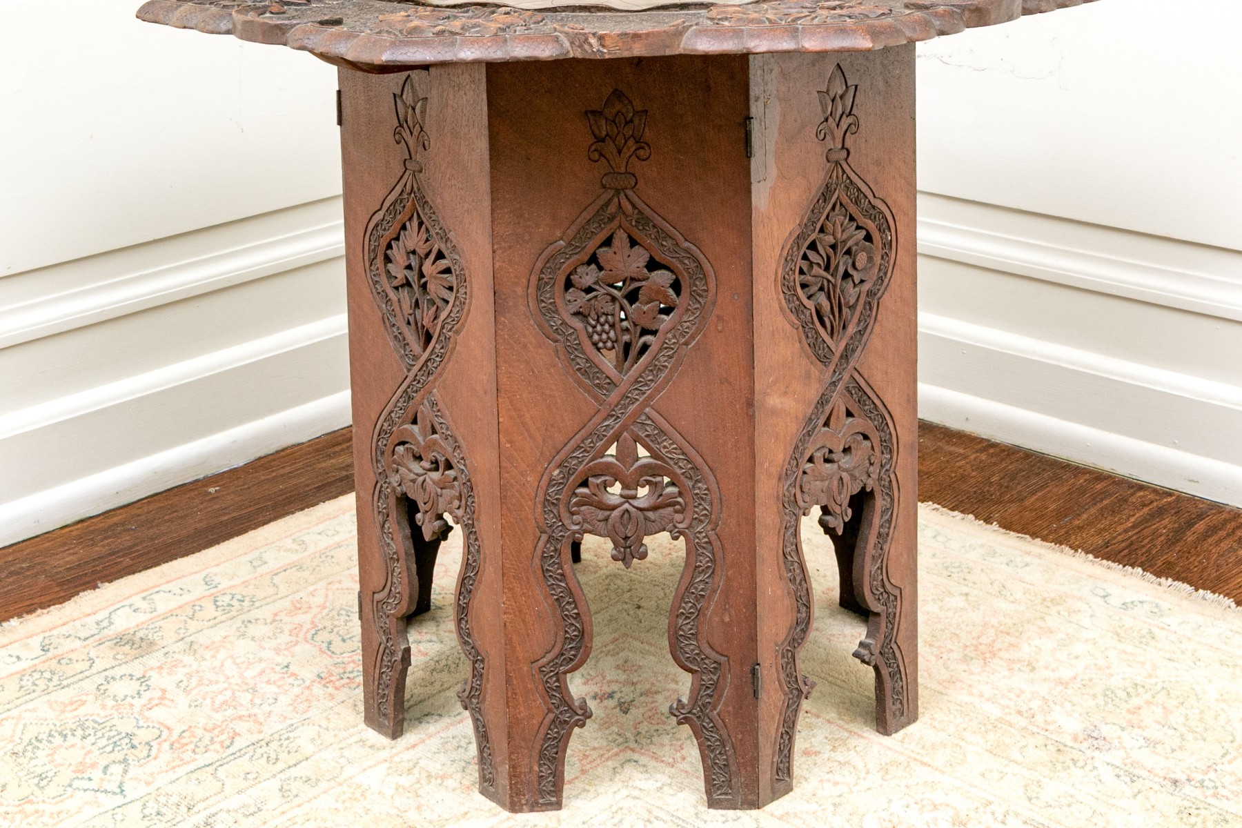 A gorgeous Moroccan accent table raised on an octagonal fork pedestal with eight legs and ornately carved openwork floral motifs. With an octagonal form table top with ornate carved floral and grape bunch motifs in relief to the outer frame of table top with inner carved center carved in water lily form with naturalistic carved veining and scalloped rim.