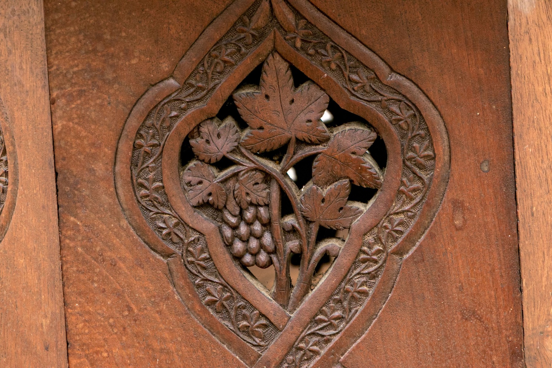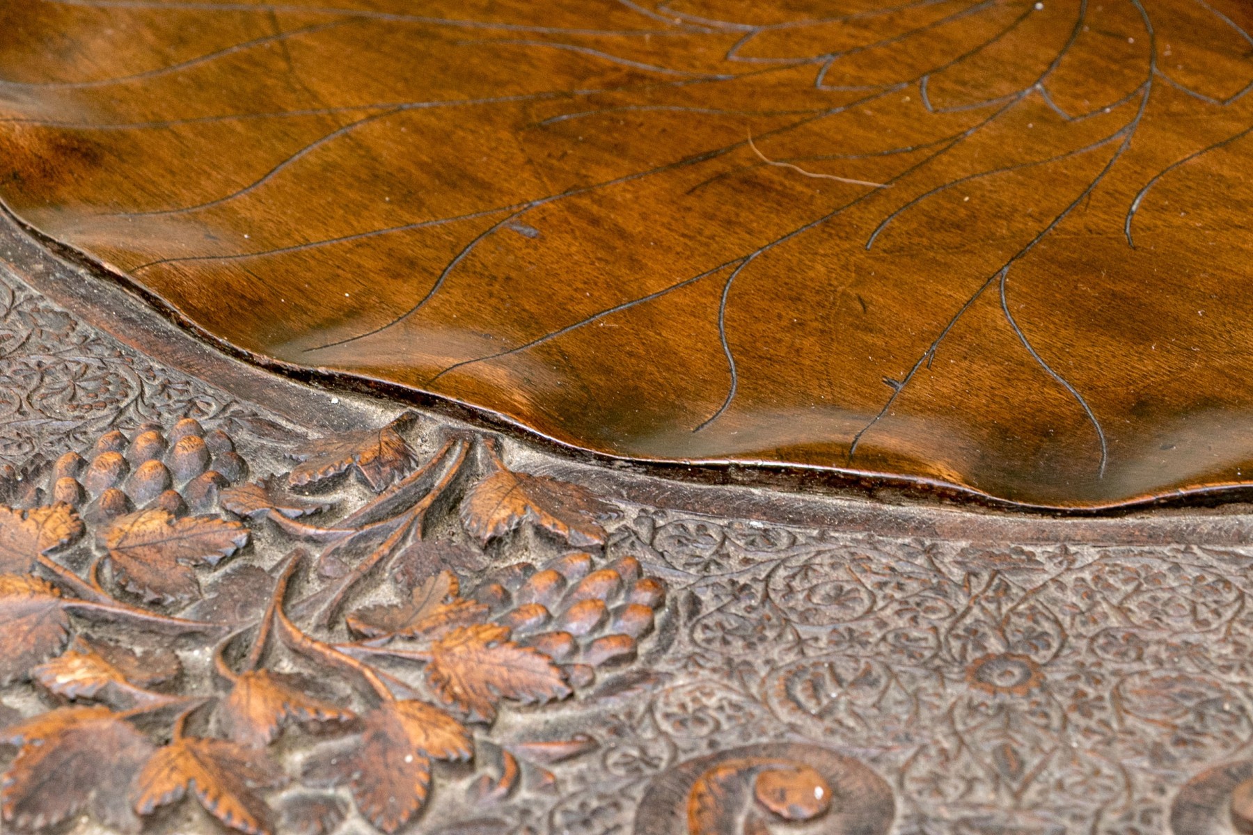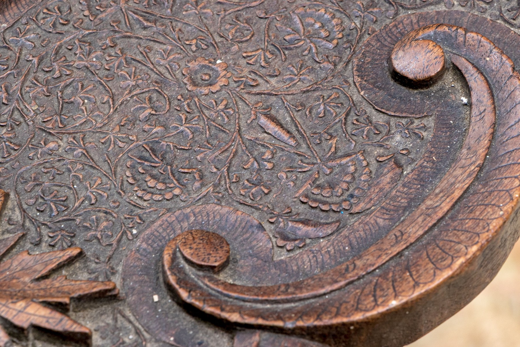 A gorgeous Moroccan accent table raised on an octagonal fork pedestal with eight legs and ornately carved openwork floral motifs. With an octagonal form table top with ornate carved floral and grape bunch motifs in relief to the outer frame of table top with inner carved center carved in water lily form with naturalistic carved veining and scalloped rim.