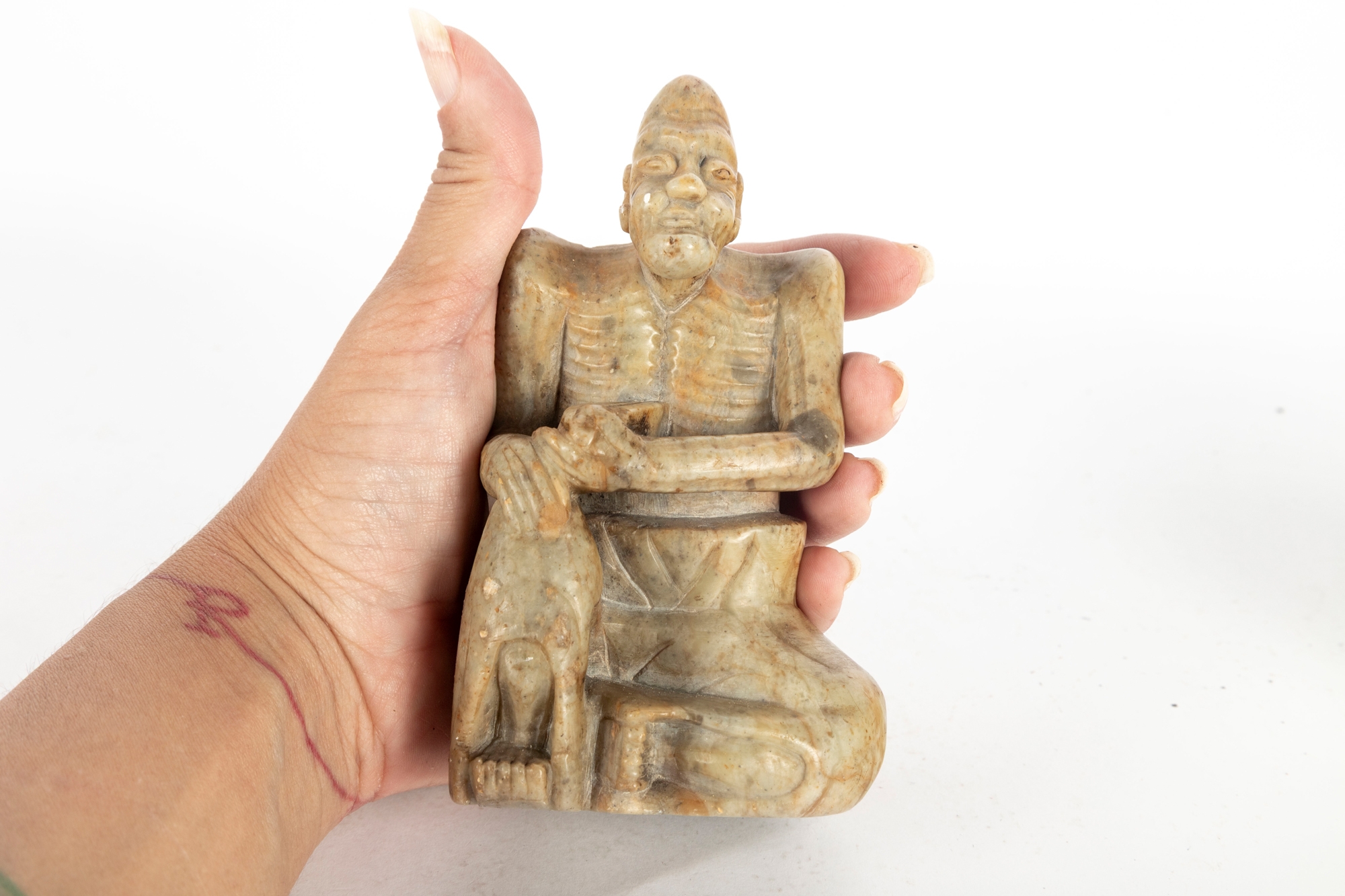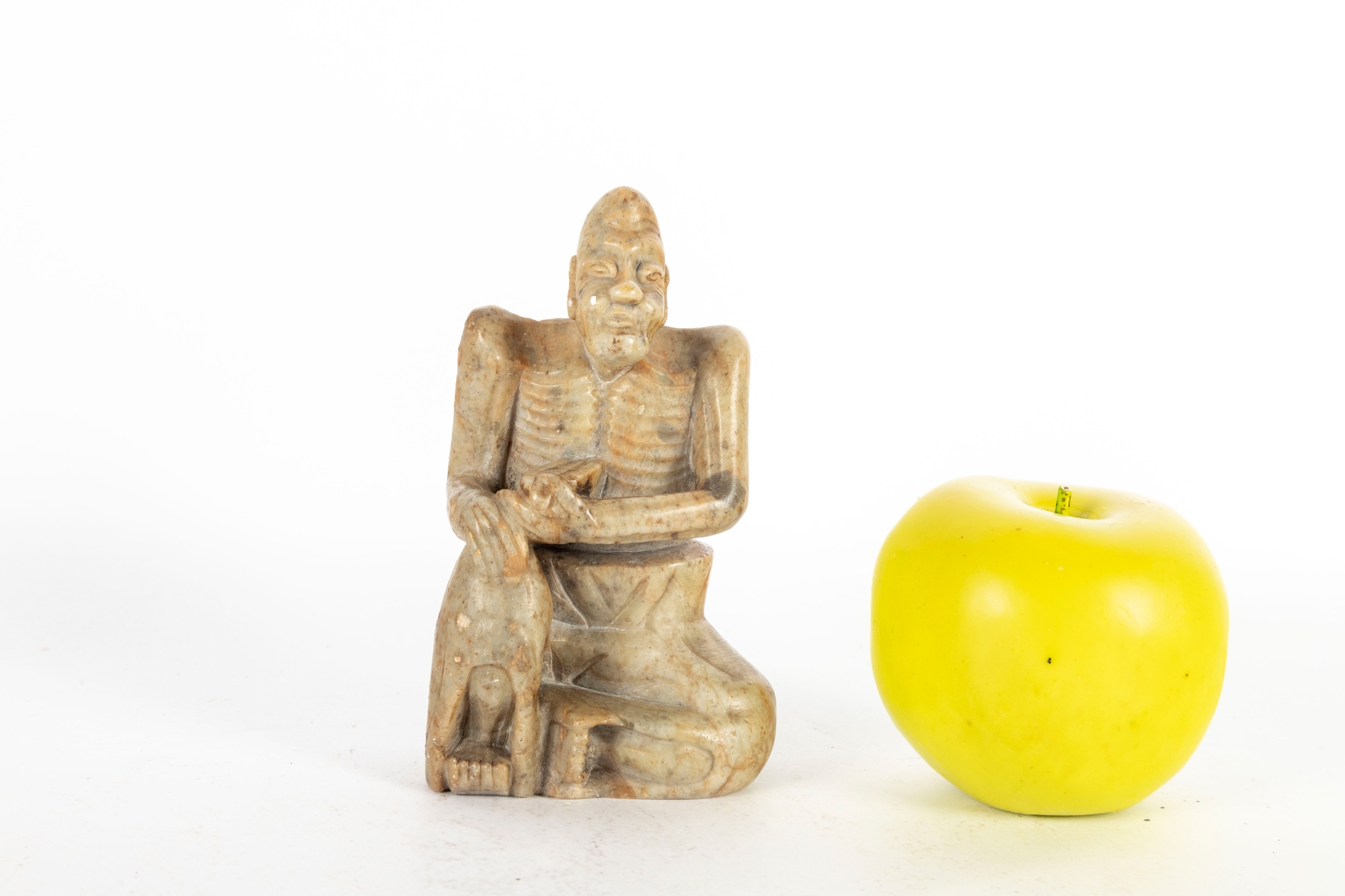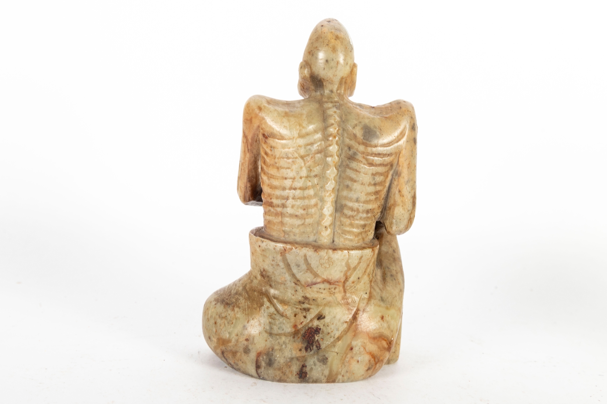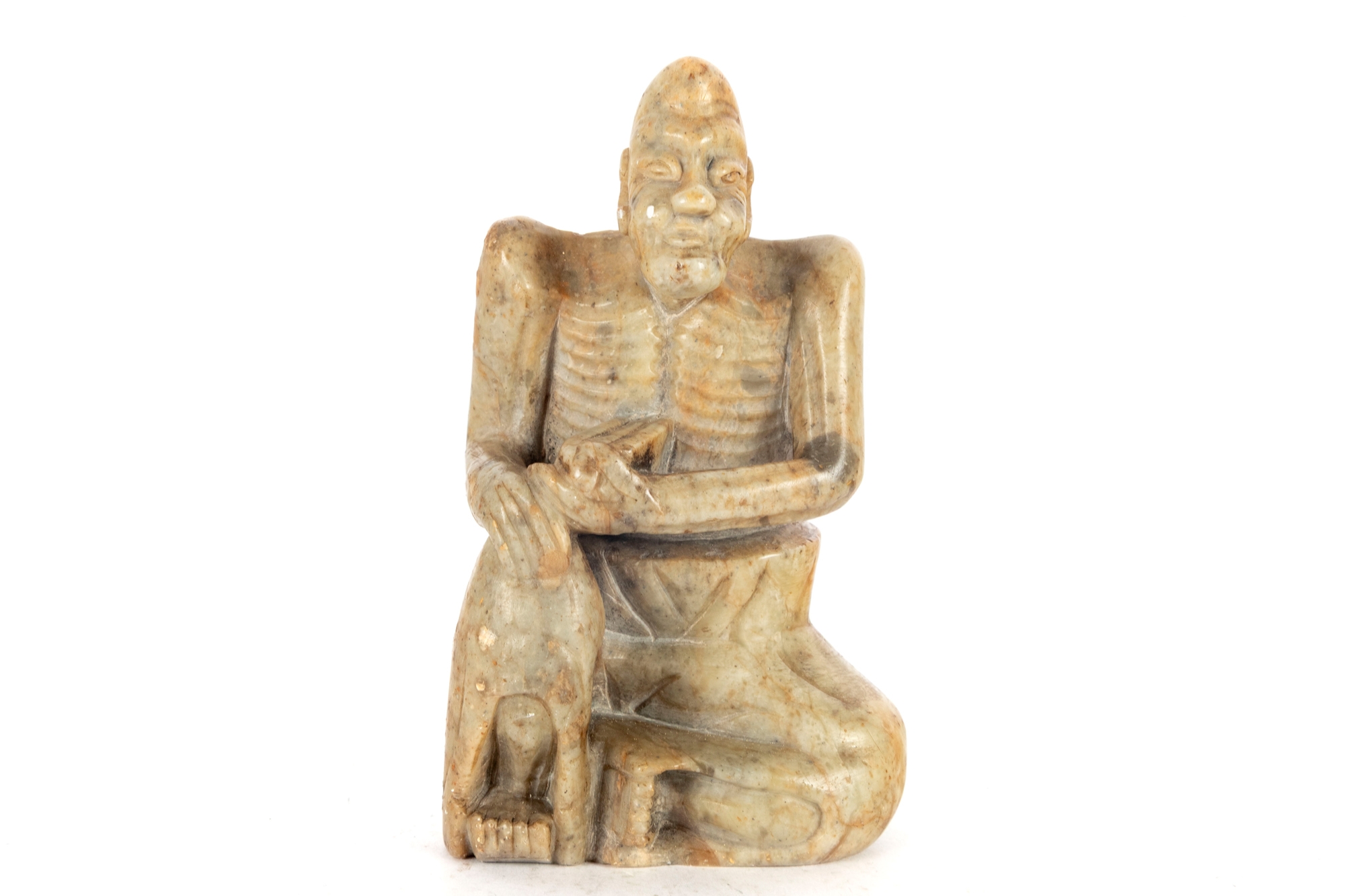 A small Chinese carved soapstone figure depicting an ascetic or luohan seated in a meditative posture. Nicely detailed with great natural brown and orange stone hues and mottled variations.
