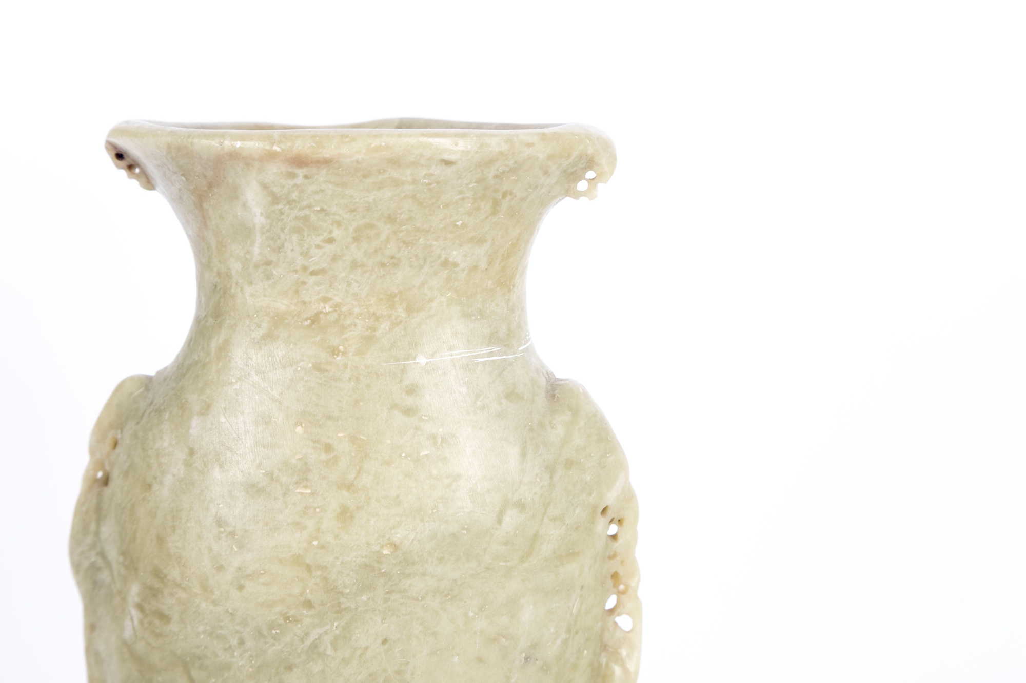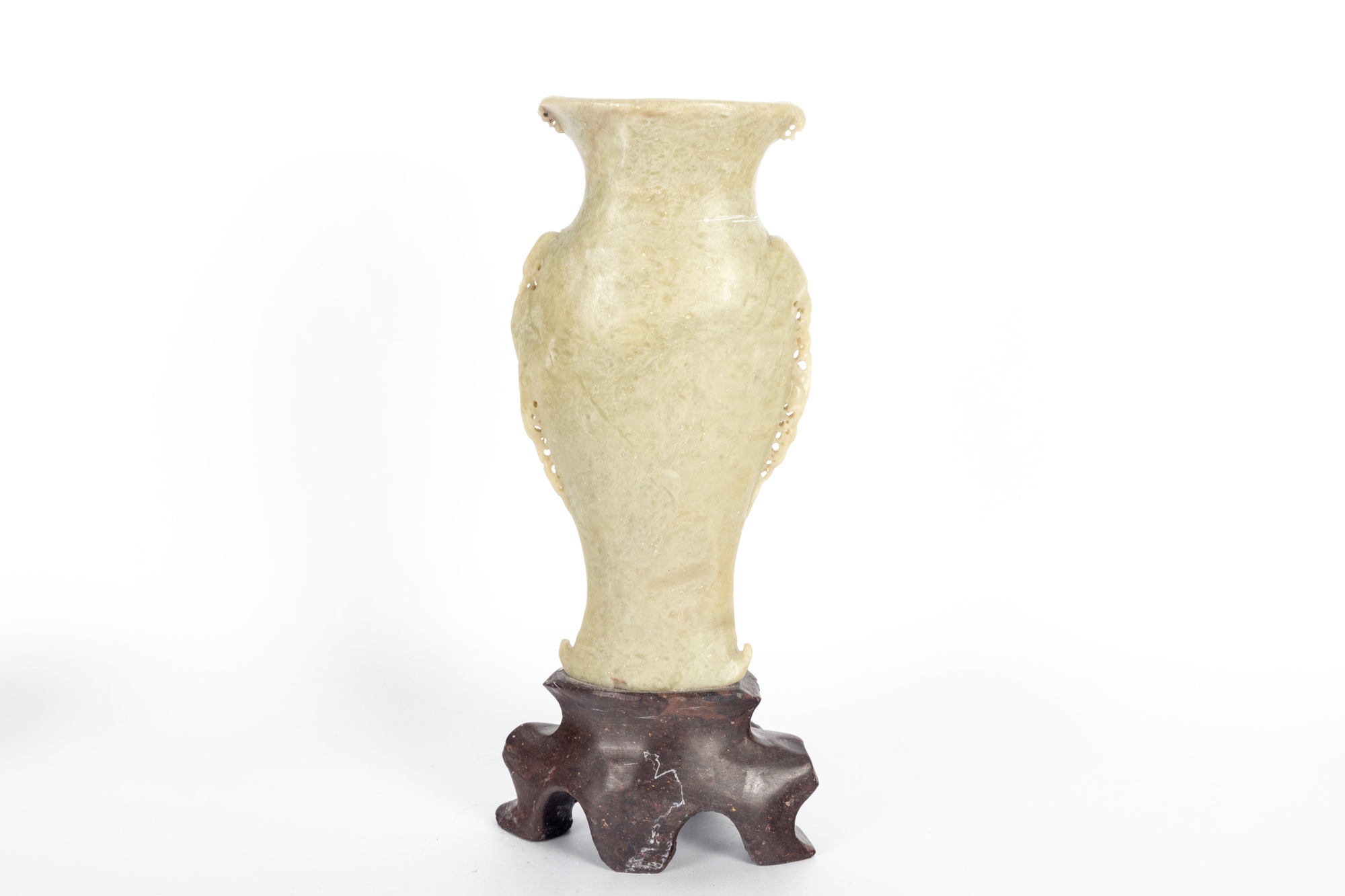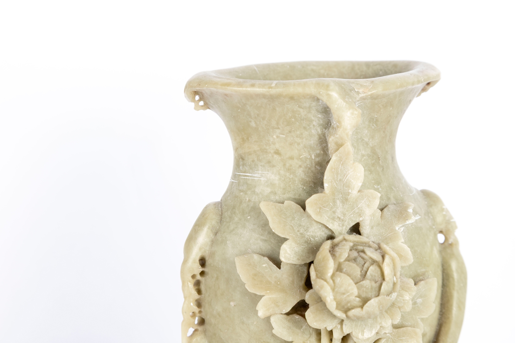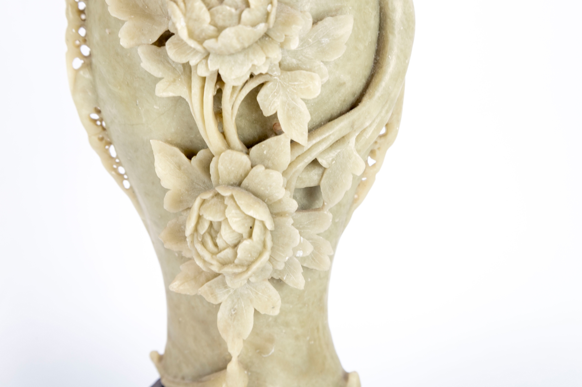 A handsome Chinese soapstone vase with a soft green and cream hue, meticulously carved with a shaped rim and baluster body elegantly tapering to the foot. The vase is carved with two large peony flowers down the center on a branch winding around the side. The vase leads to a dark brown carved stone base with similarly pierced details.