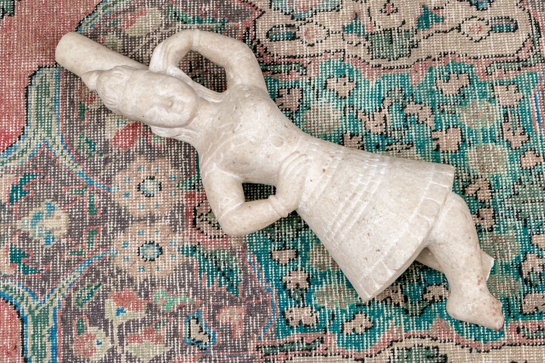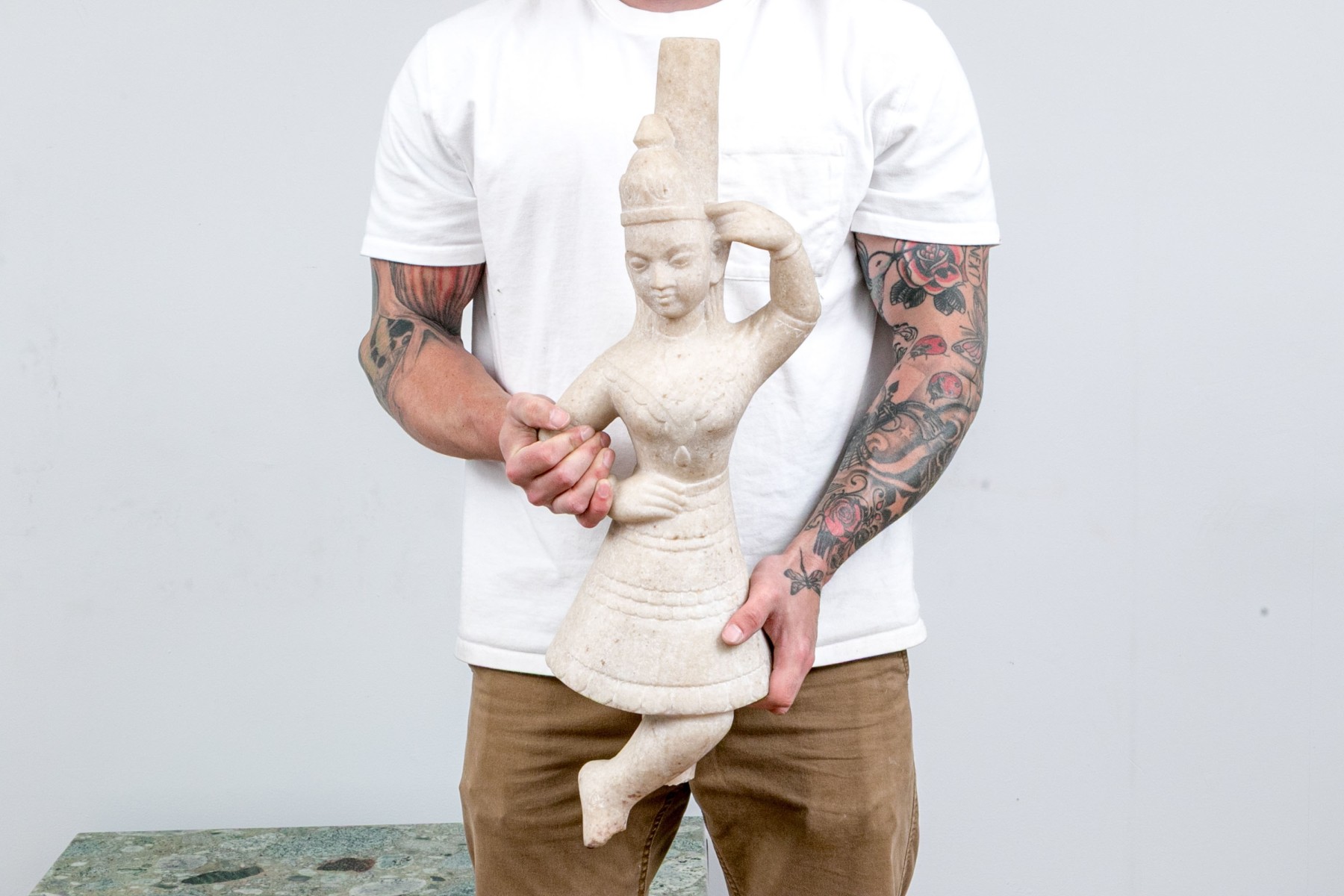 A beautifully carved Southeast Asian stone figure of a dancer posed with one hand on her hip and the other raised to point at her hat, wearing a scalloped yoke and skirt.