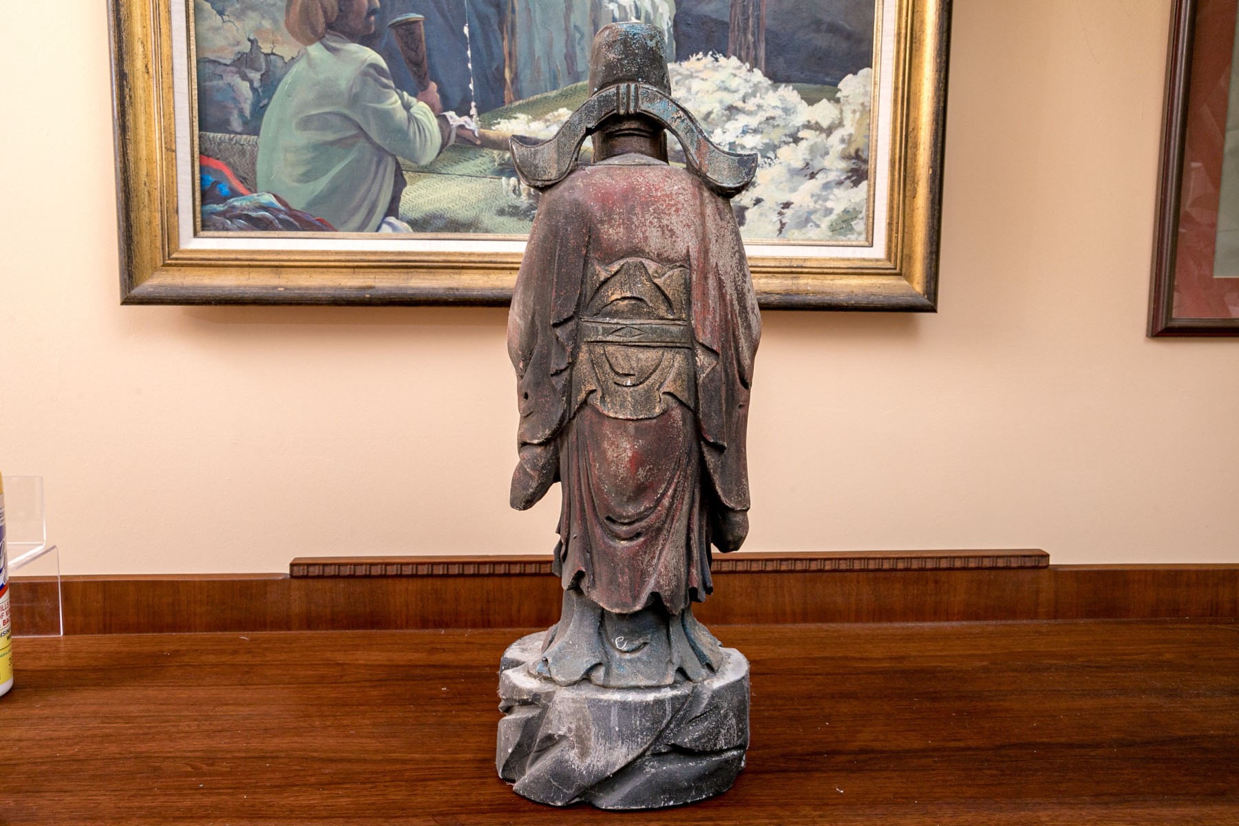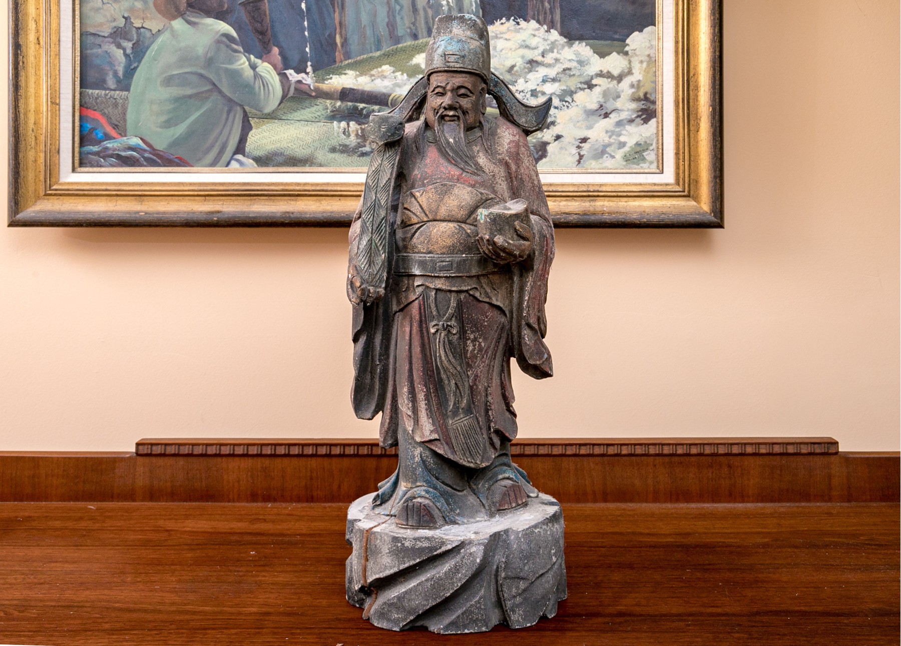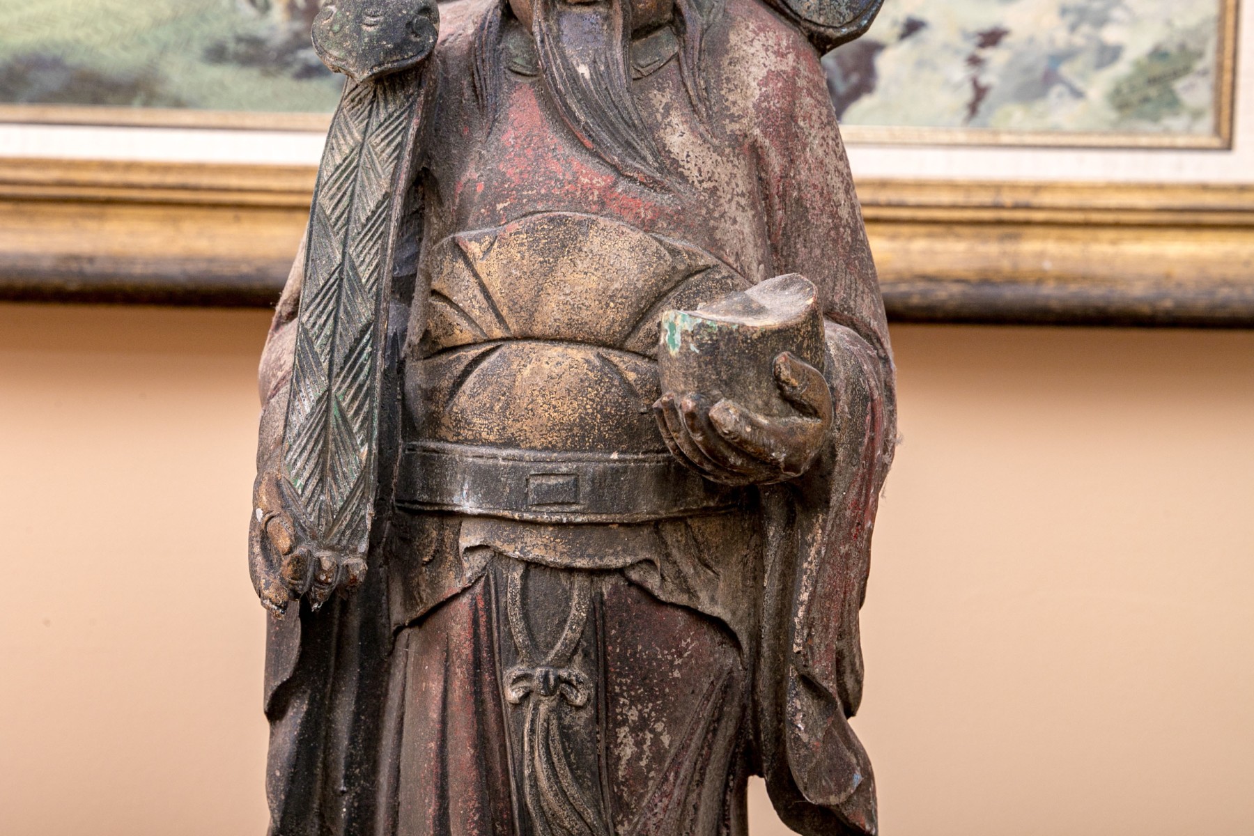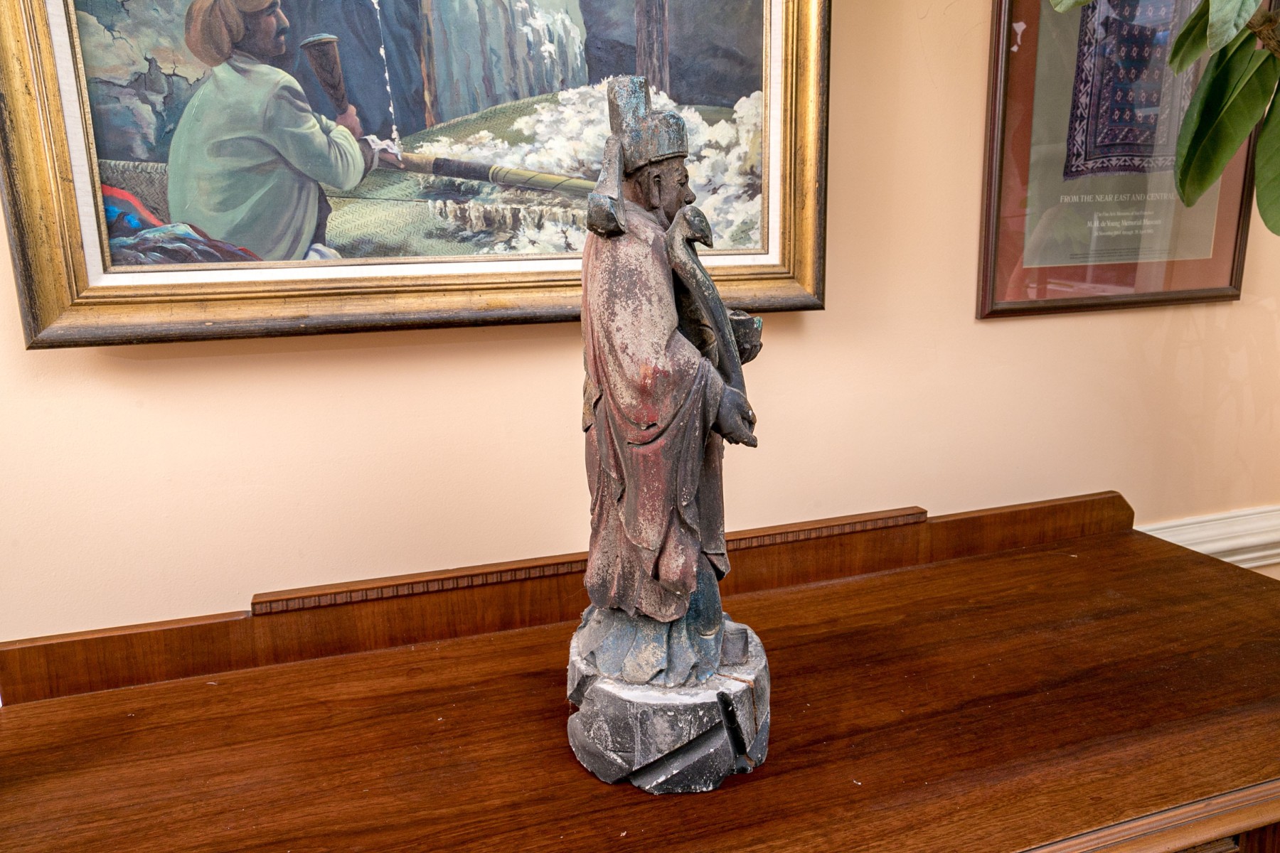 A nicely aged, tall carved and painted wood sculpture depicting the Chinese God of Fortune Lu. He holds a ruyi scepter in one hand and a sycee in the other.