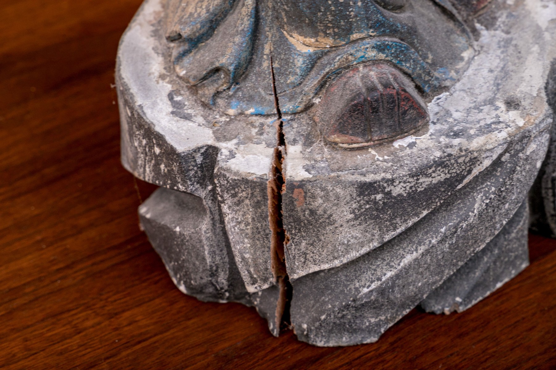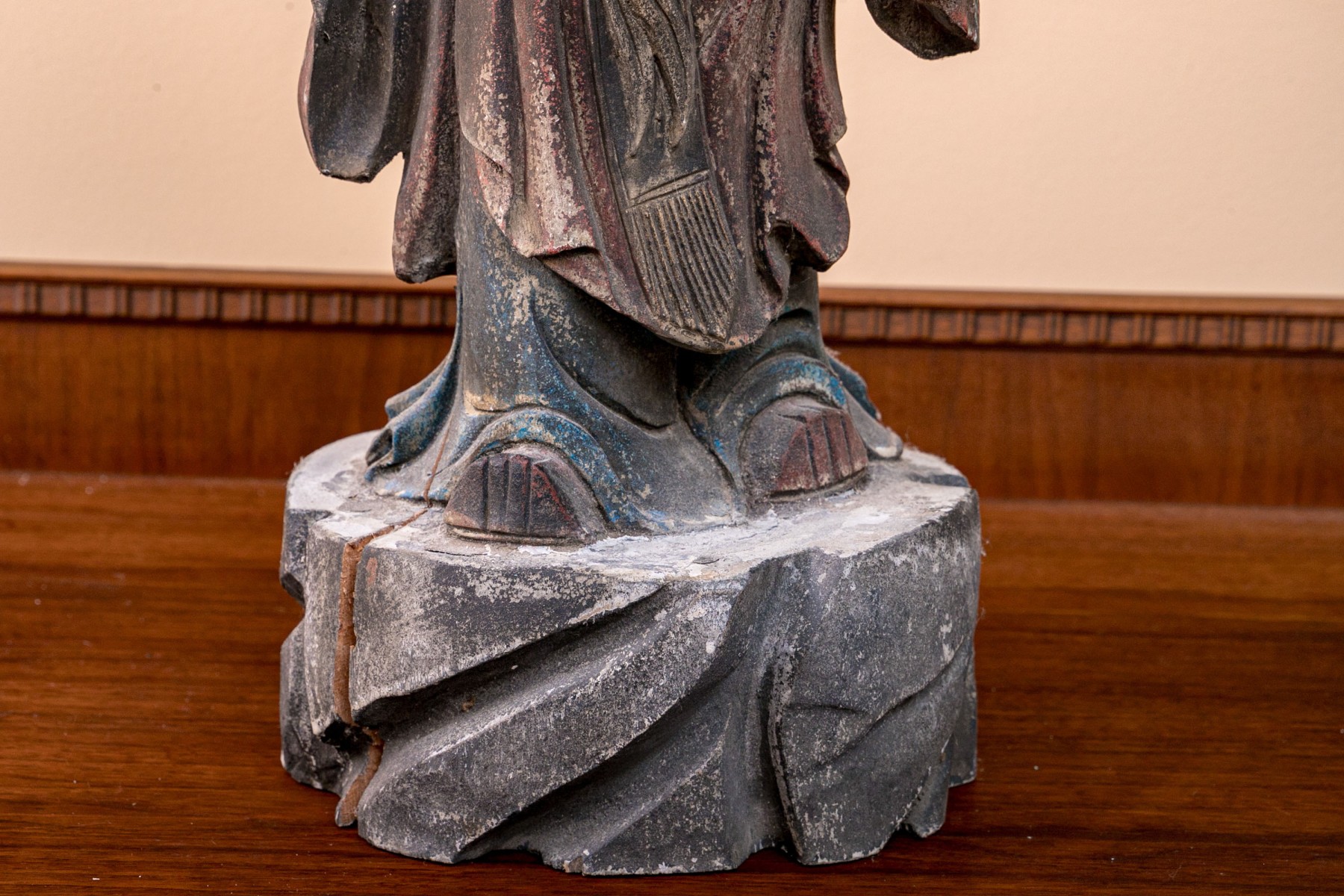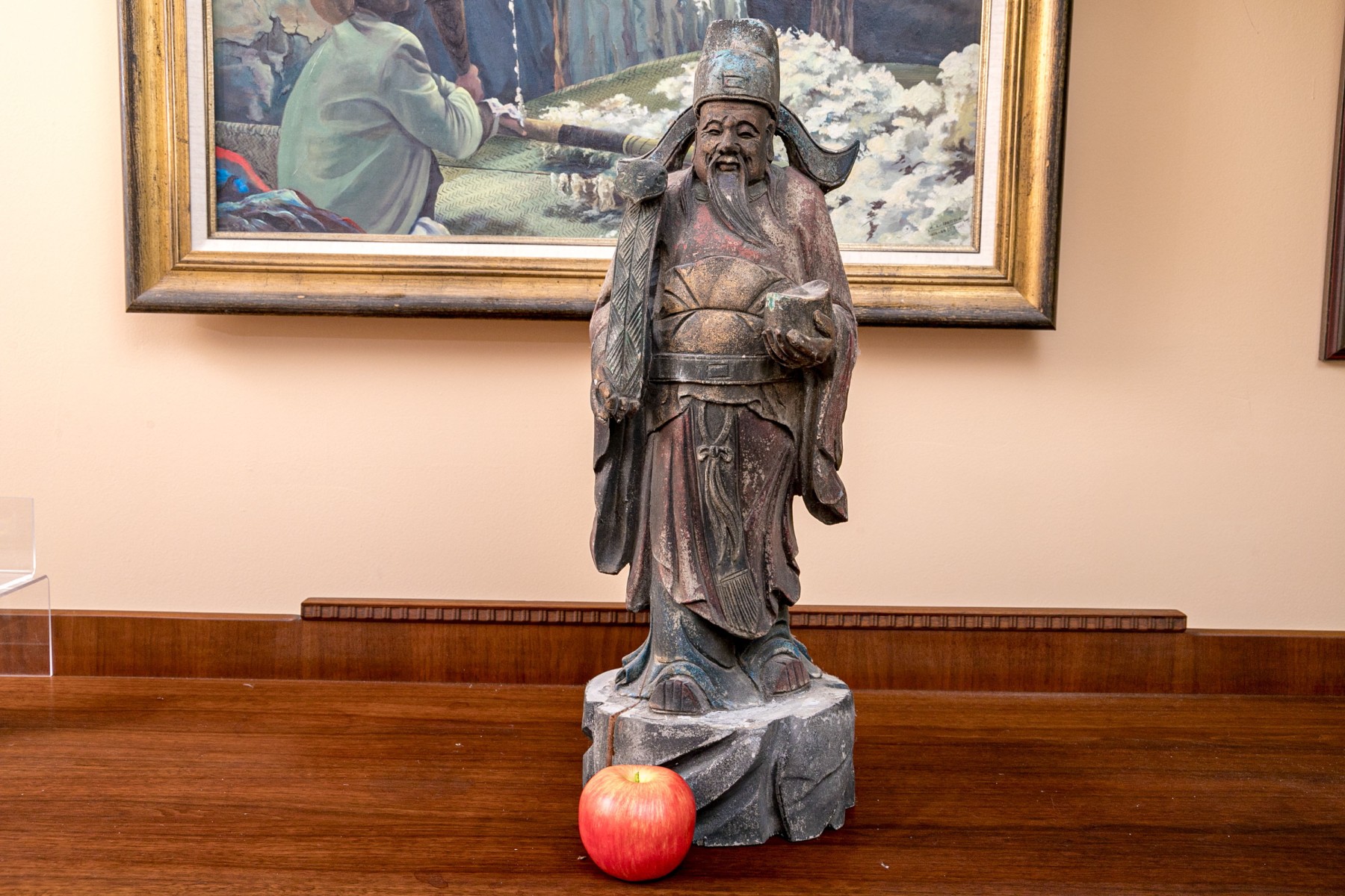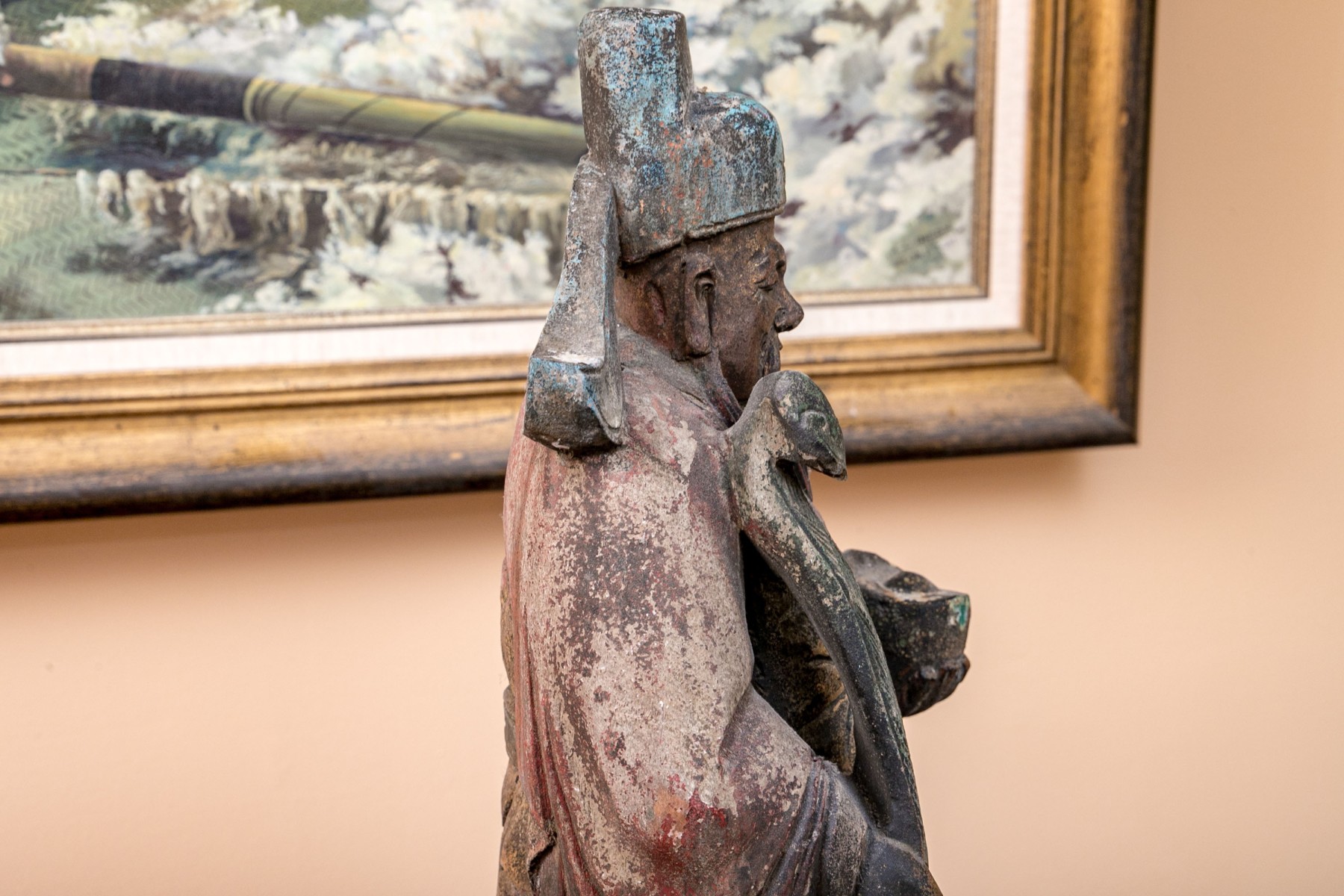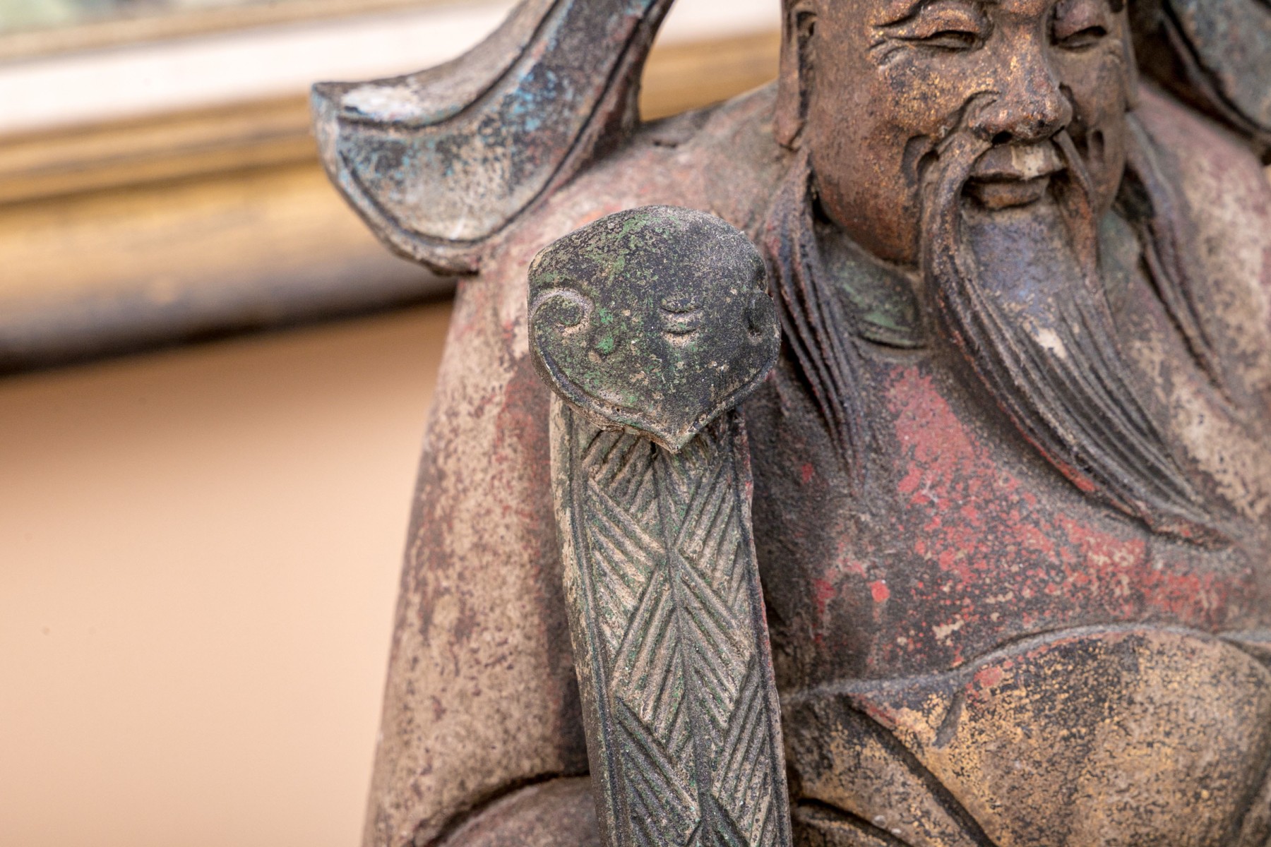 A nicely aged, tall carved and painted wood sculpture depicting the Chinese God of Fortune Lu. He holds a ruyi scepter in one hand and a sycee in the other.