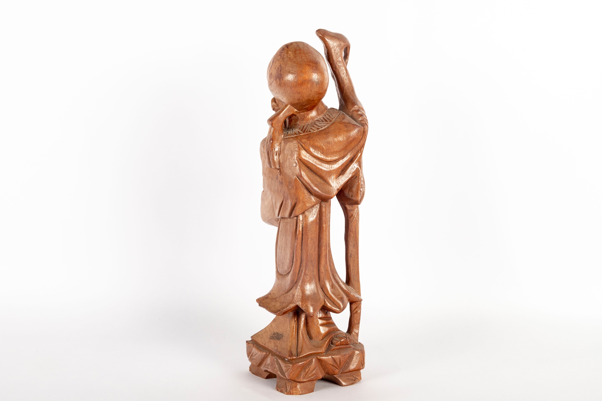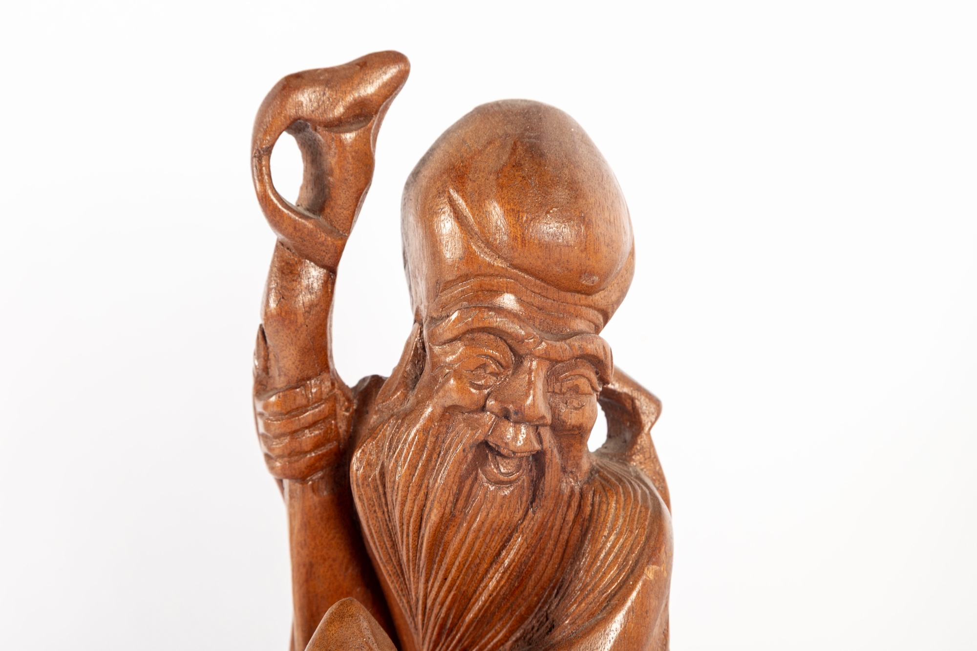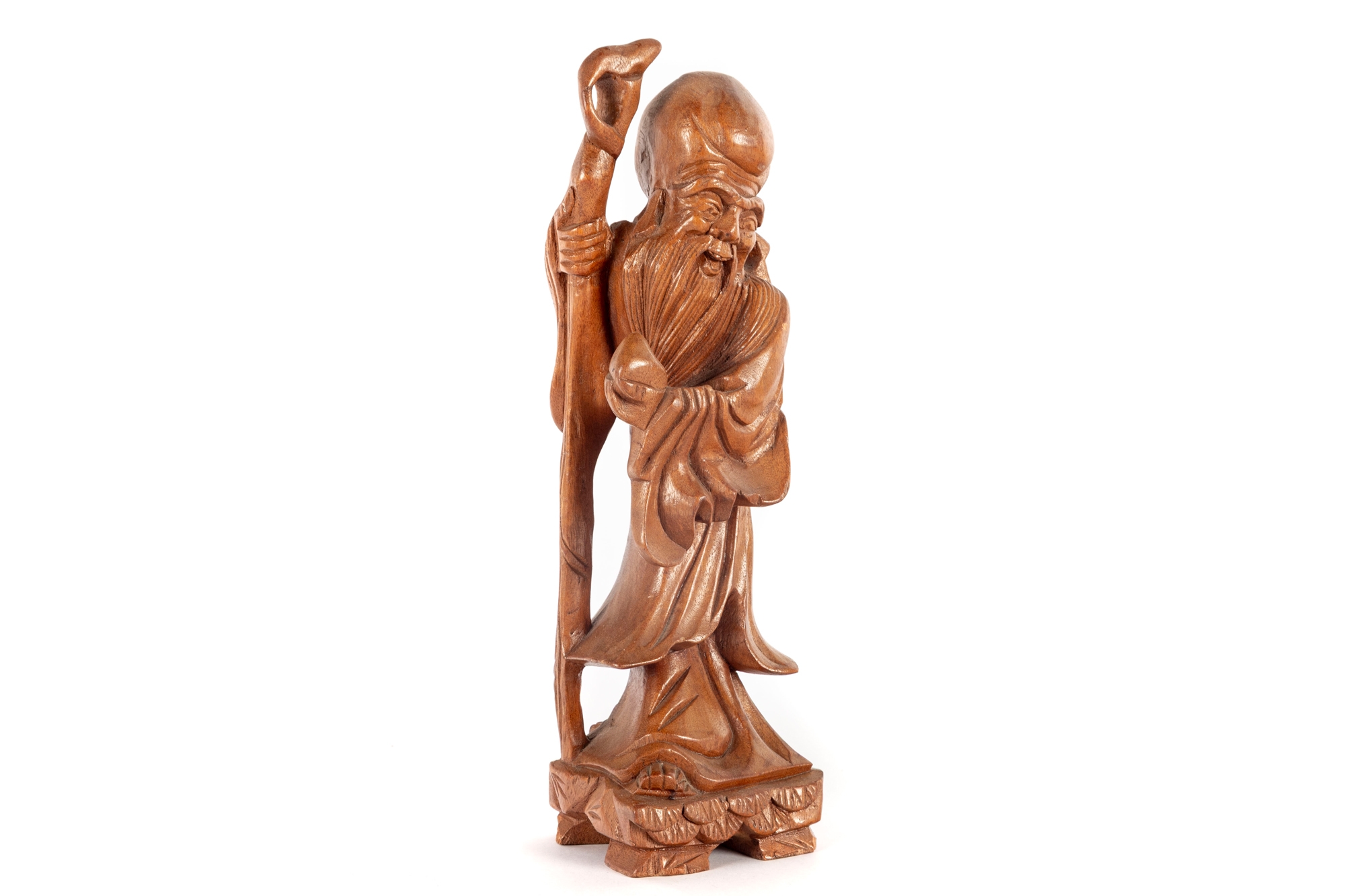 A finely carved wooden figure depicting Shou Lao, the Chinese god of longevity, characterized by his high domed forehead and flowing beard.