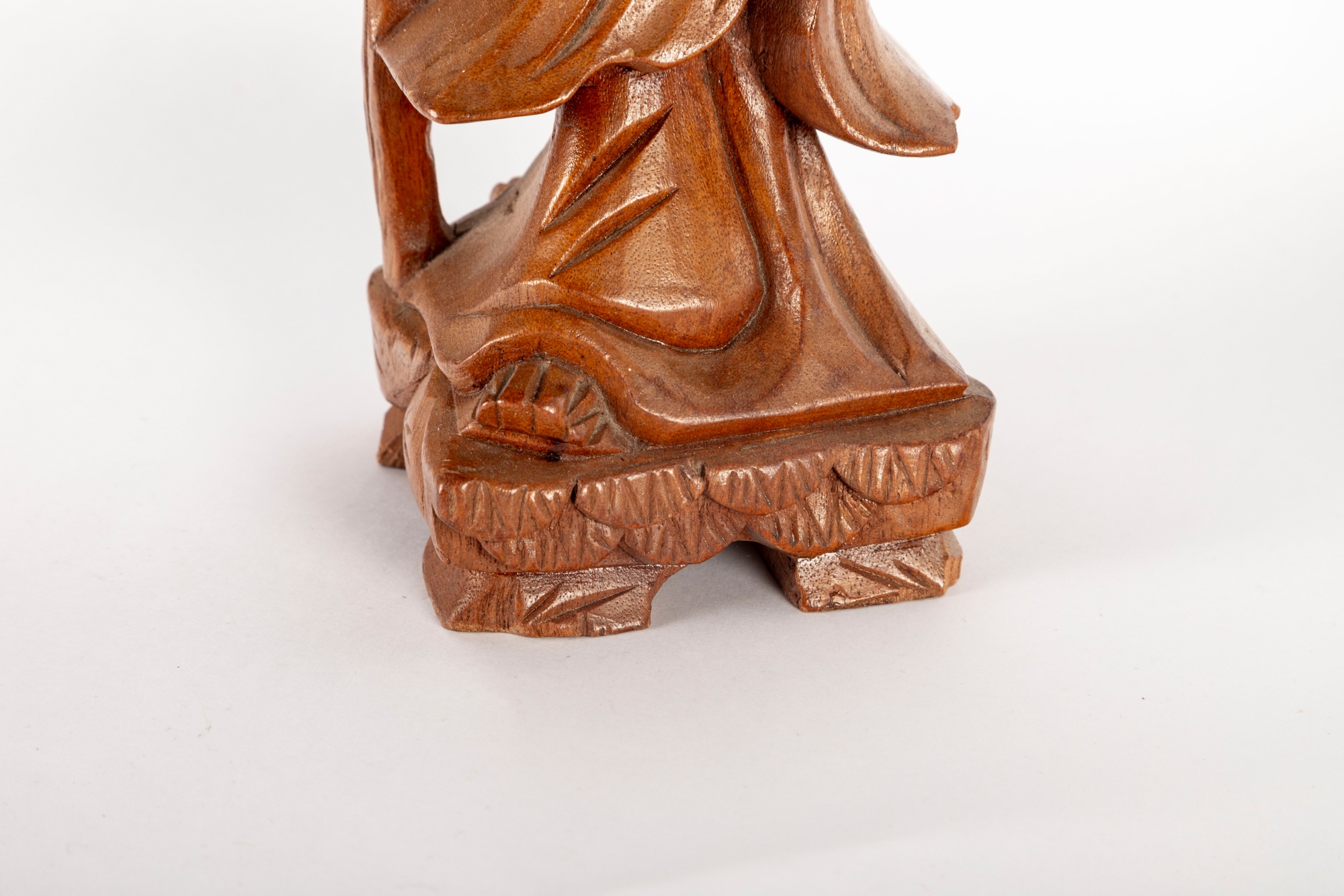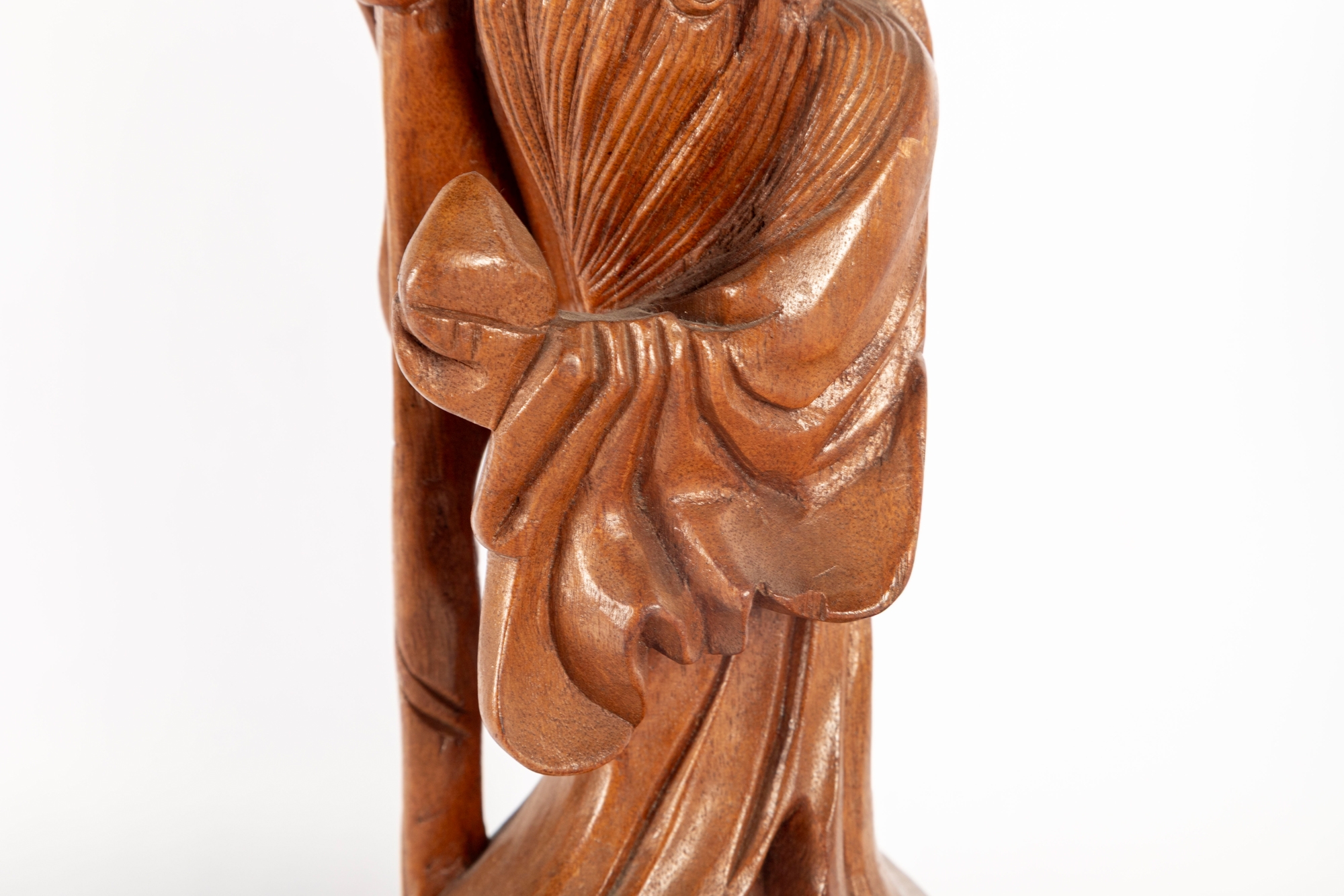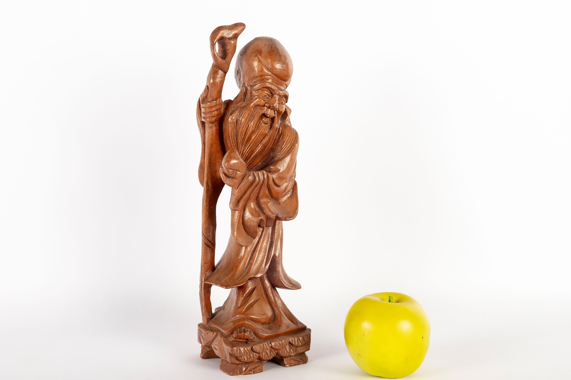 A finely carved wooden figure depicting Shou Lao, the Chinese god of longevity, characterized by his high domed forehead and flowing beard.