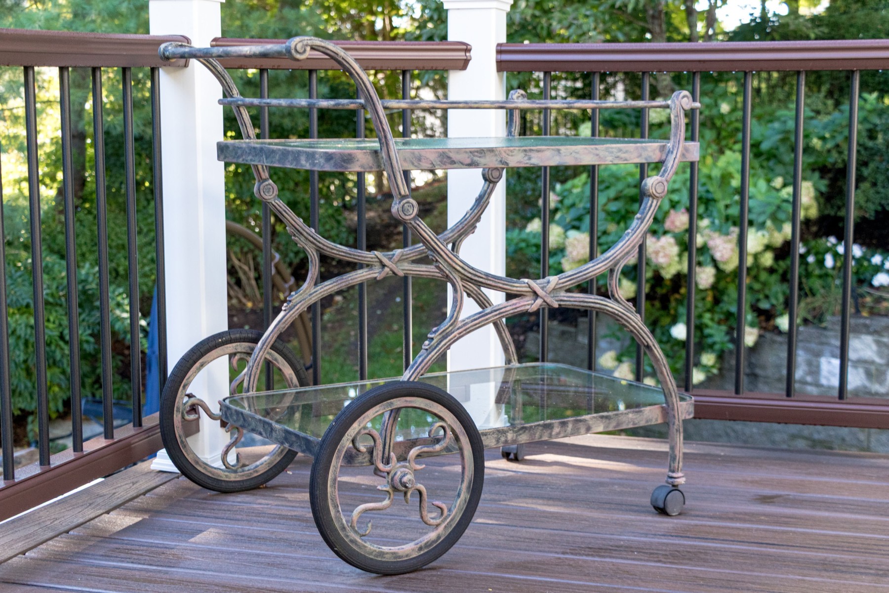 A gorgeous Cast Classics outdoor bar cart with great neoclassical flair sporting a stately curule form. The bar cart features two glass tiers and a nicely patina finished frame with a handle to one ide and a tall open gallery around the top supported by curved X-supports down the sides. Raised over large back wheels and smaller front casters for easy mobility with great style.
