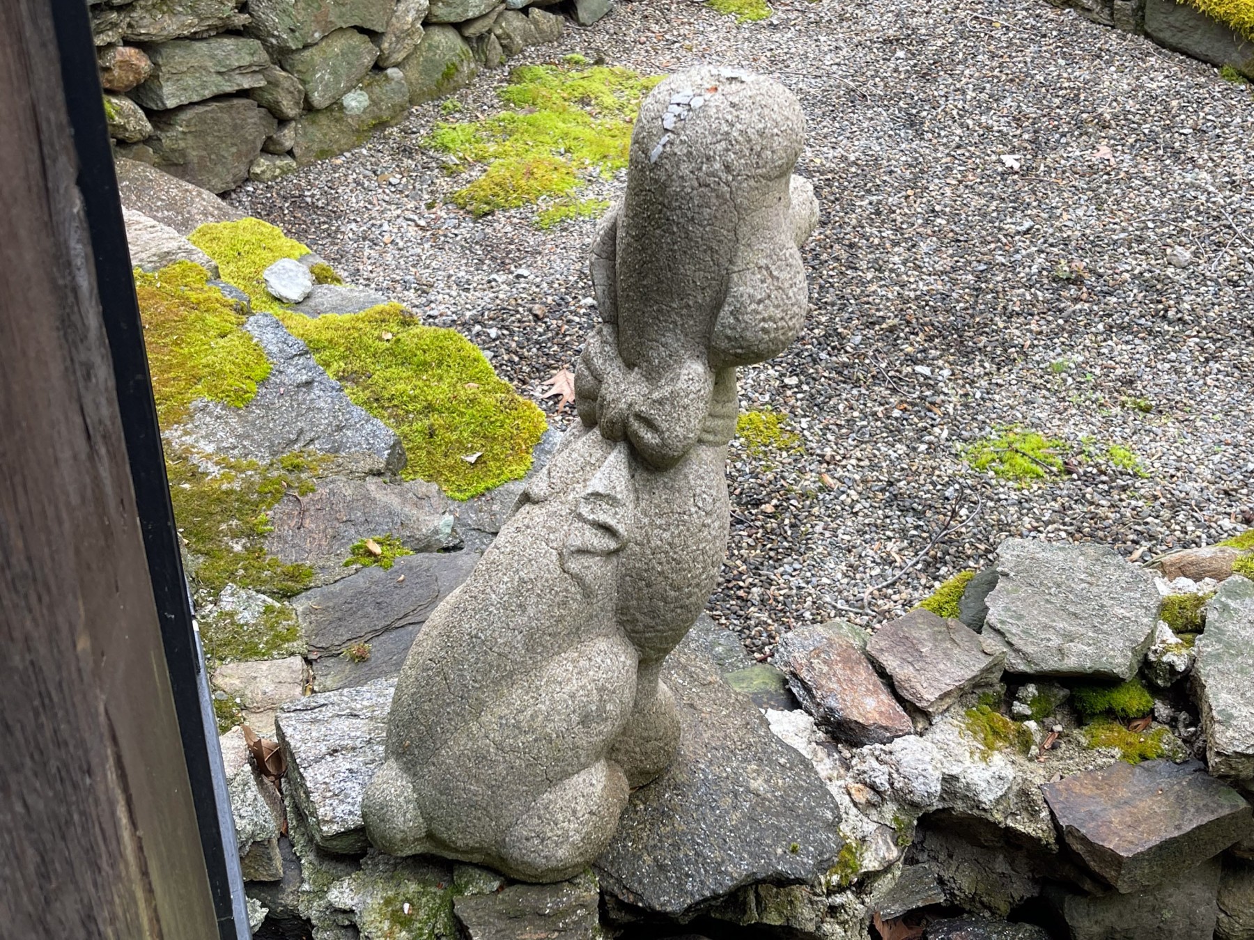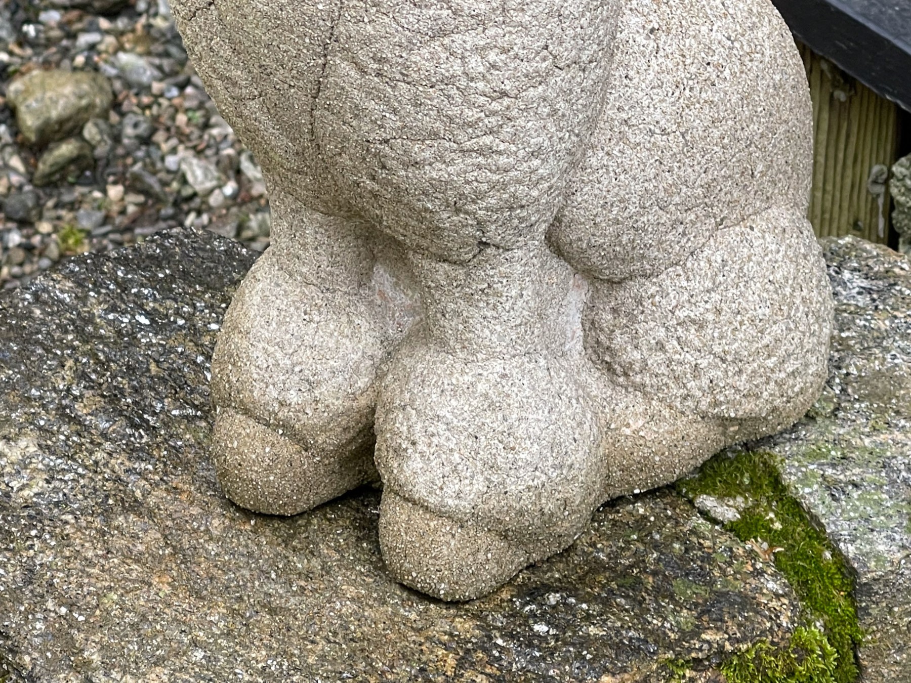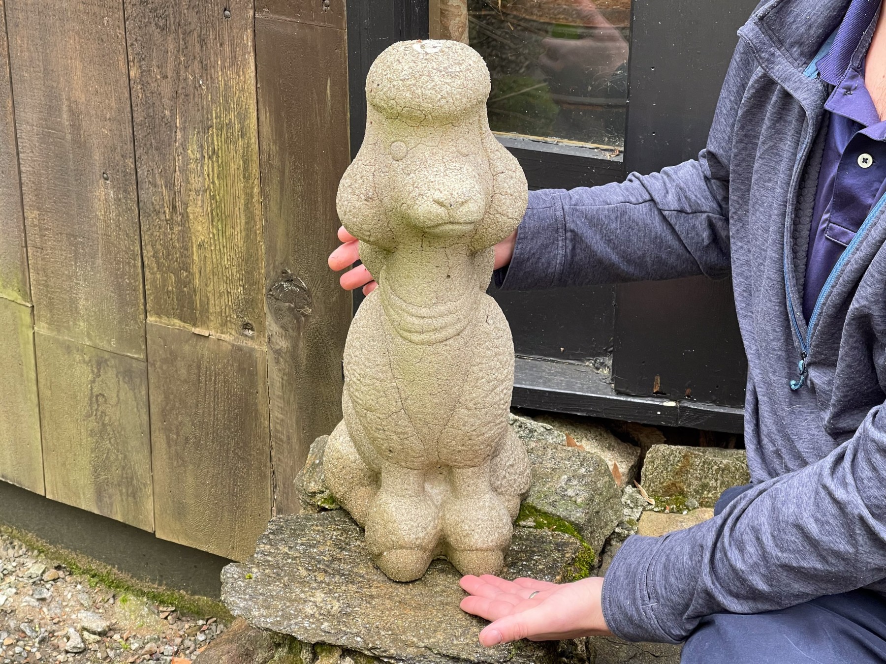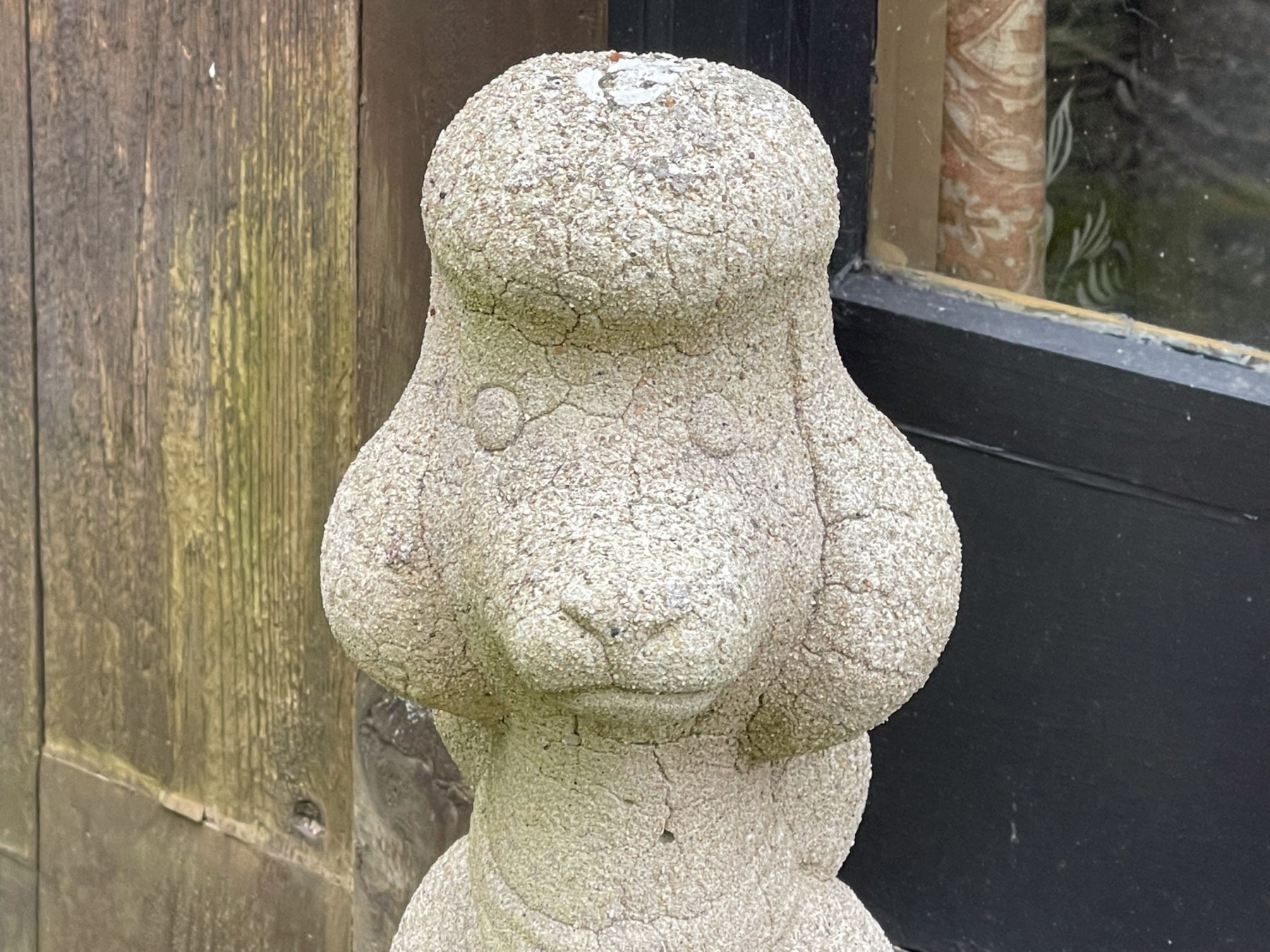 In seated position. Perfect for the dog lover, this outdoor poodle sculpture is absolutely adorable with a bow on her back.