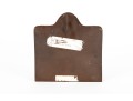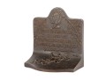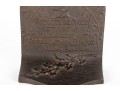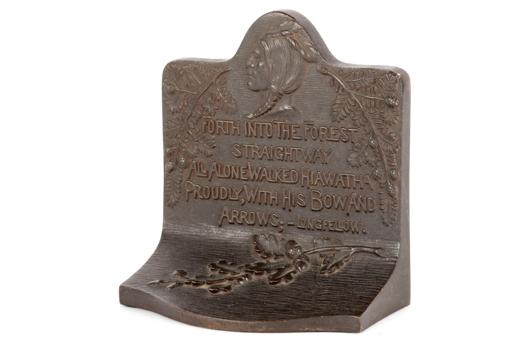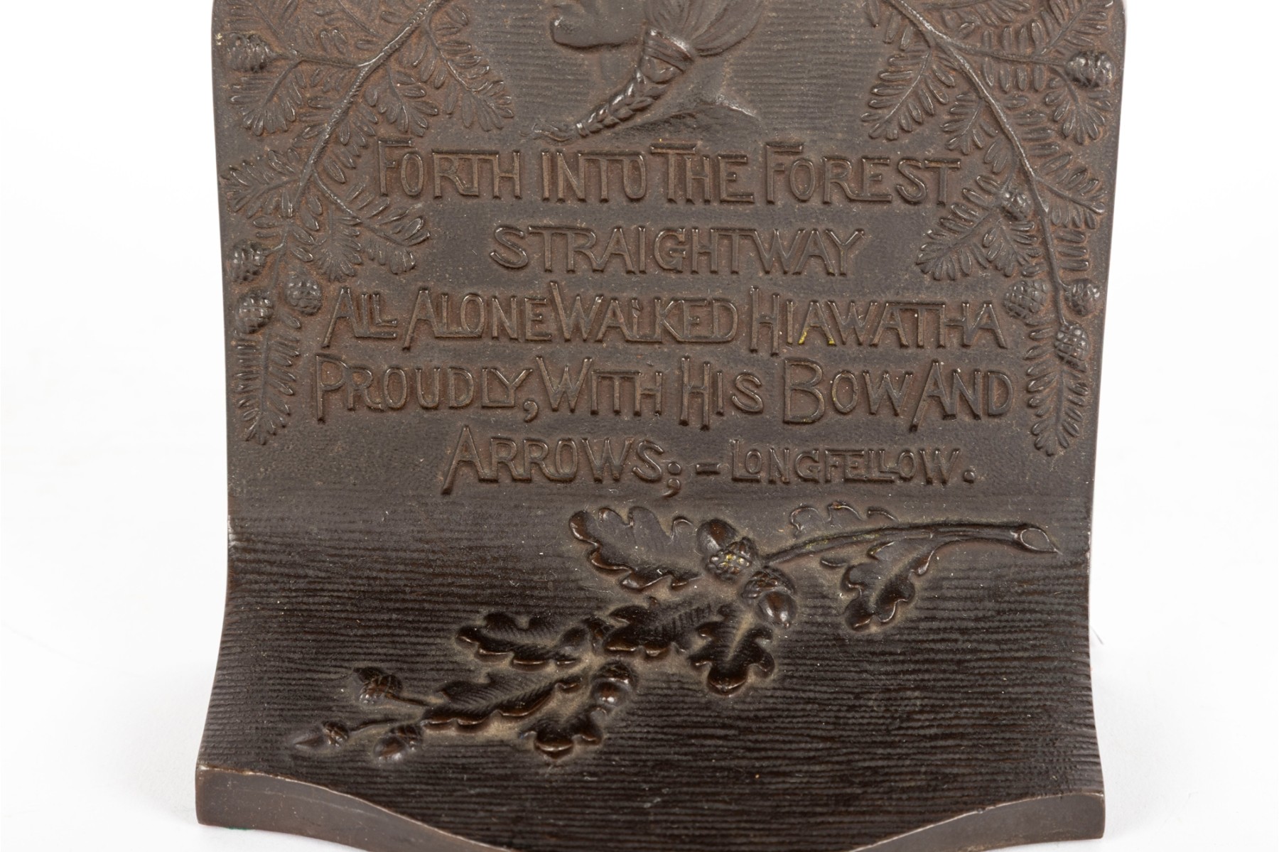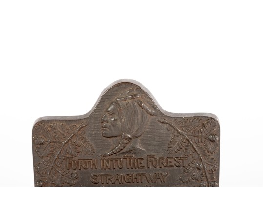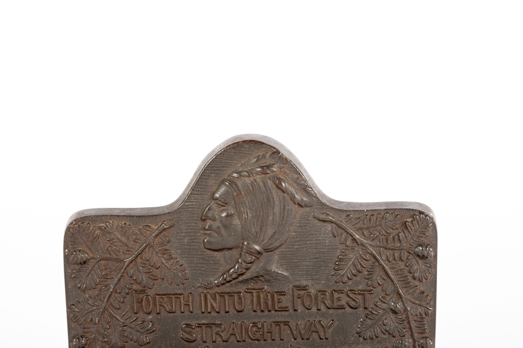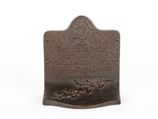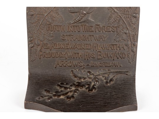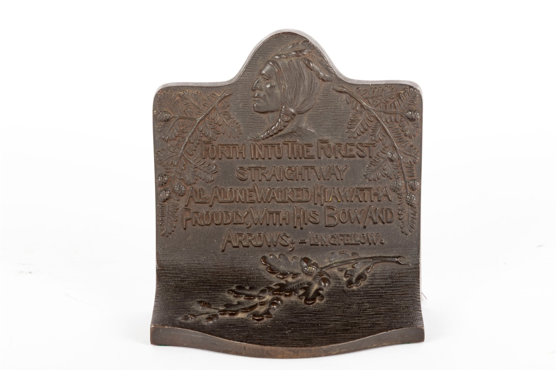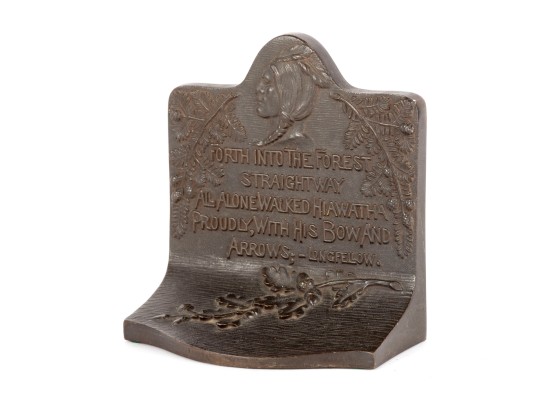 A vintage cast iron book end with a serpentine L-form with a Native American portrait in profile flanked by pine garlands around an excerpt of Longfellow's poem "The Song of Hiawatha" over an oak branch.