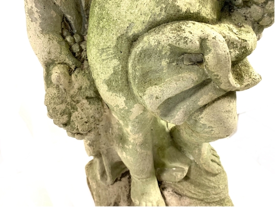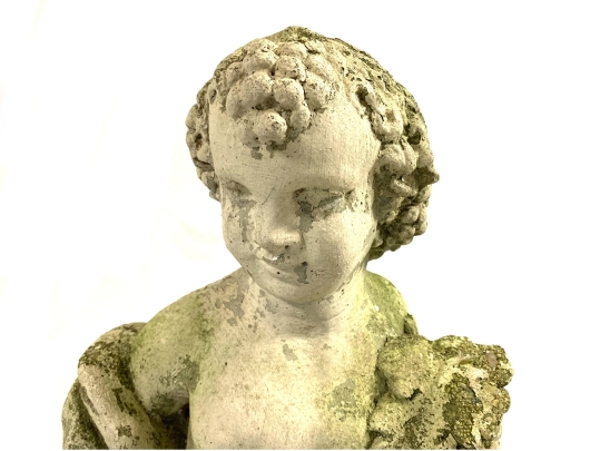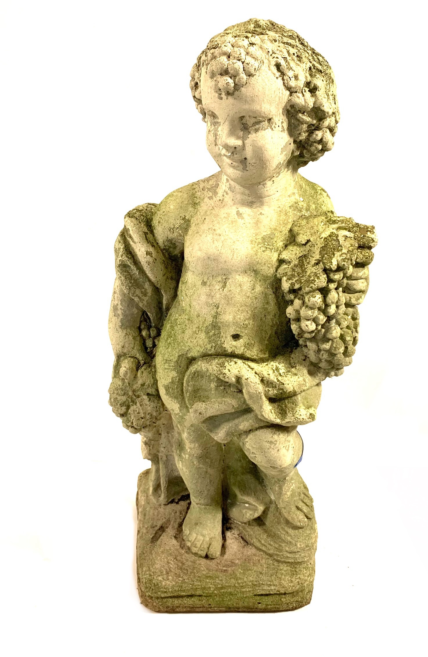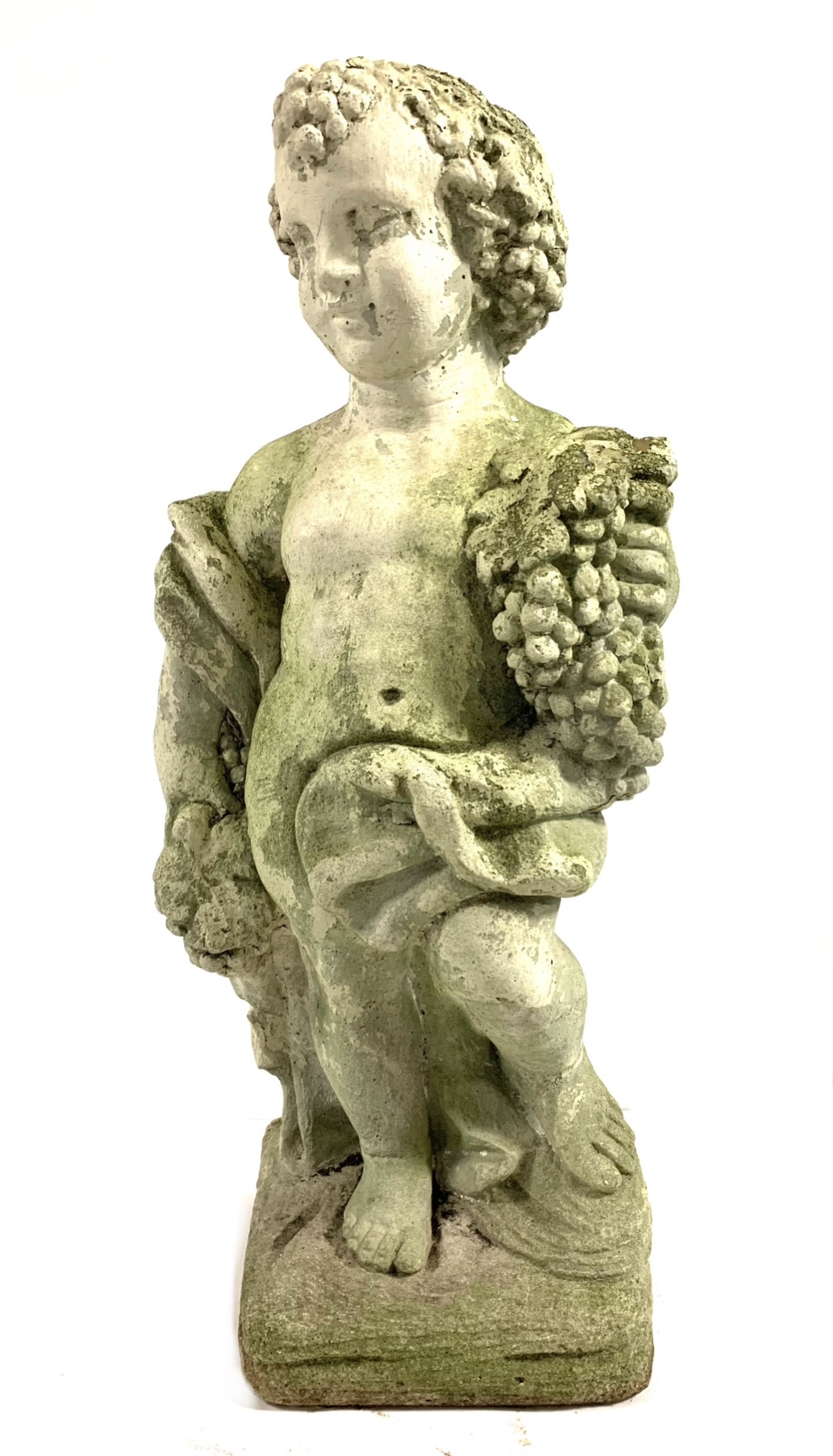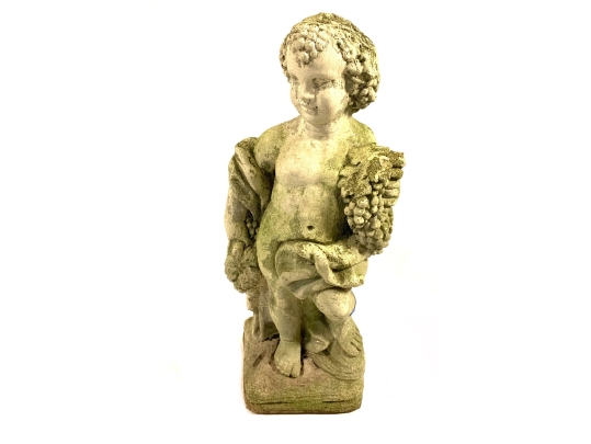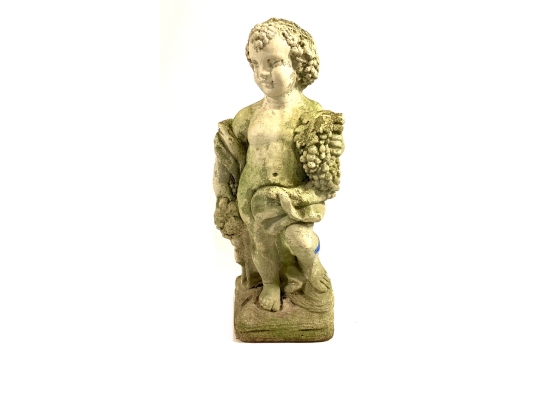 A cast stone cherub or putto garden statue depicting the figure holding a bunch of grapes reminiscent of Bacchus the Roman god of wine. The figure weathered with a verdigris hue and encrusted with lichen is standing atop a plinth base.