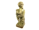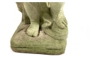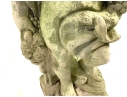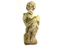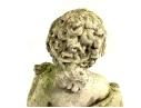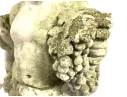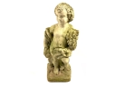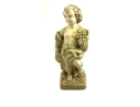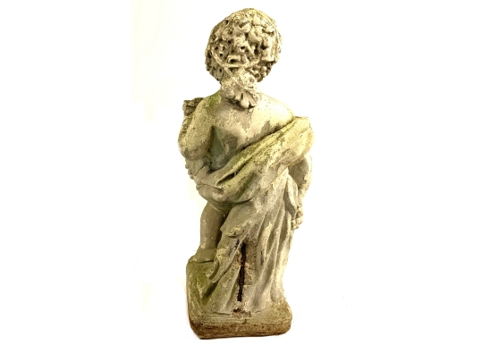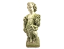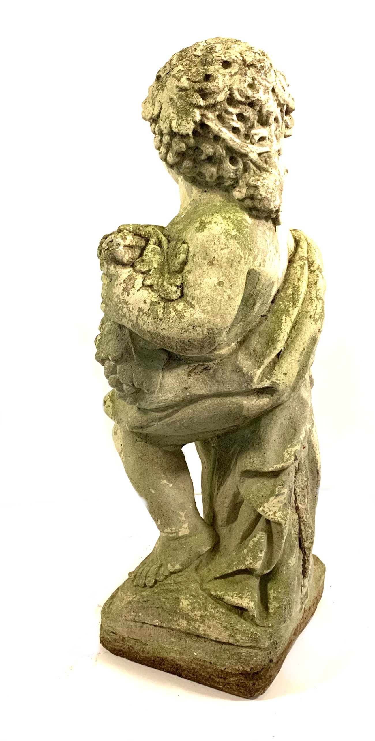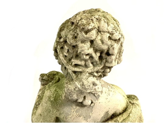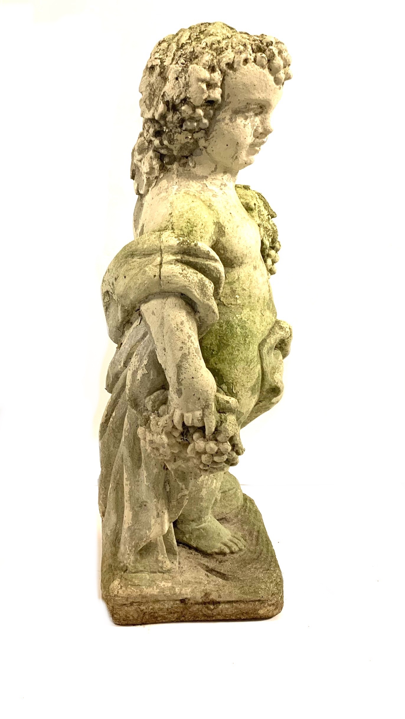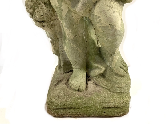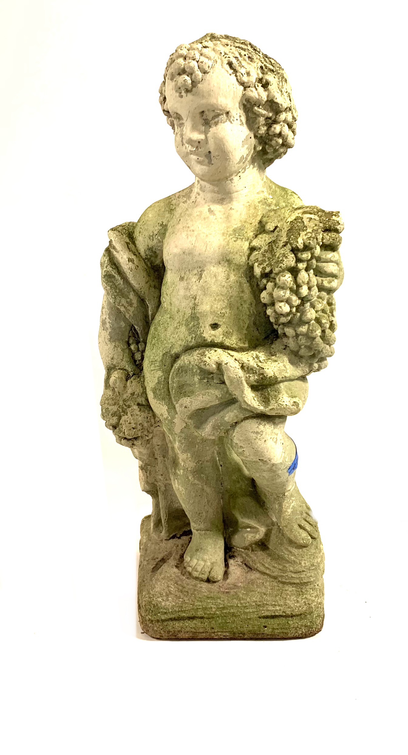 A cast stone cherub or putto garden statue depicting the figure holding a bunch of grapes reminiscent of Bacchus the Roman god of wine. The figure weathered with a verdigris hue and encrusted with lichen is standing atop a plinth base.