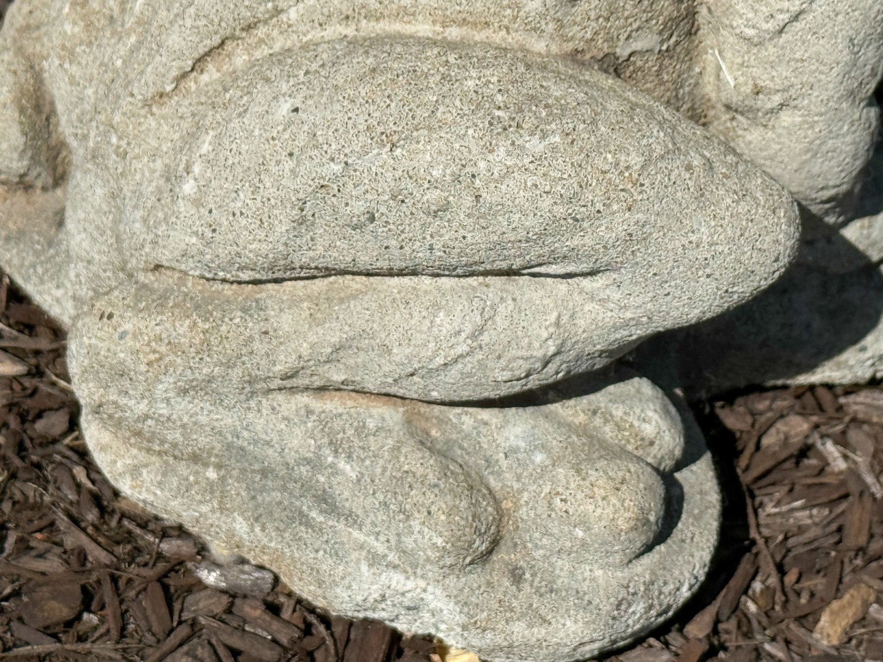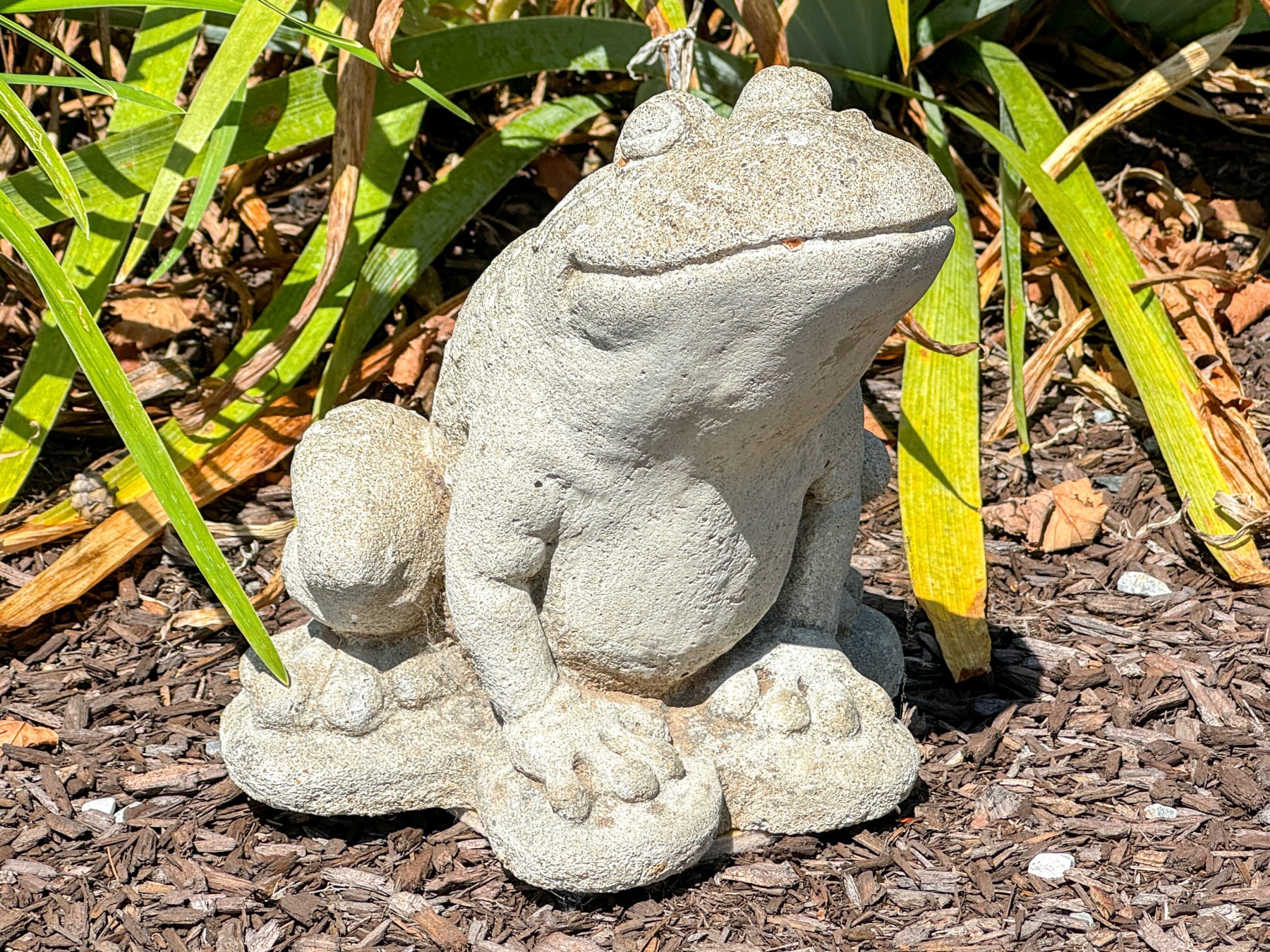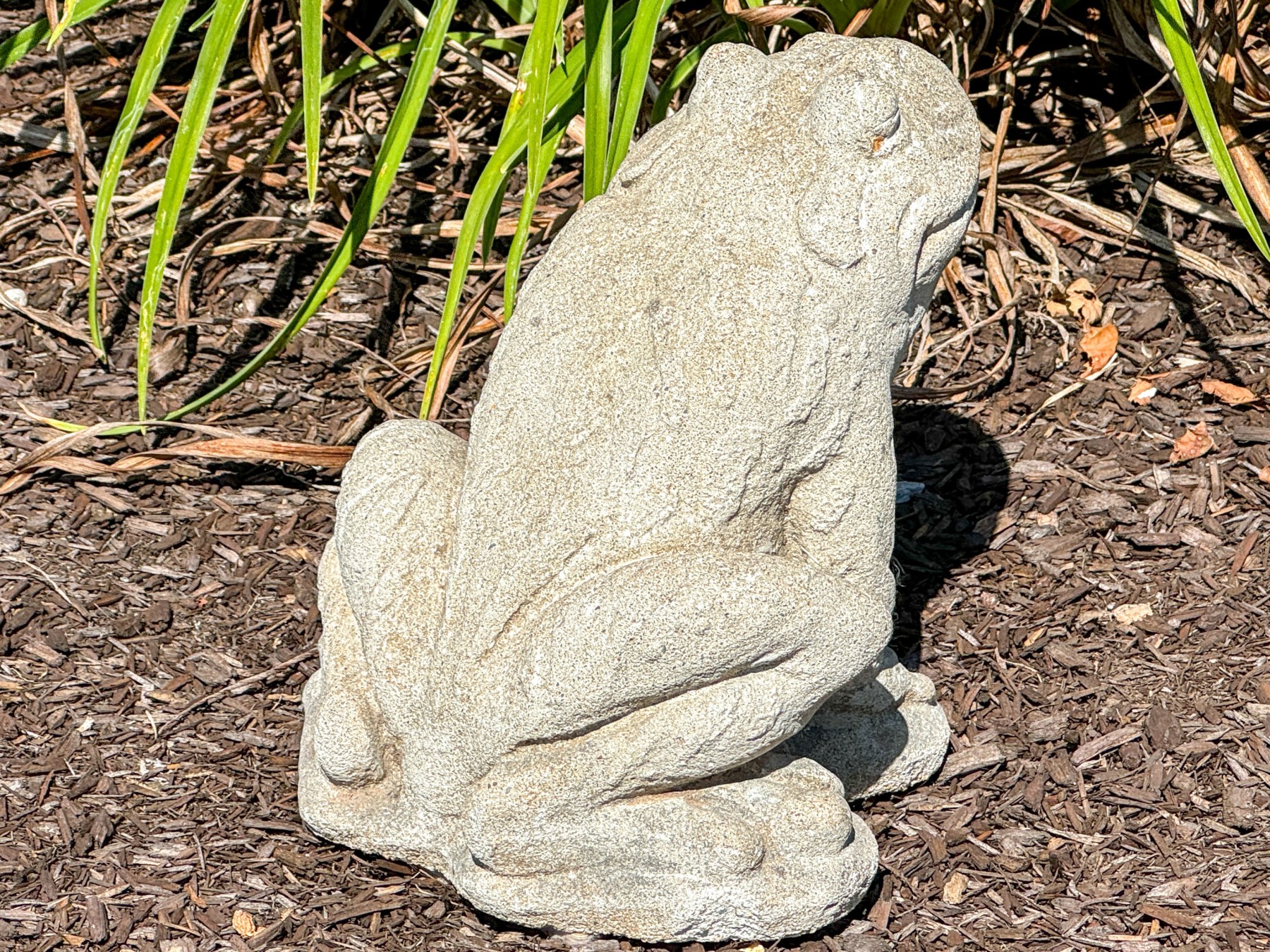 A wonderful cast stone garden statue depicting a frog with a peaceful expression sitting on a petaled base.