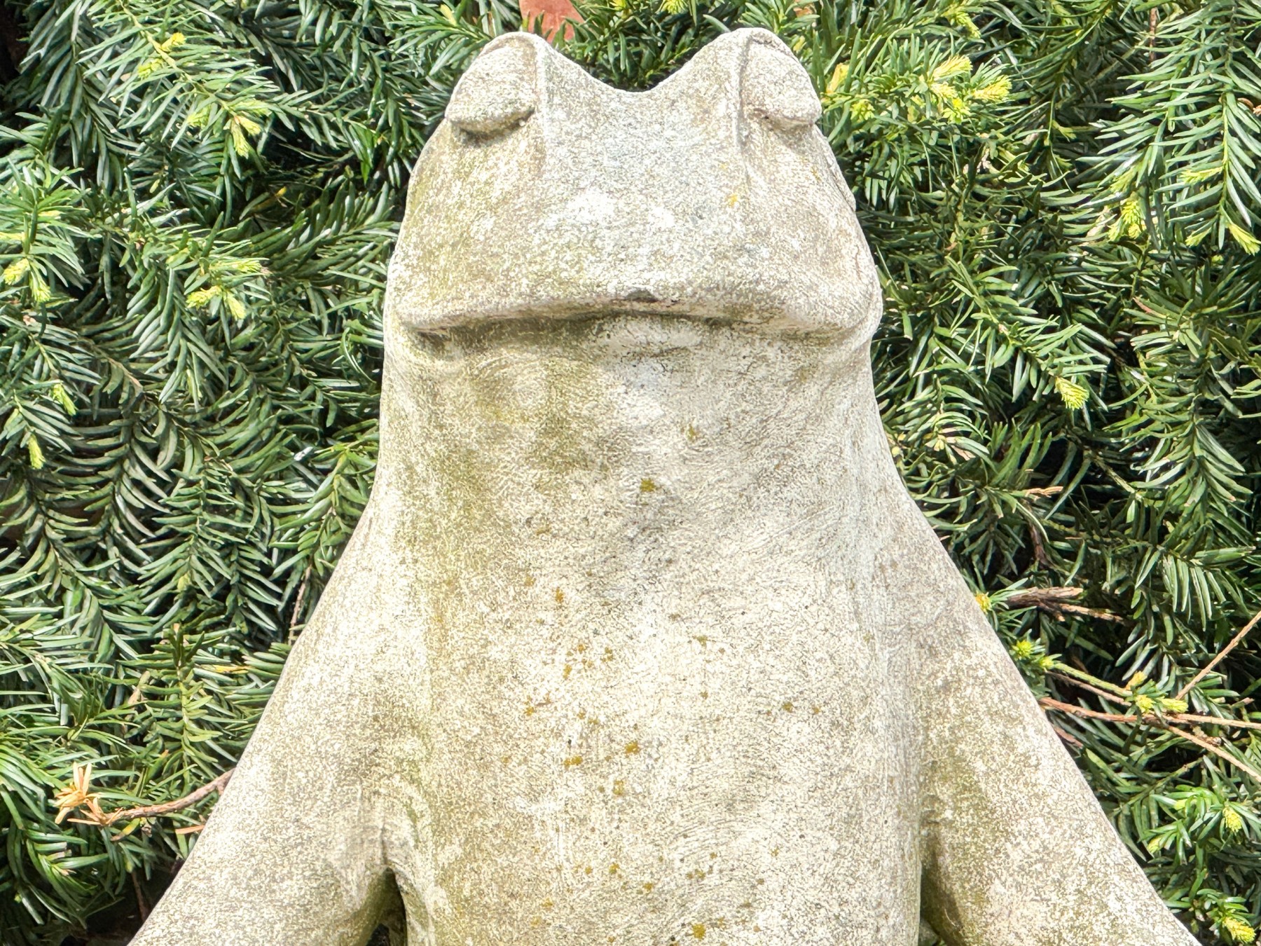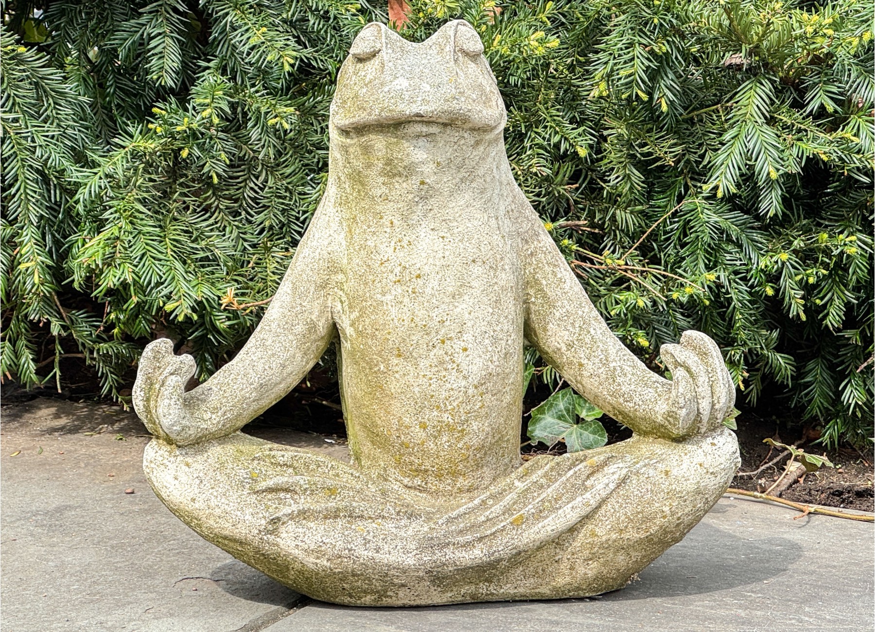 A delightful cast stone garden statue of a frog seated in a meditative cross-legged sukhasana pose.