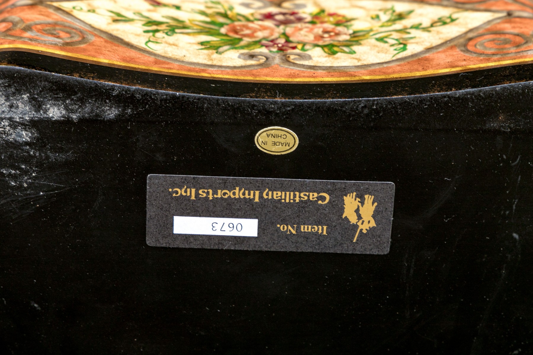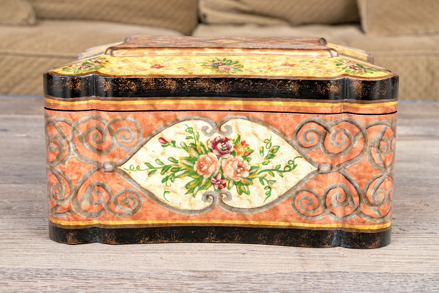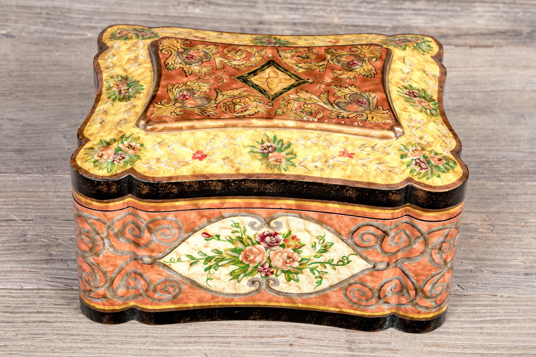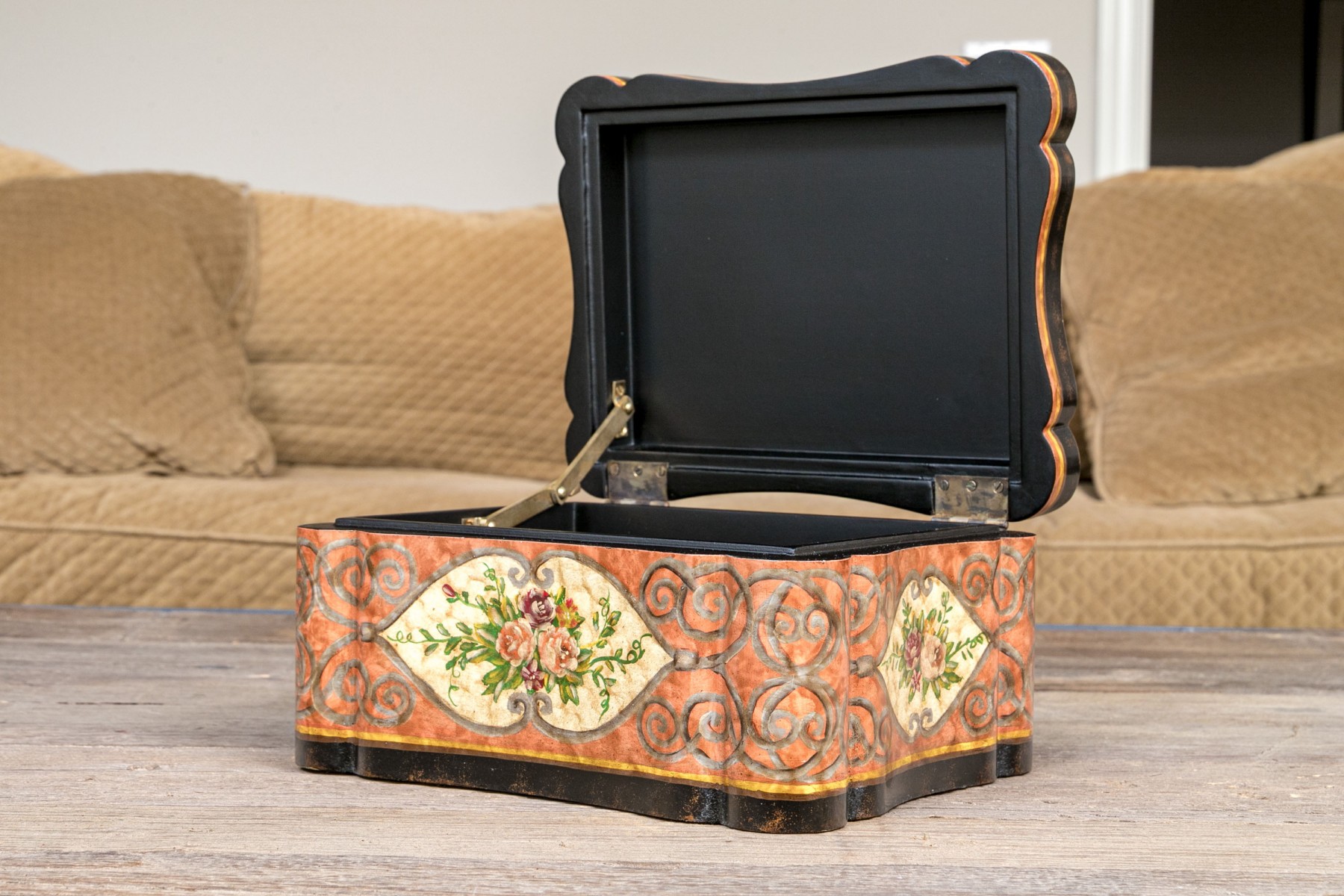 Hinged wood hand-painted box from Castilian Imports featuring floral medallions and all over floral and foliate motif with black interior.