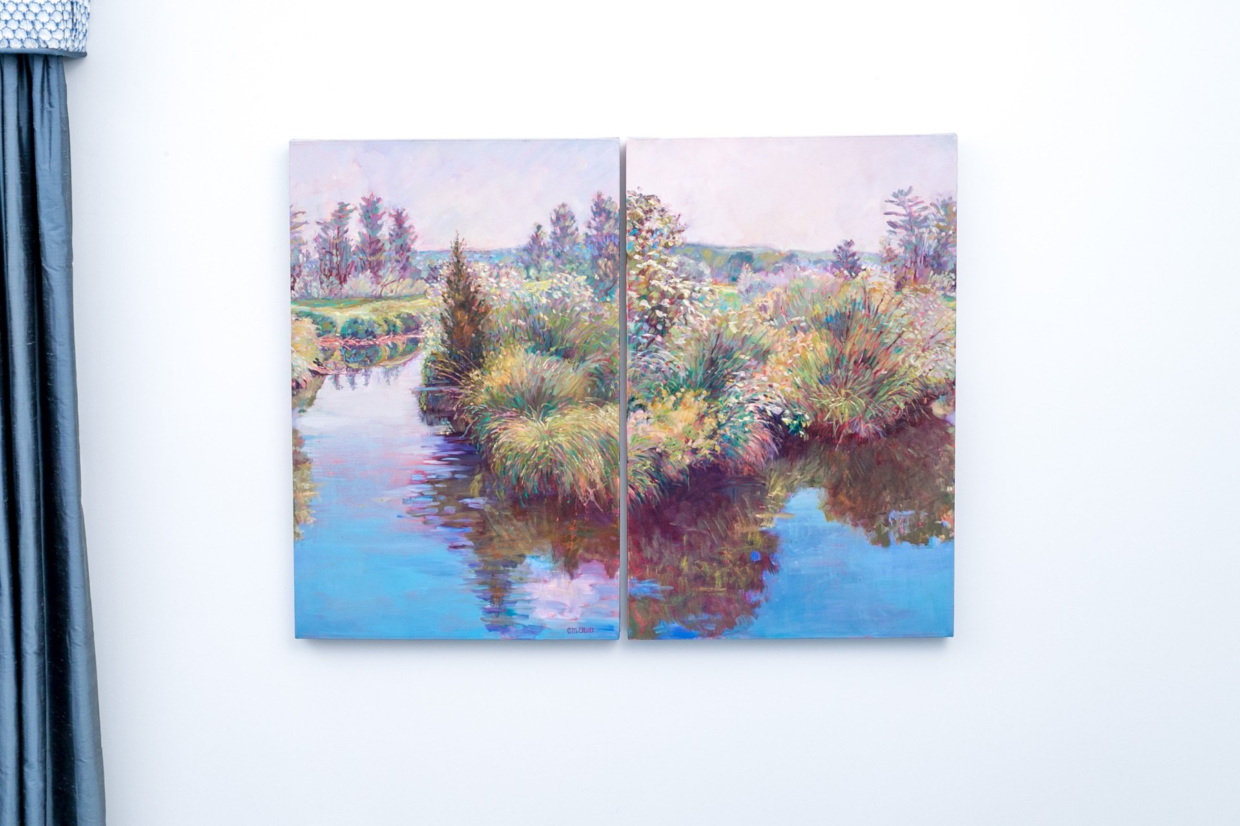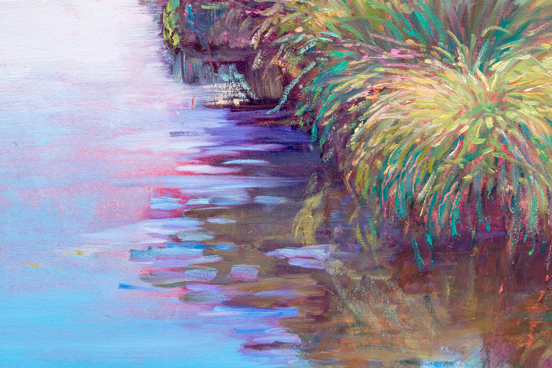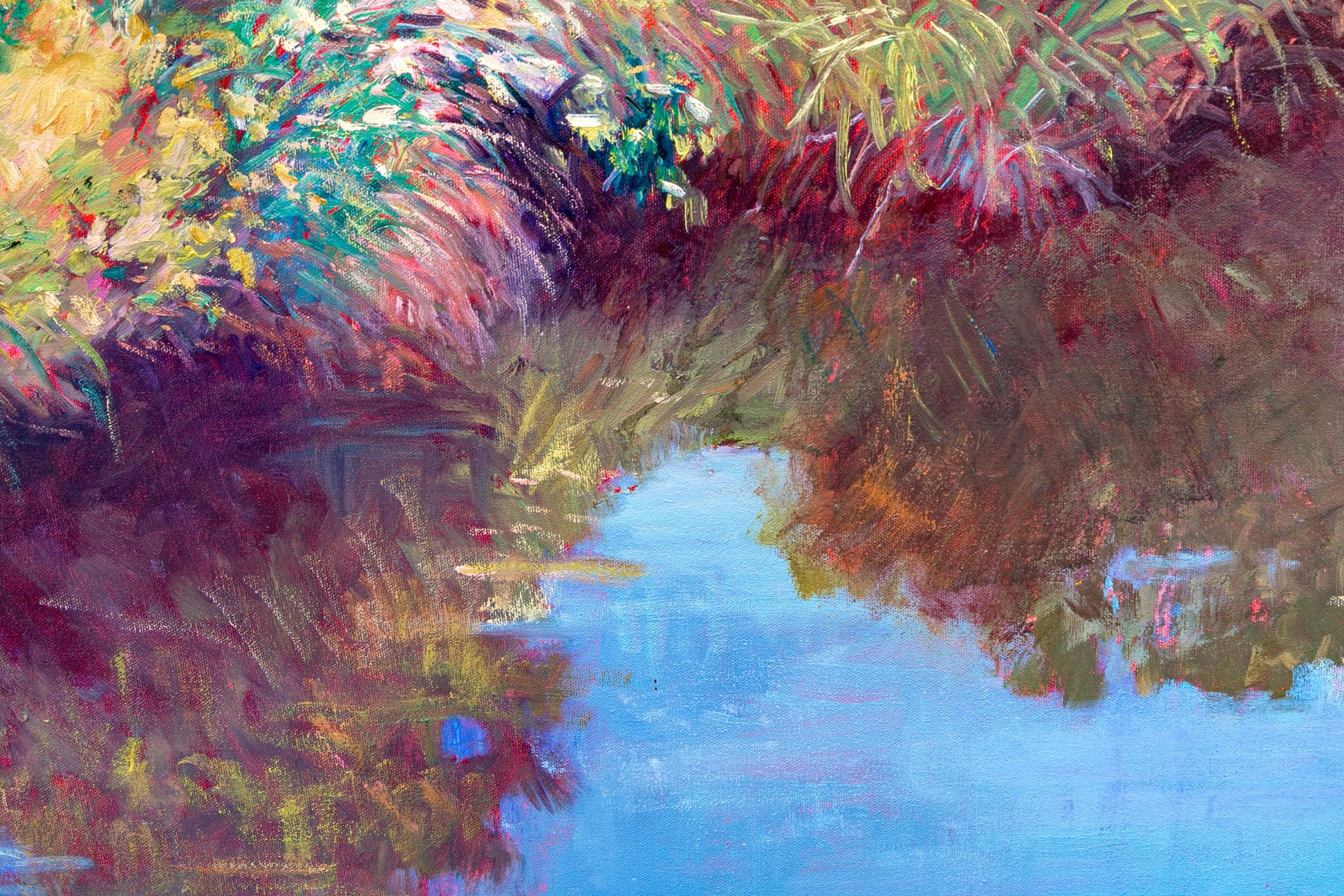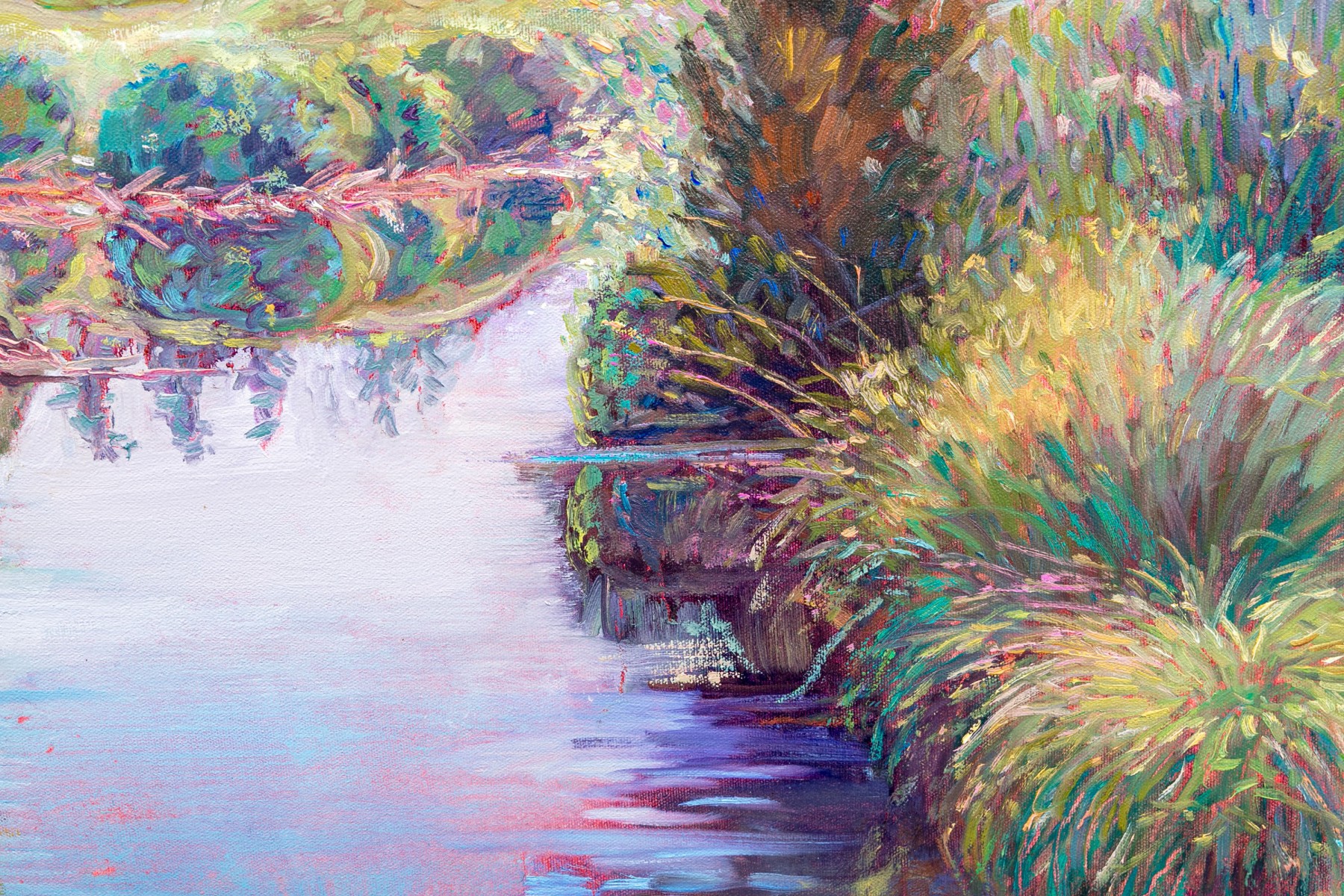 The artist has depicted an idyllic landscape with body of water with lush vegetation bursting with life and vibrant hues throughout. Catherine M. Elliott displays her amazing talents with a brush throughout but highlighted by the manner in which the light ripples off the water in the near ground.