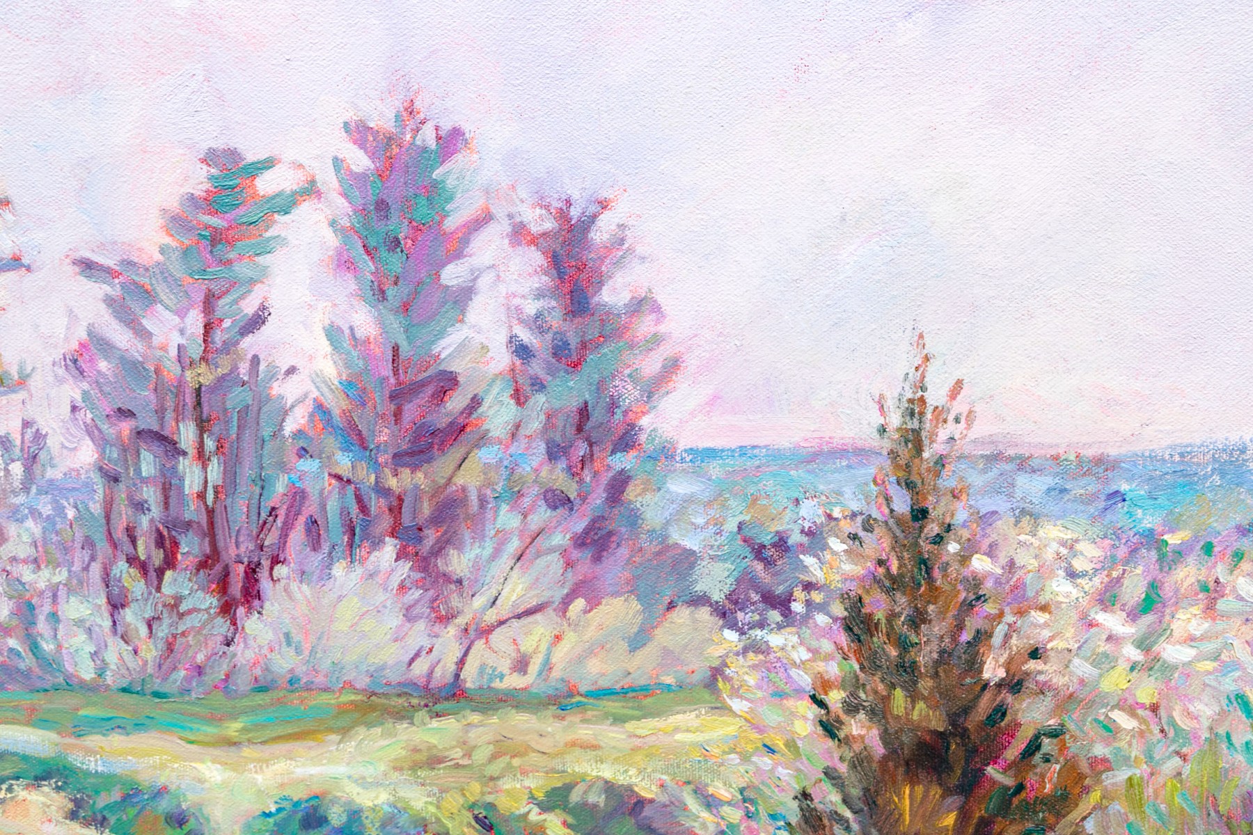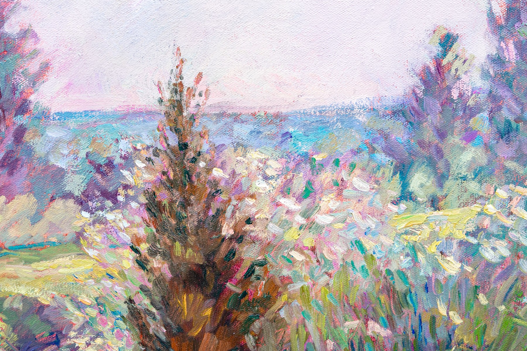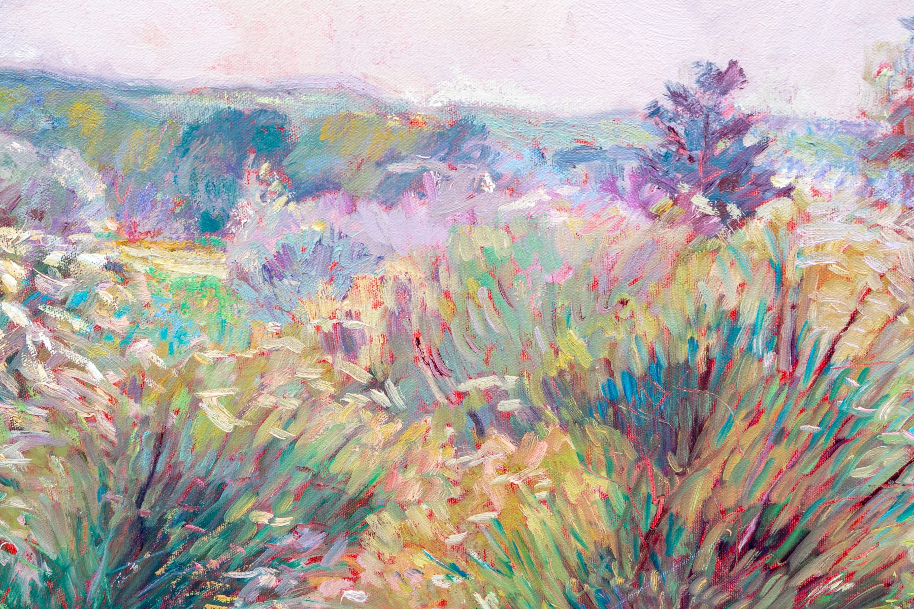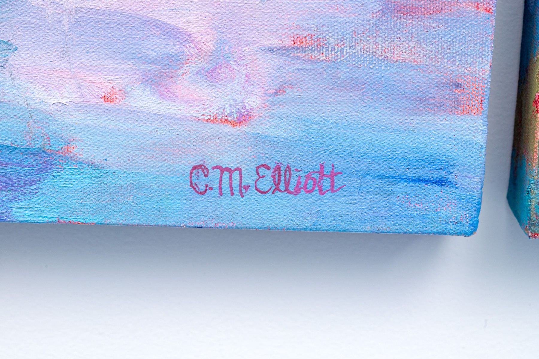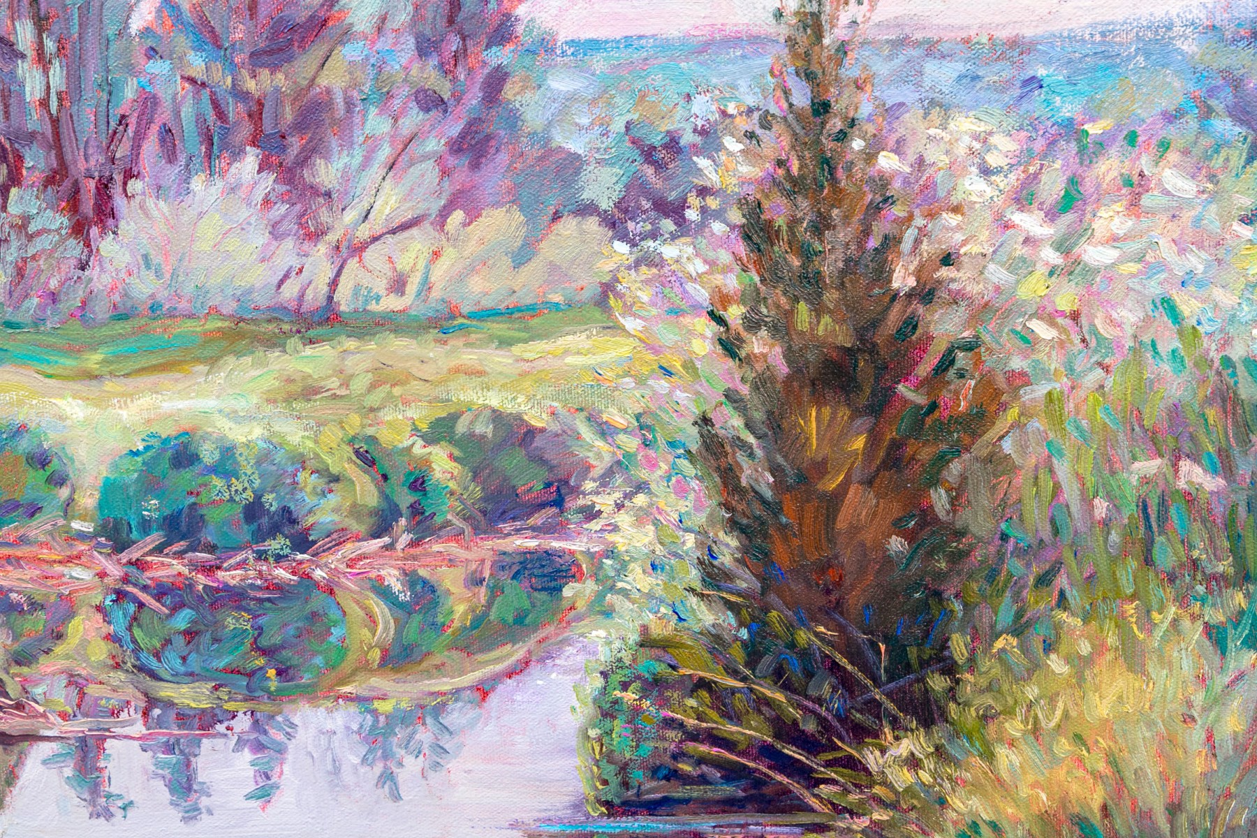 The artist has depicted an idyllic landscape with body of water with lush vegetation bursting with life and vibrant hues throughout. Catherine M. Elliott displays her amazing talents with a brush throughout but highlighted by the manner in which the light ripples off the water in the near ground.