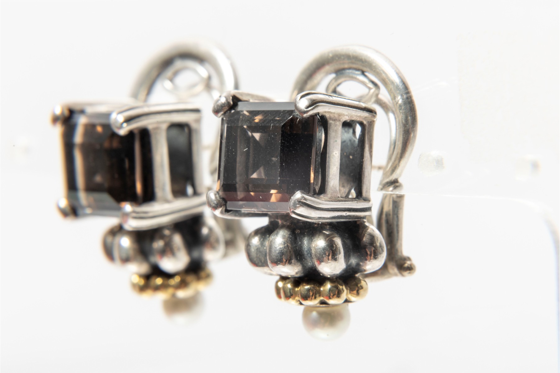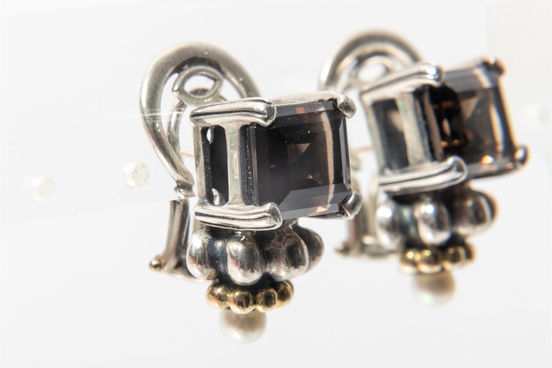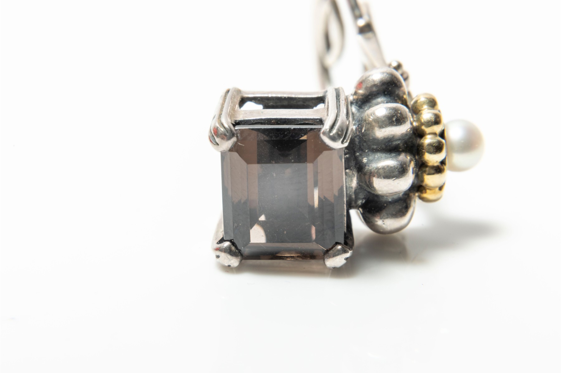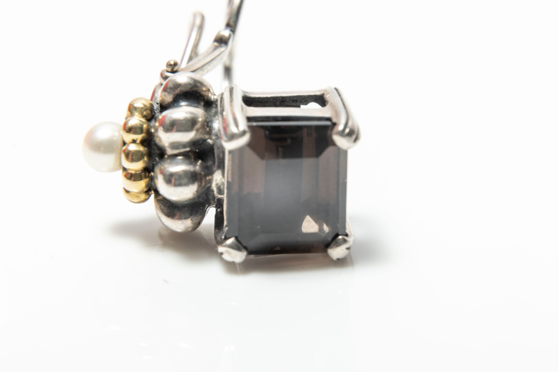 Caviar by Lagos pair of statement earrings in sterling silver and 18k gold, displaying prong-set rectangular smoky quartz over gadrooned and stippled bands leading to dainty white cultured pearls. Finished with post backs and omega clips.