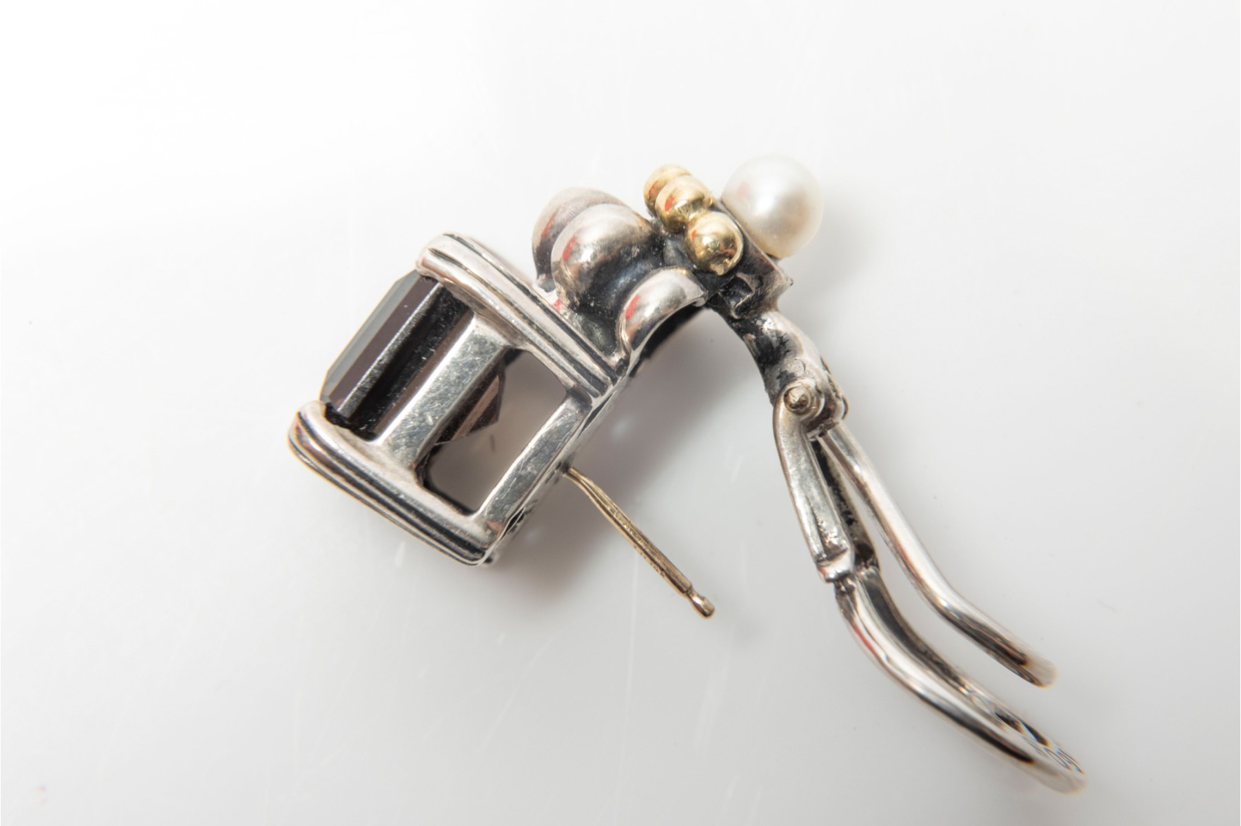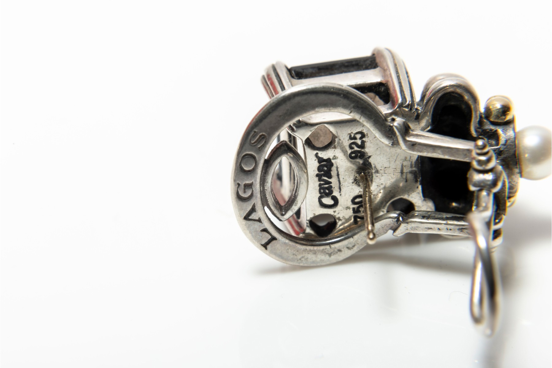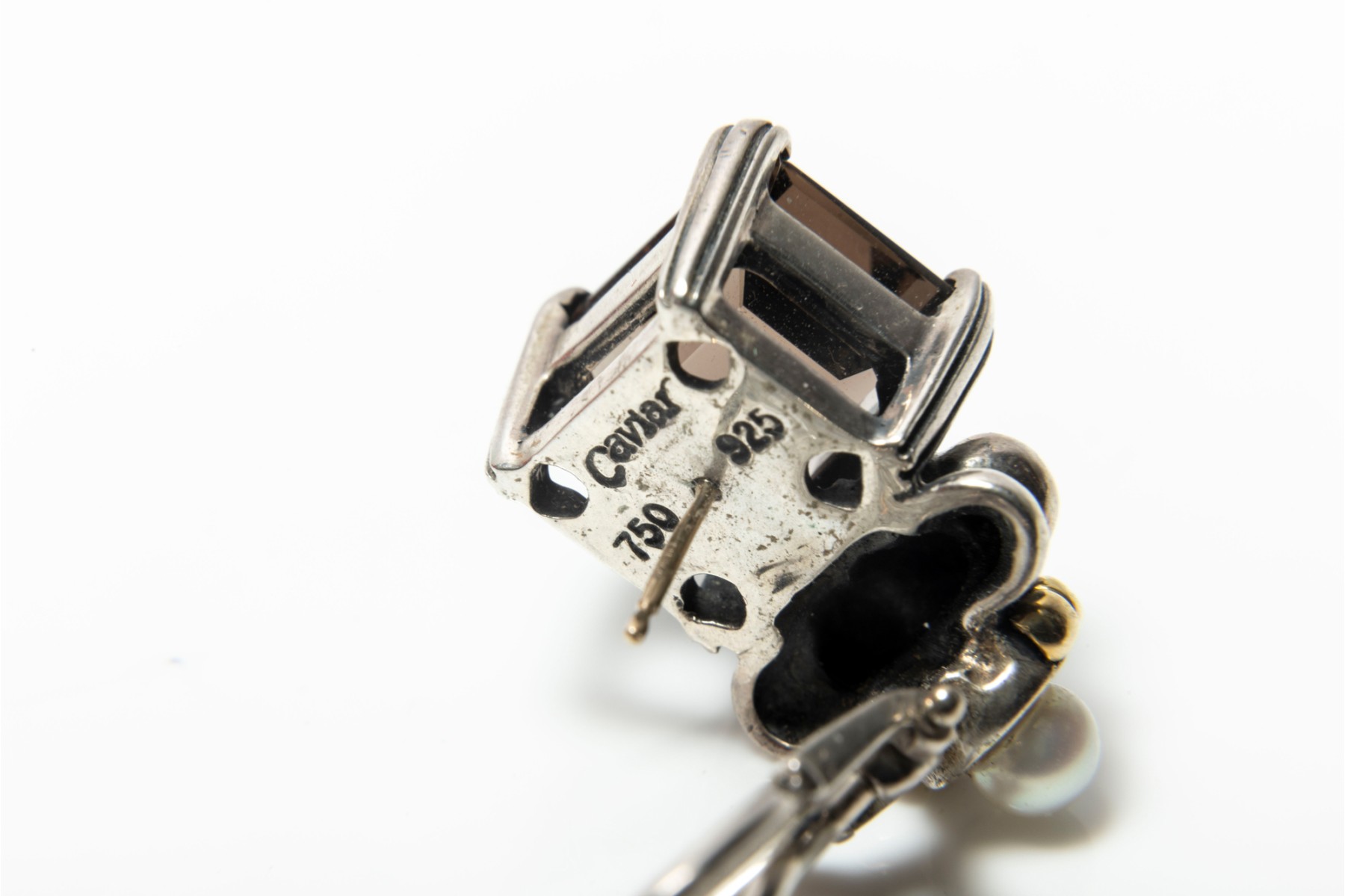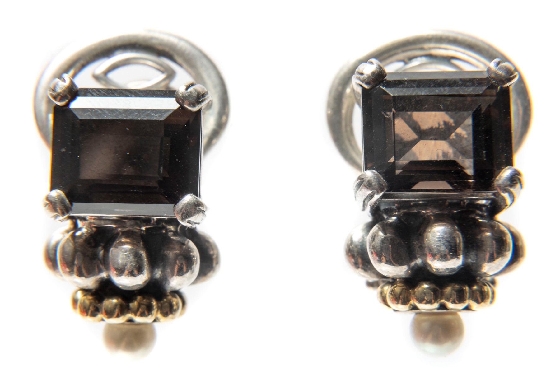 Caviar by Lagos pair of statement earrings in sterling silver and 18k gold, displaying prong-set rectangular smoky quartz over gadrooned and stippled bands leading to dainty white cultured pearls. Finished with post backs and omega clips.