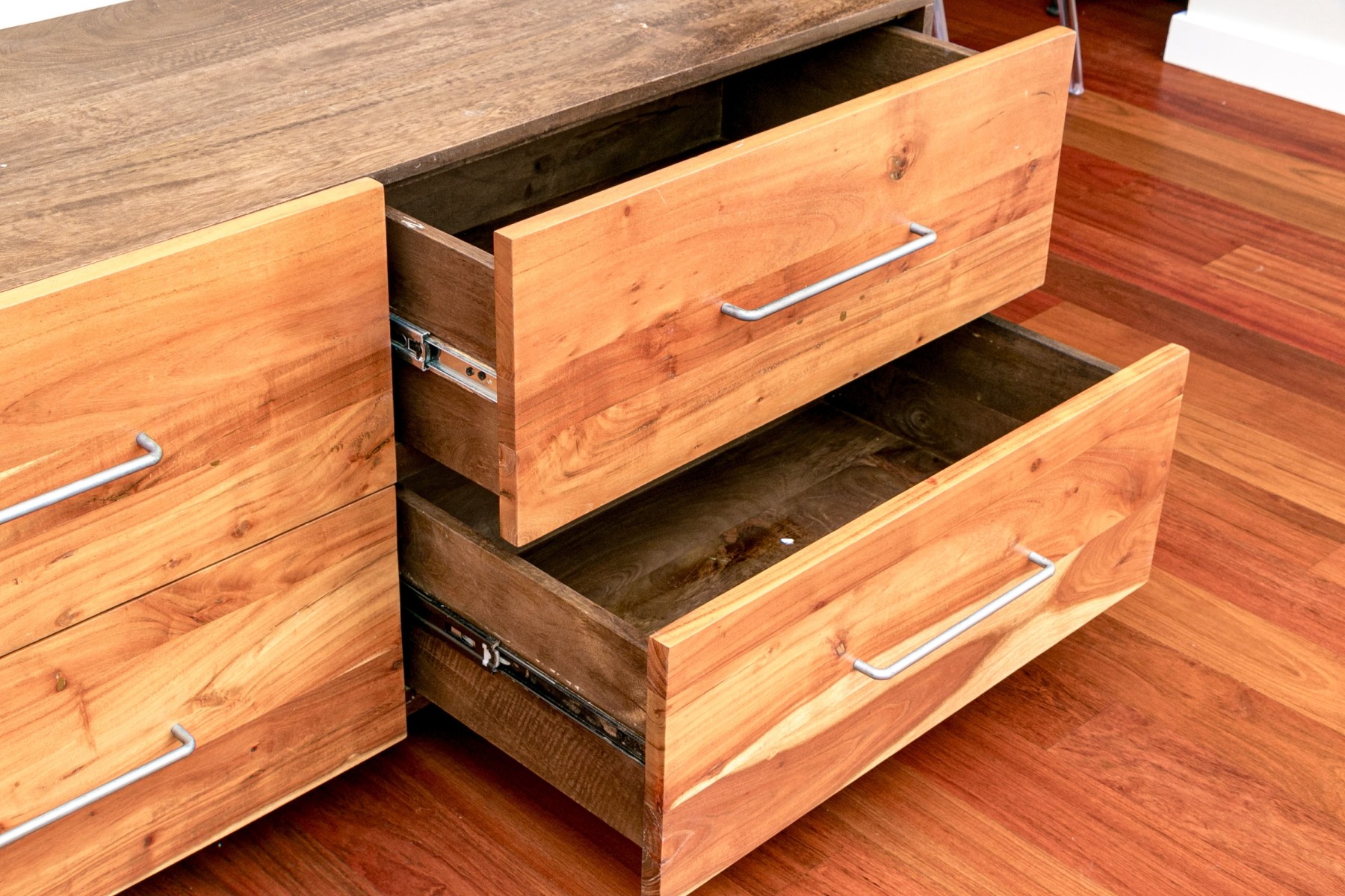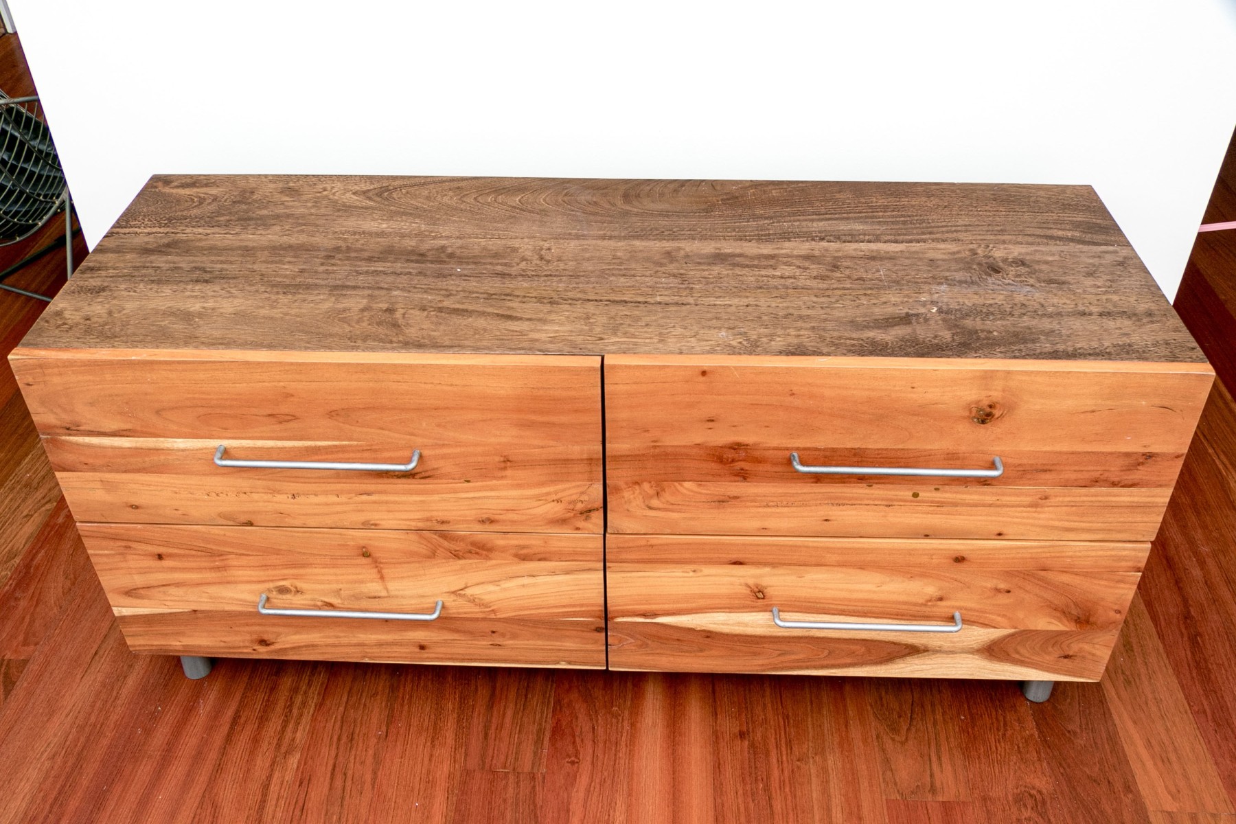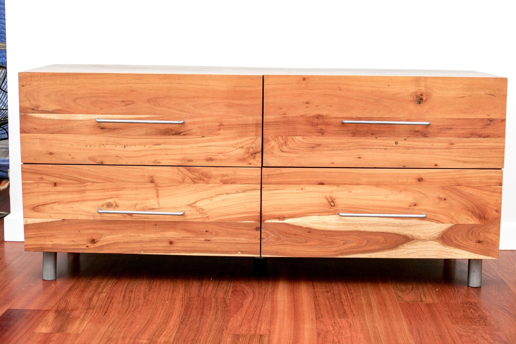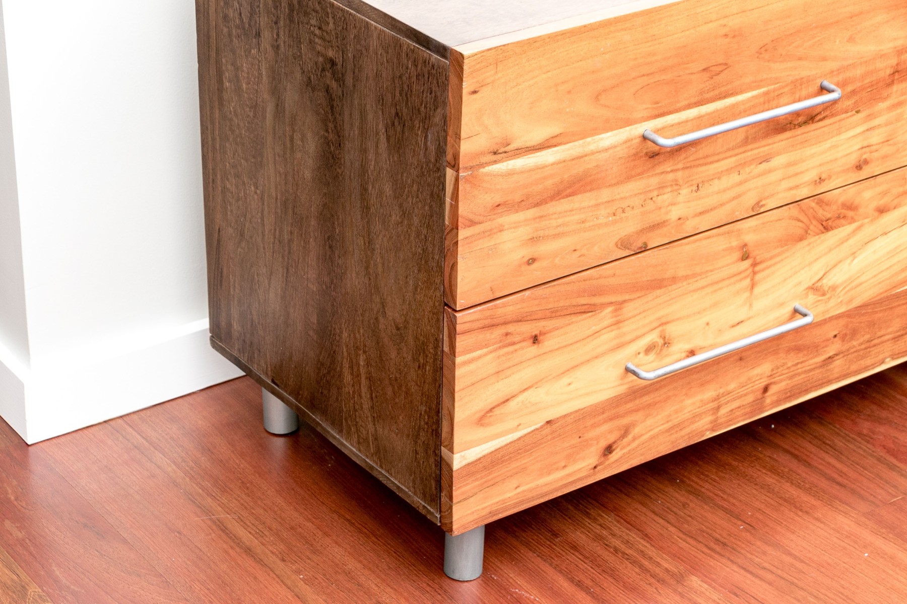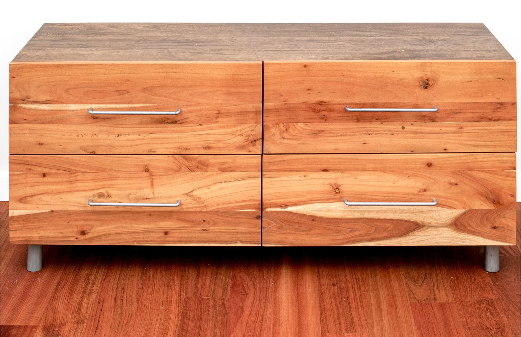 A gorgeous CB2 "Junction" low dresser chest in beautiful mango wood with four rich, warm brown acacia wood drawers adorned with minimalist gray metal handles that compliment gray cylindrical legs.