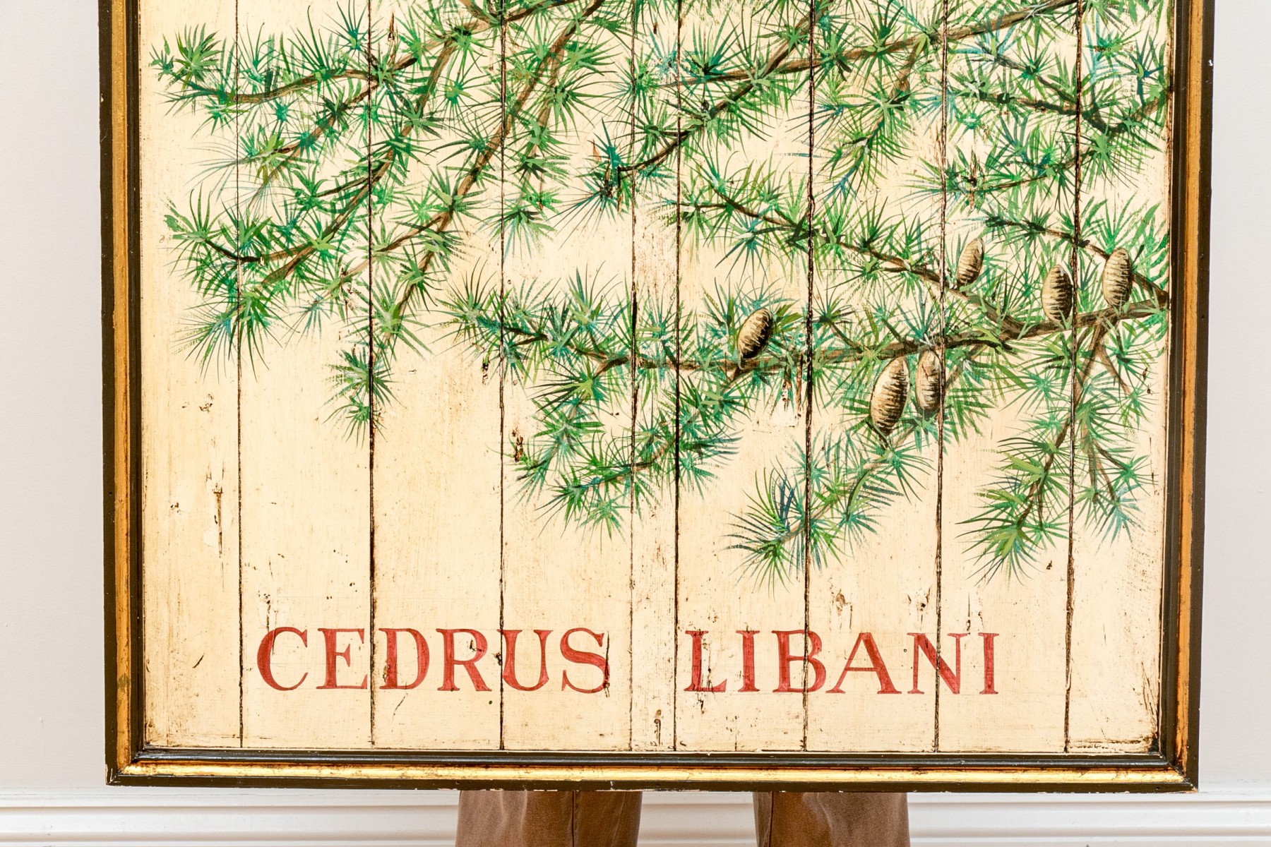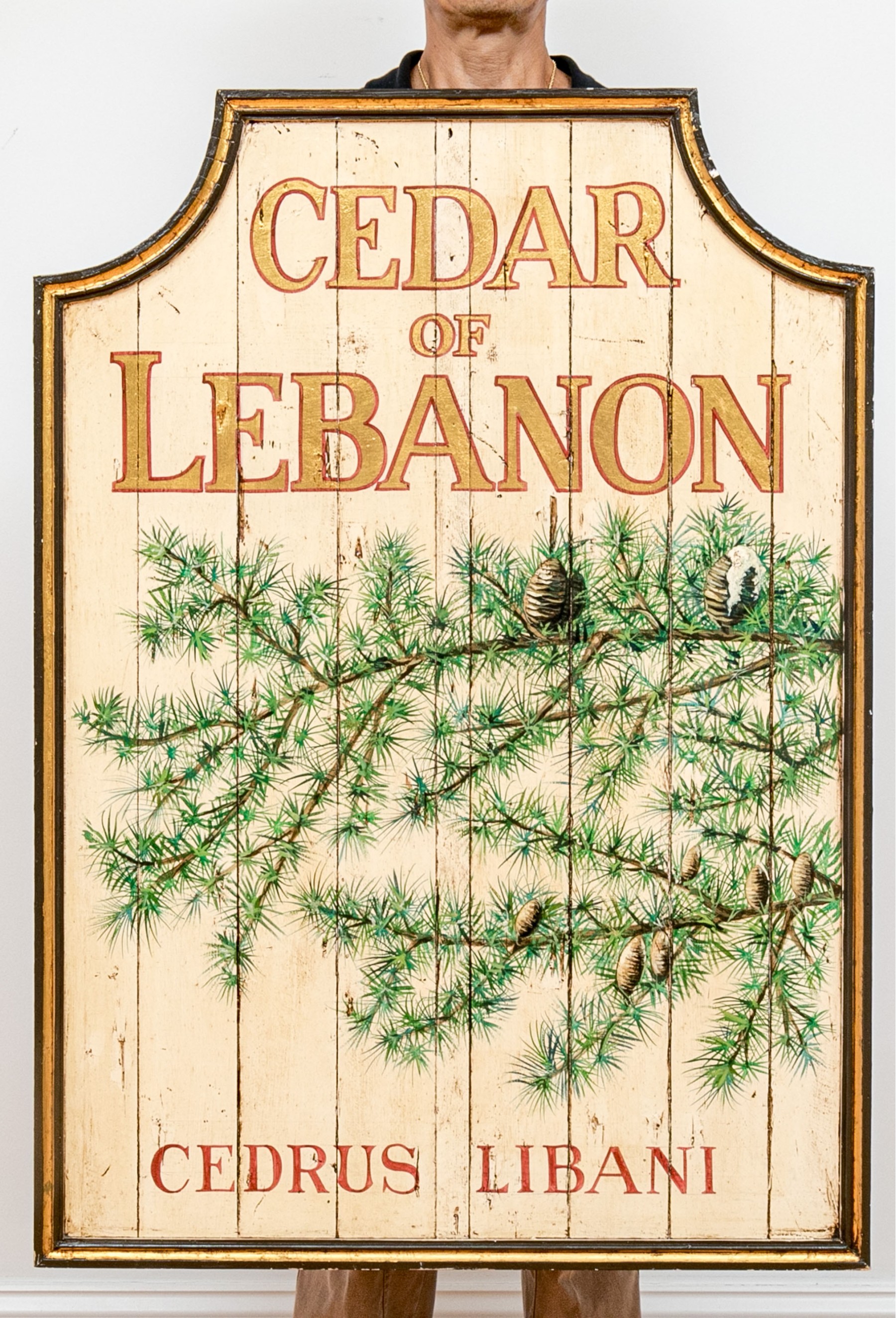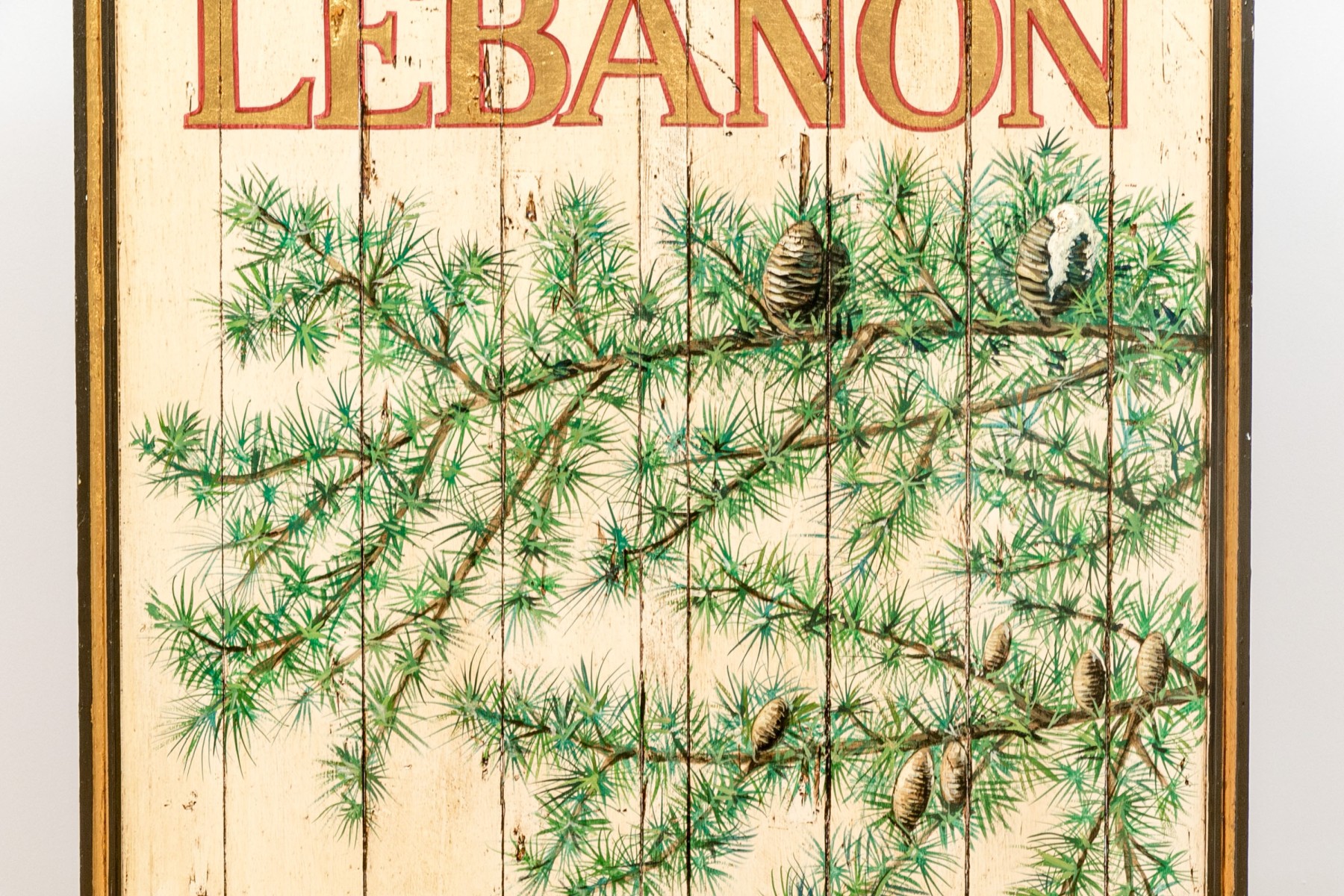 Cedar Of Lebanon Painted Wood Panel advertisment hand painted with Cedar tree branches, reading "Cedar of Lebanon, Cedars Libani"