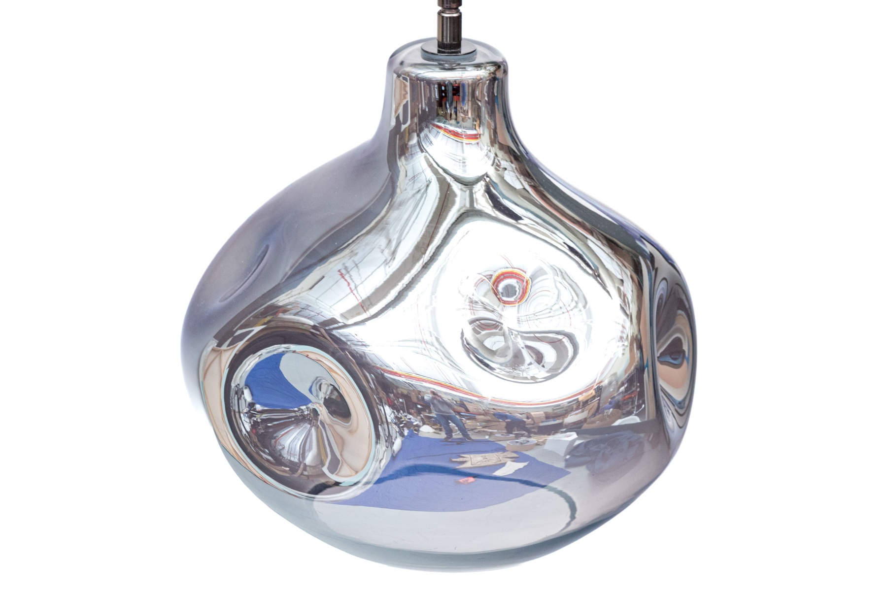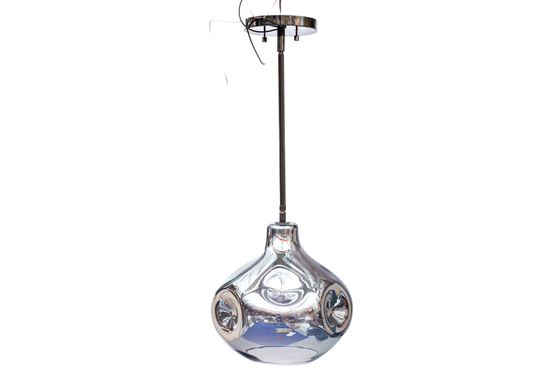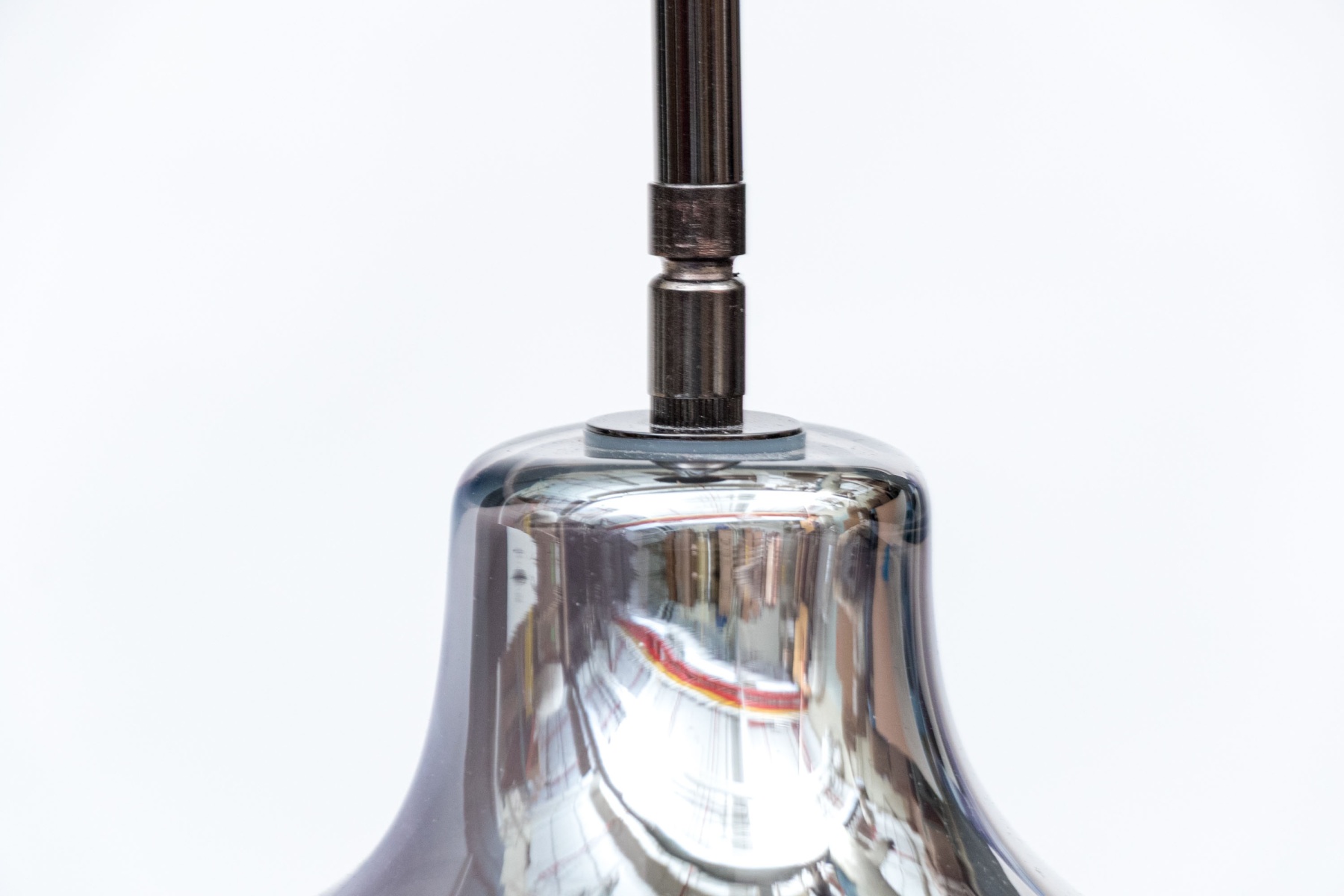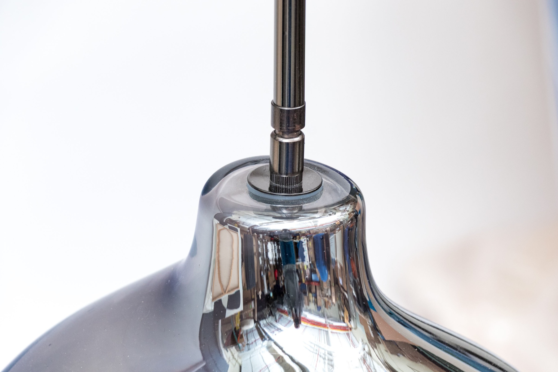 Chrome finished glass shade with one bulb with pole above rising to the cieling flush mount.
