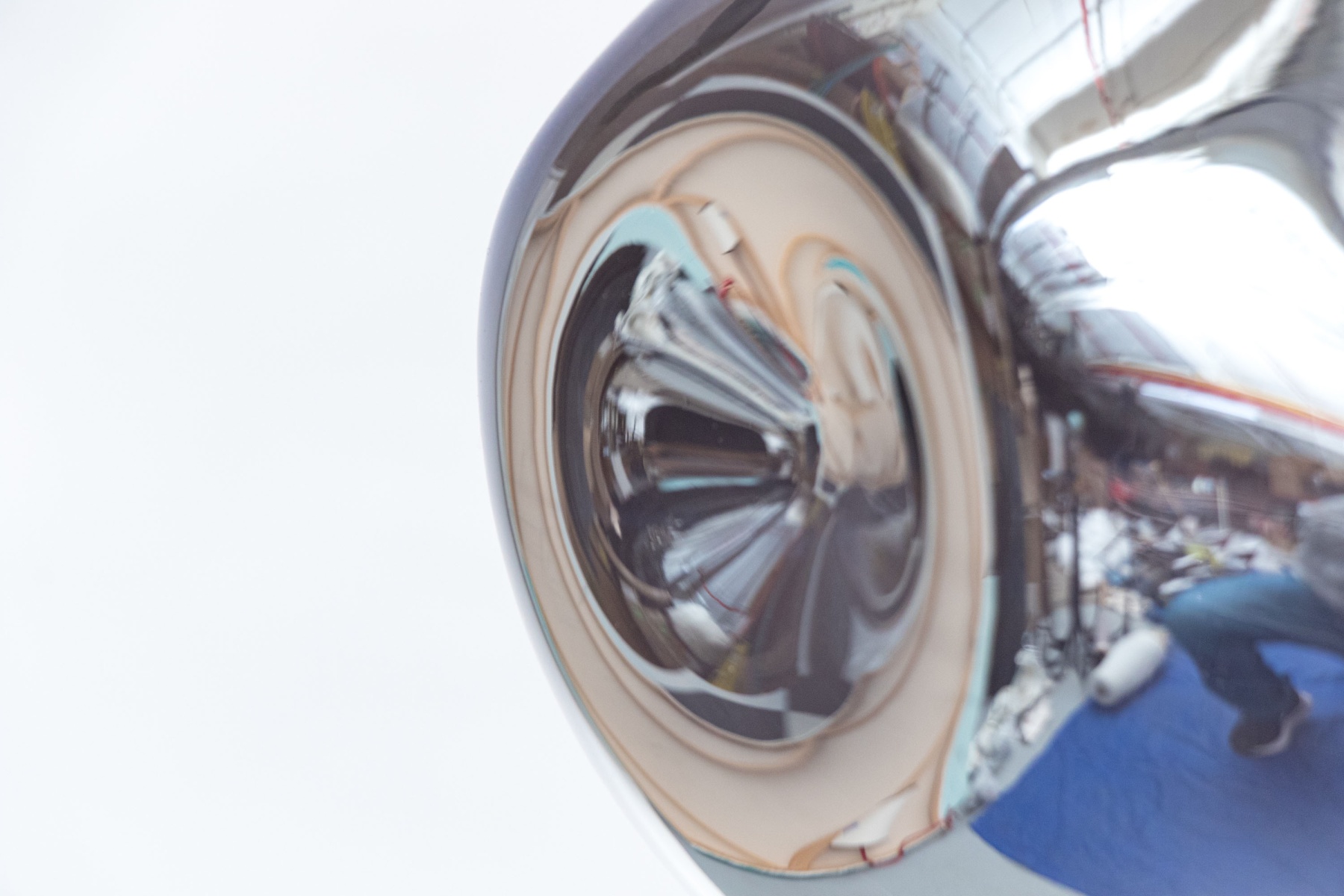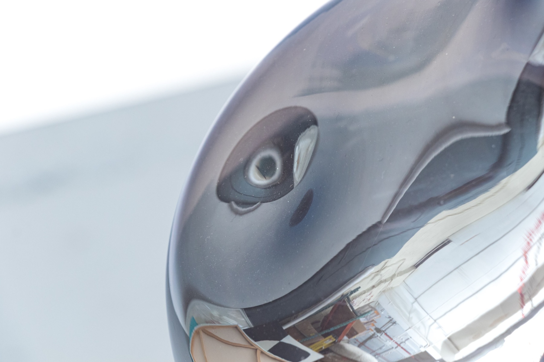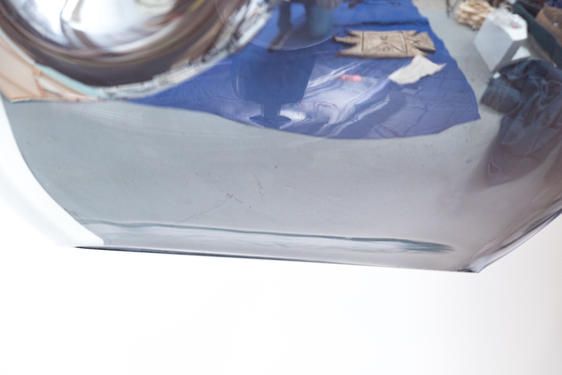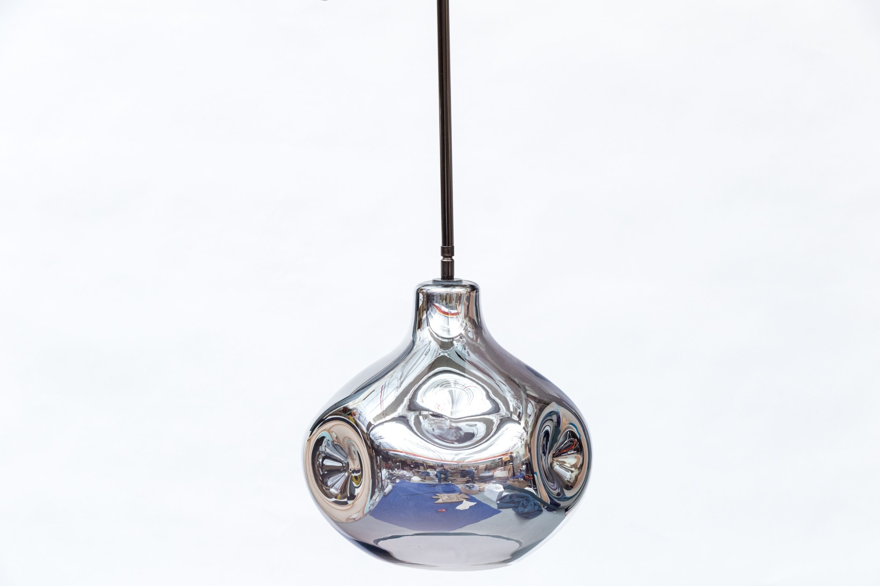 Chrome finished glass shade with one bulb with pole above rising to the cieling flush mount.