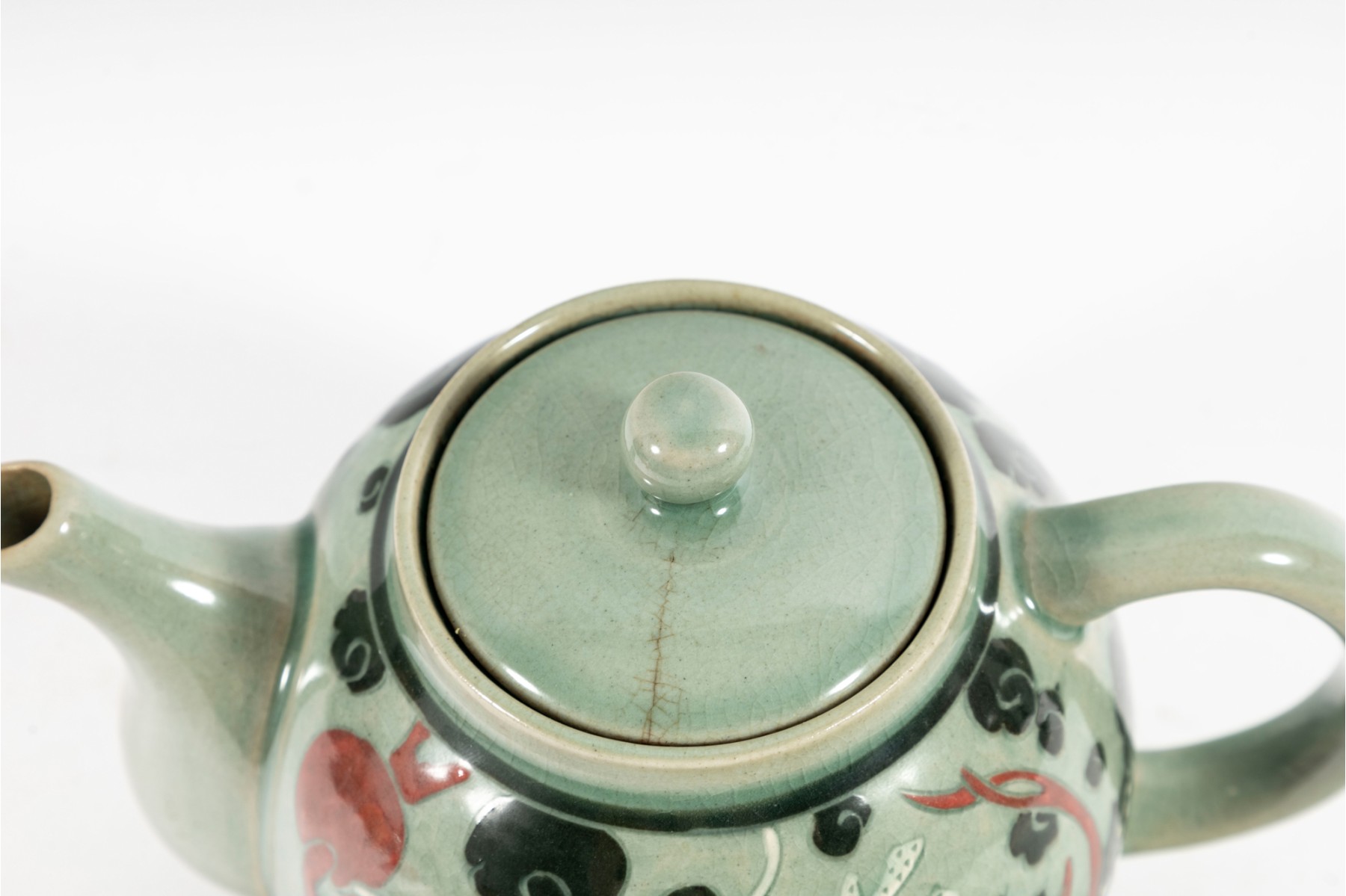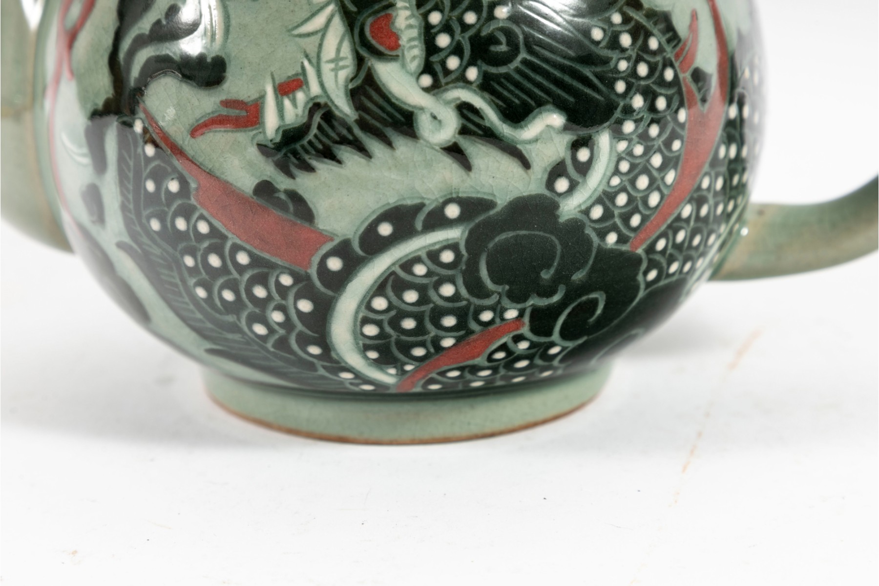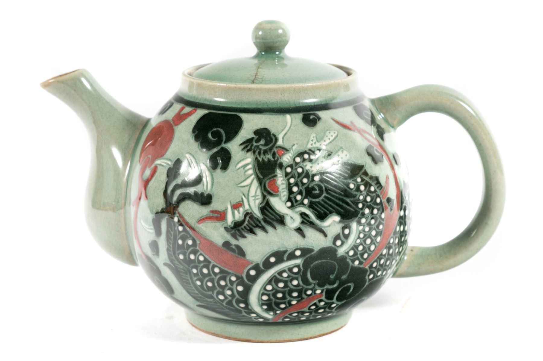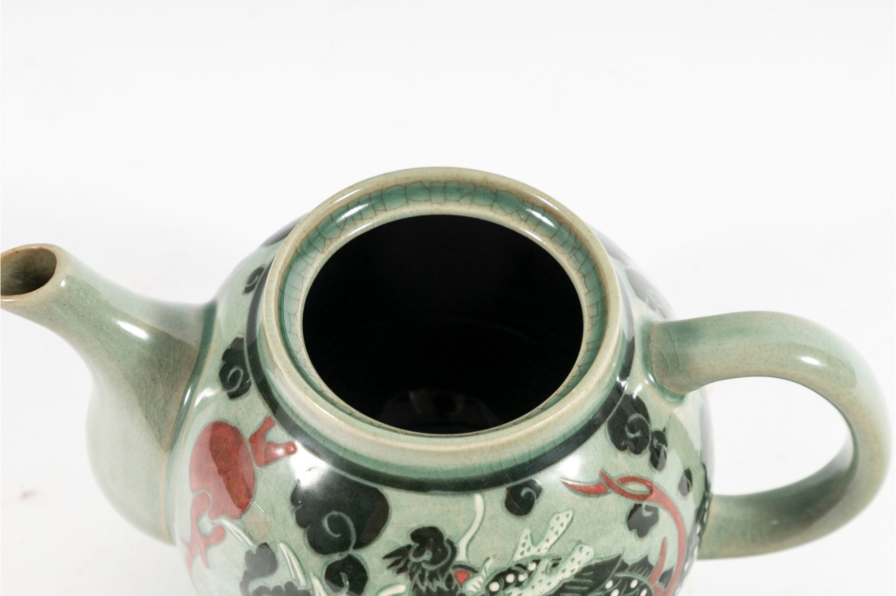 A small, marked Chinese teapot adorned with a traditional celadon glaze over fine stoneware. The exterior is embellished with eastern Dragon designs set among whimsical clouds. Unknown maker, see photos for markings.