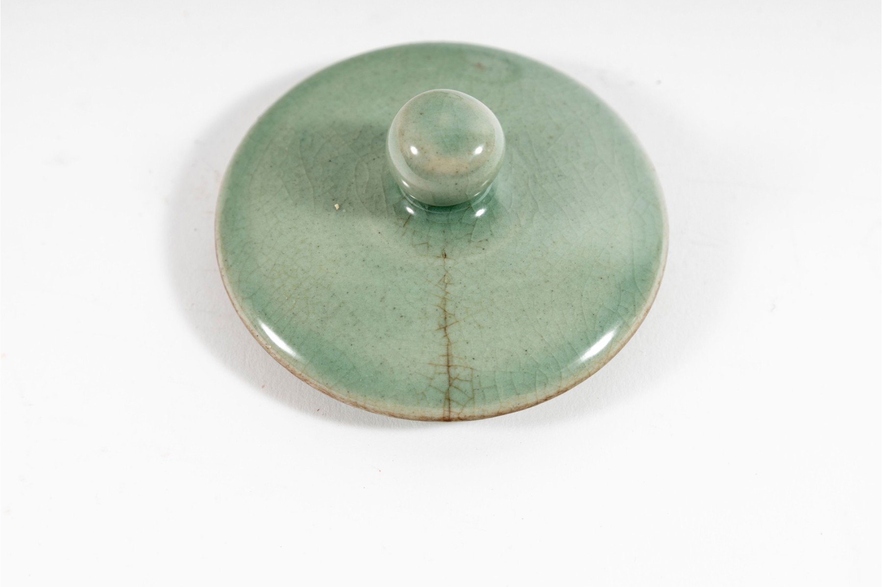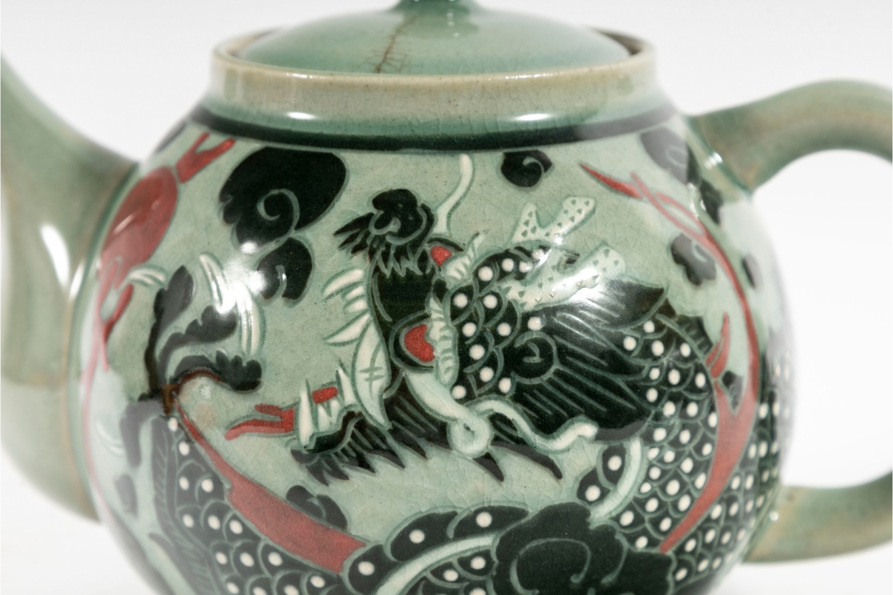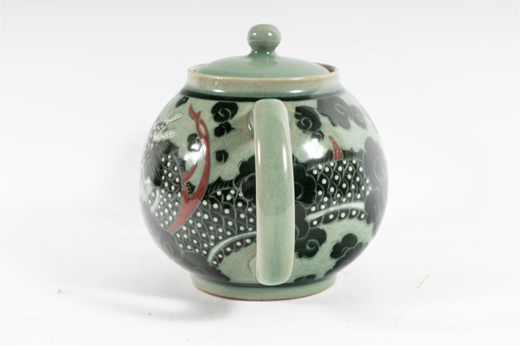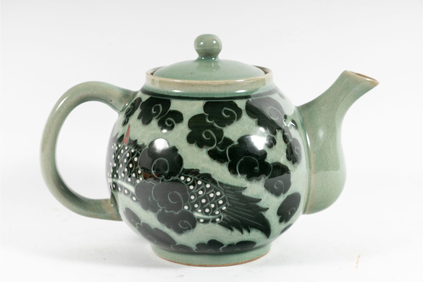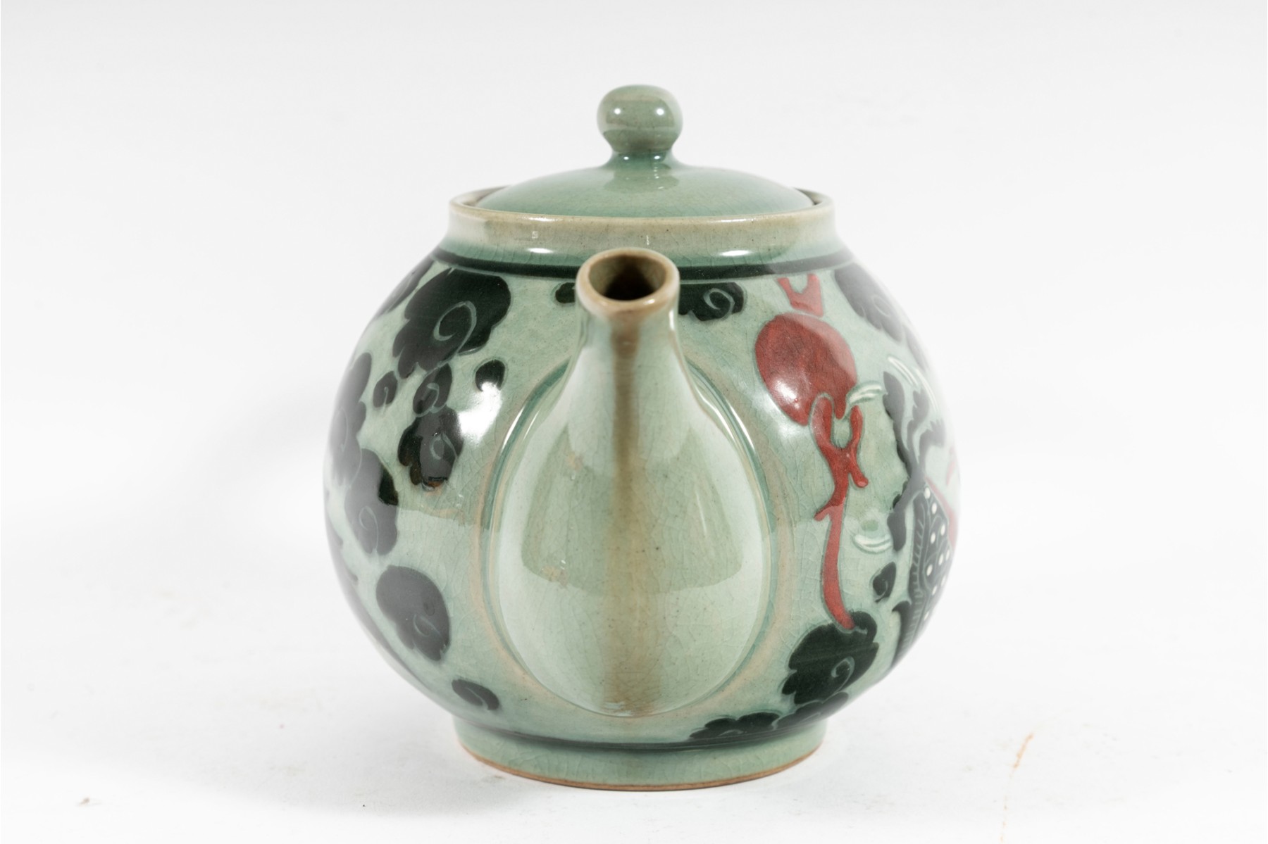 A small, marked Chinese teapot adorned with a traditional celadon glaze over fine stoneware. The exterior is embellished with eastern Dragon designs set among whimsical clouds. Unknown maker, see photos for markings.