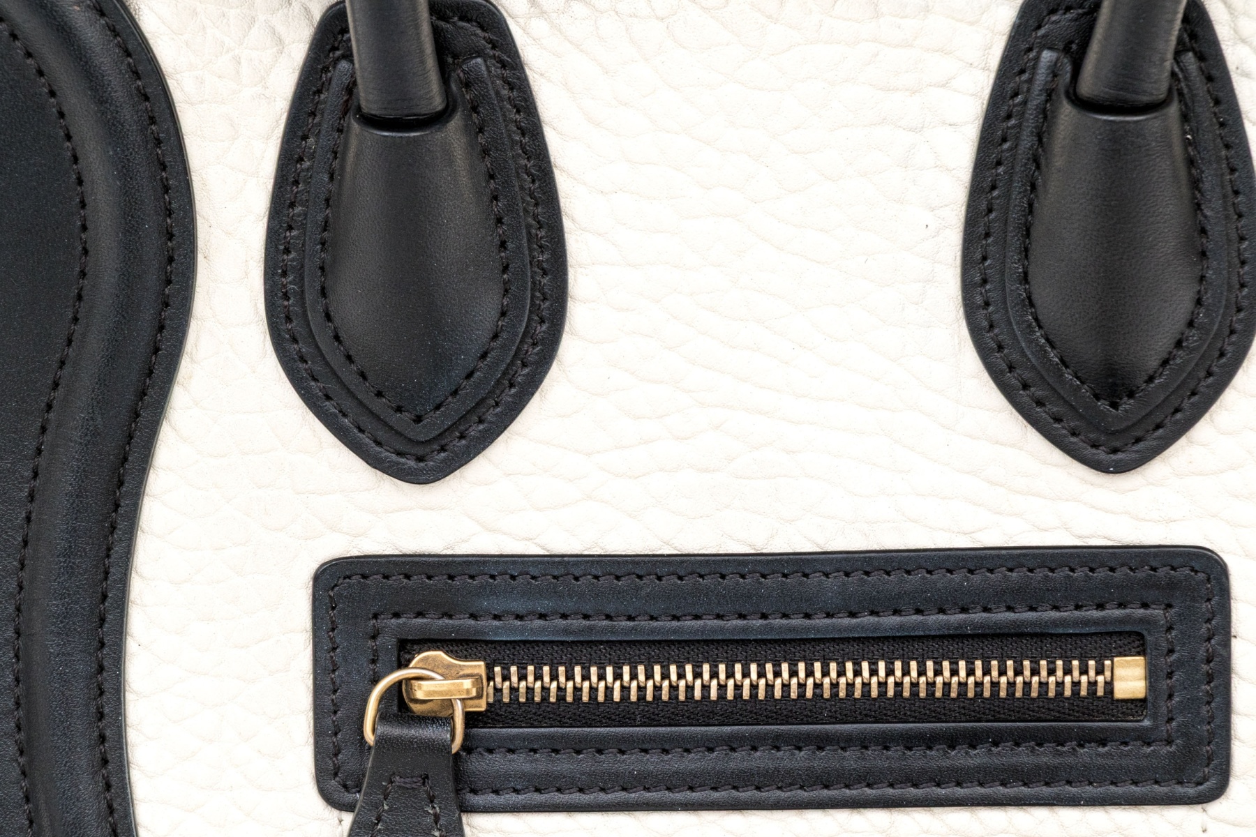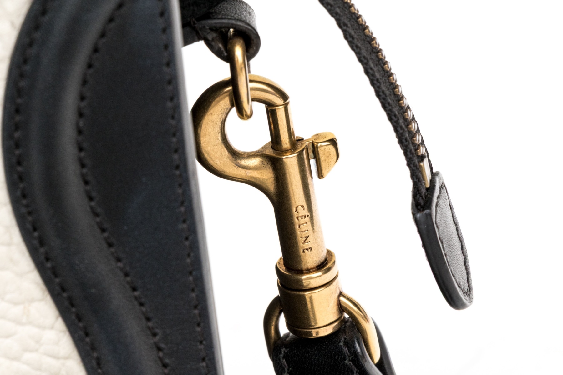 This gorgeous small bag by Celine features a soft white, pebbled leather body, decorated with black leather top handles and black leather trim and removable shoulder strap. Adorned with a zip outer pocket, and a zippered top. Tag, sticker, and care pamphlet included.