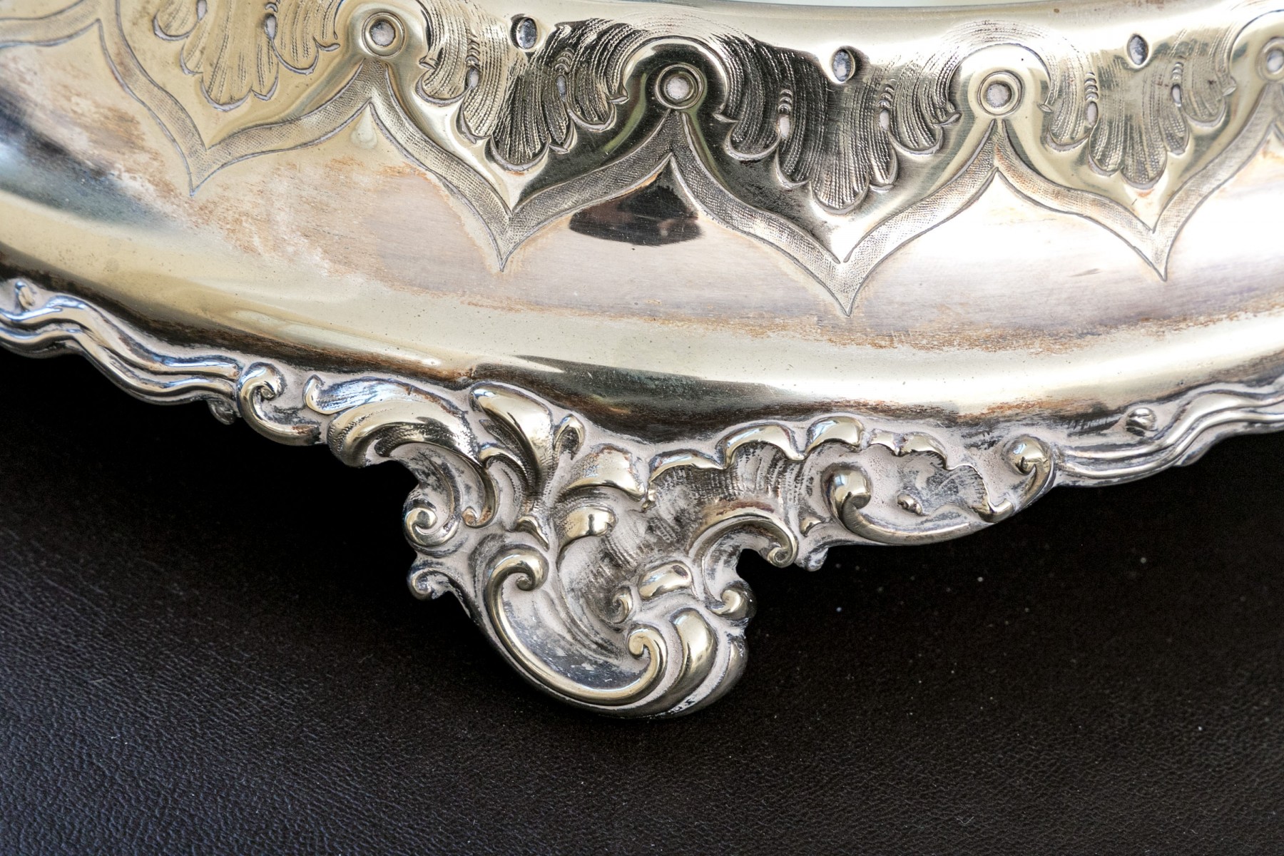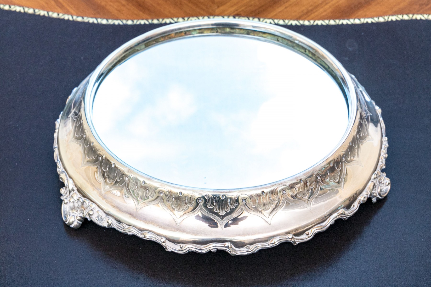 Late 19th/early 20th century Rococo style silver plated and footed inset center pierce with mirrored top. Apparently unmarked. Mahogany hinged panel underneath