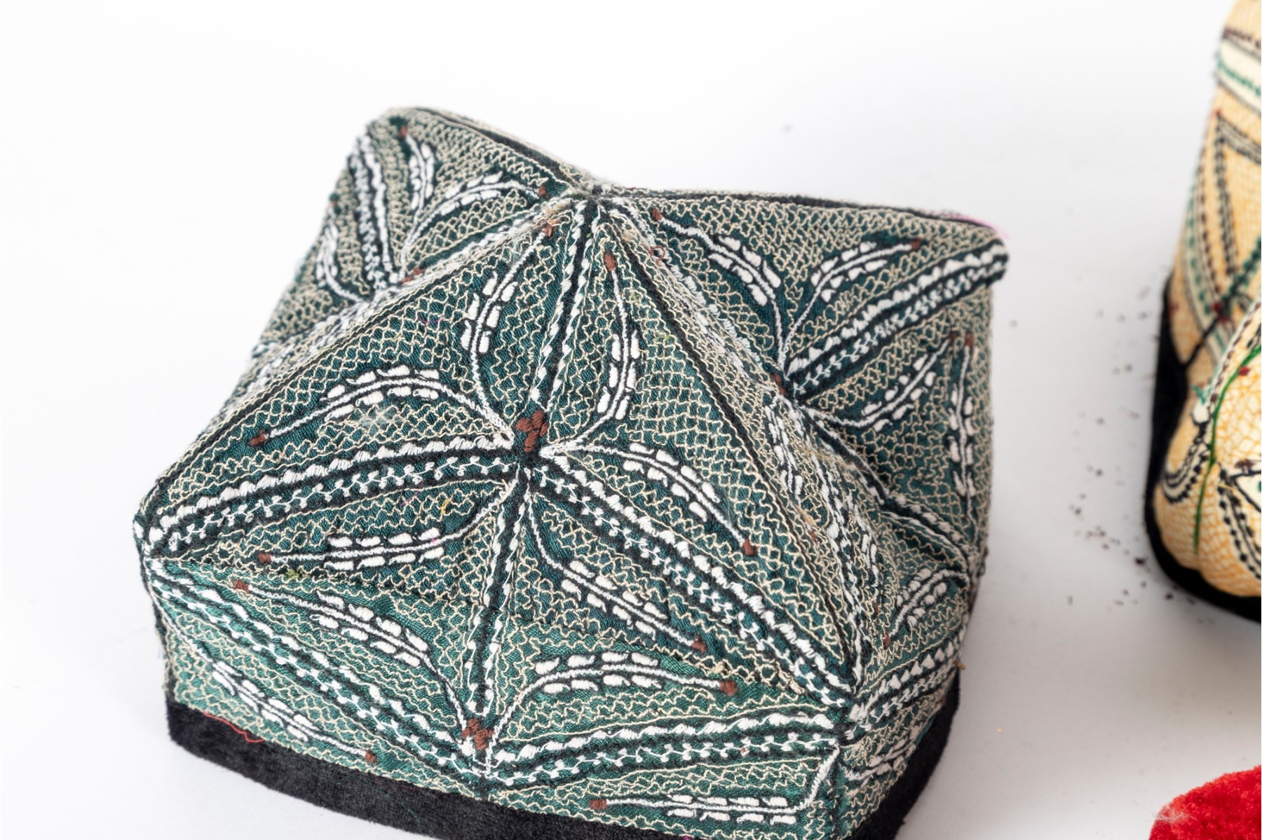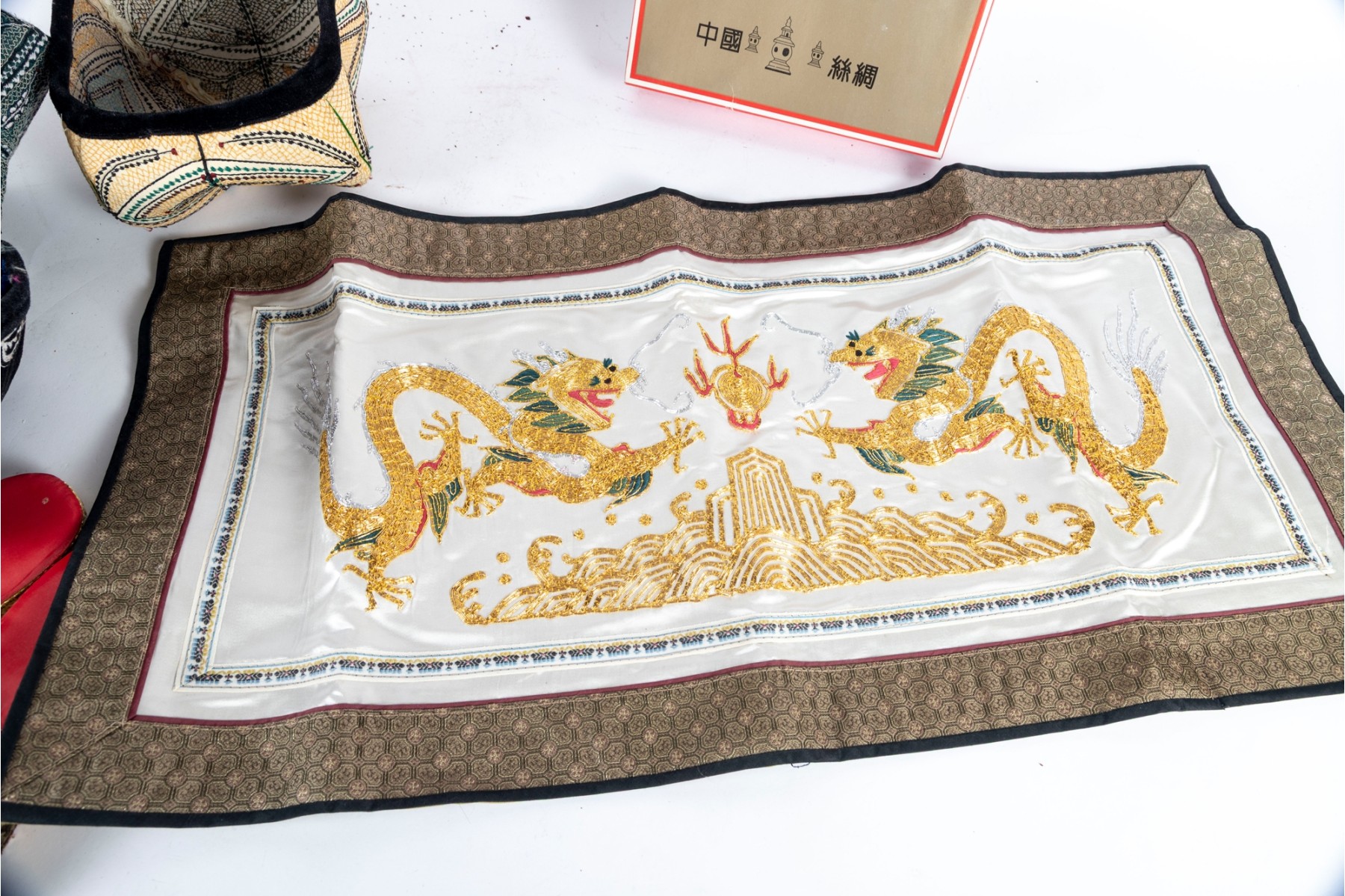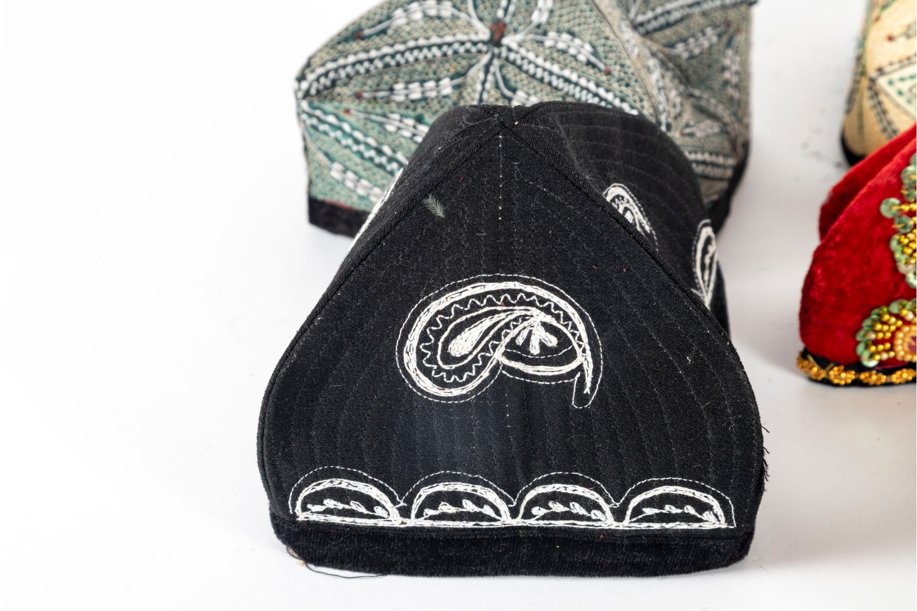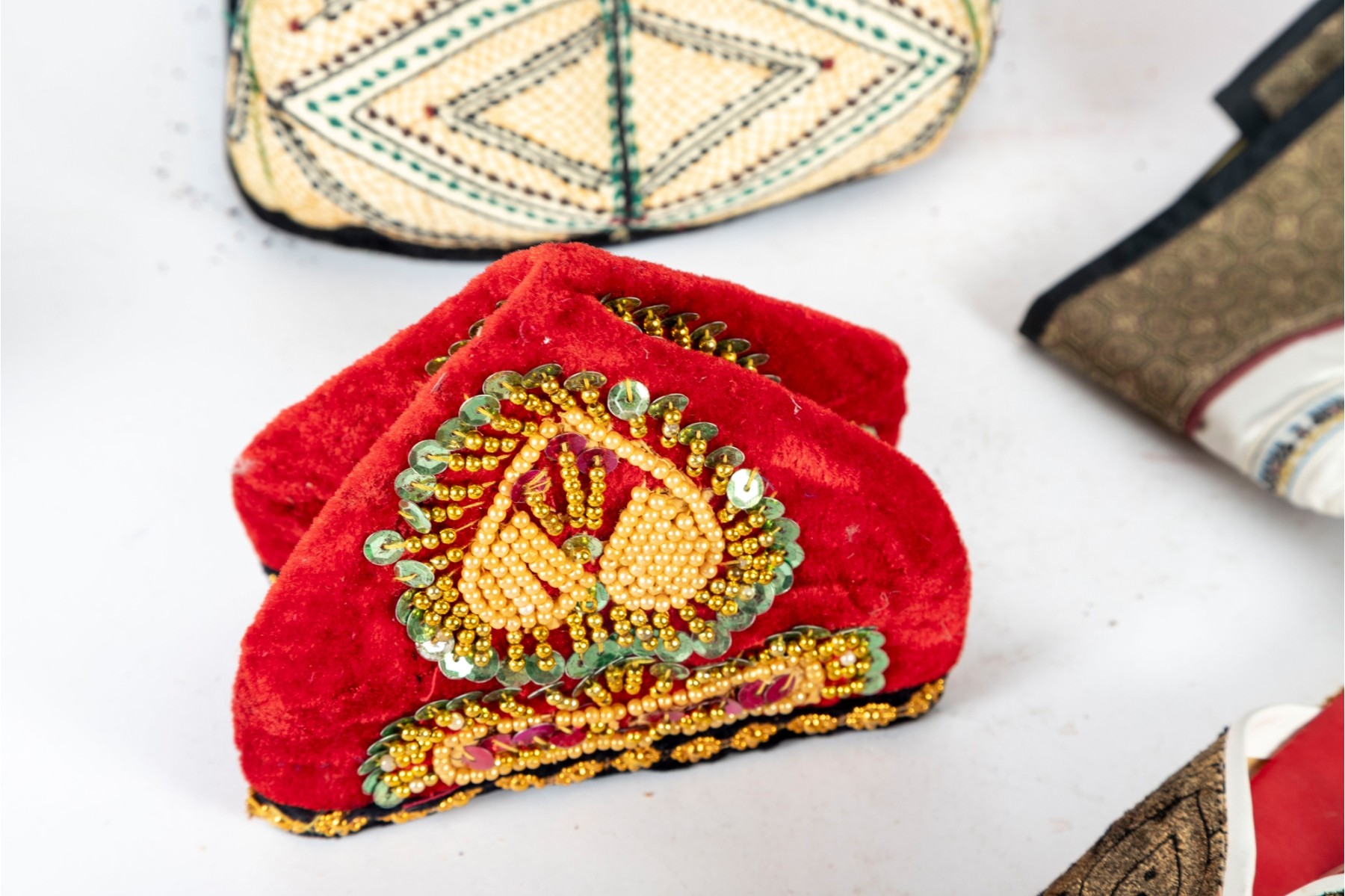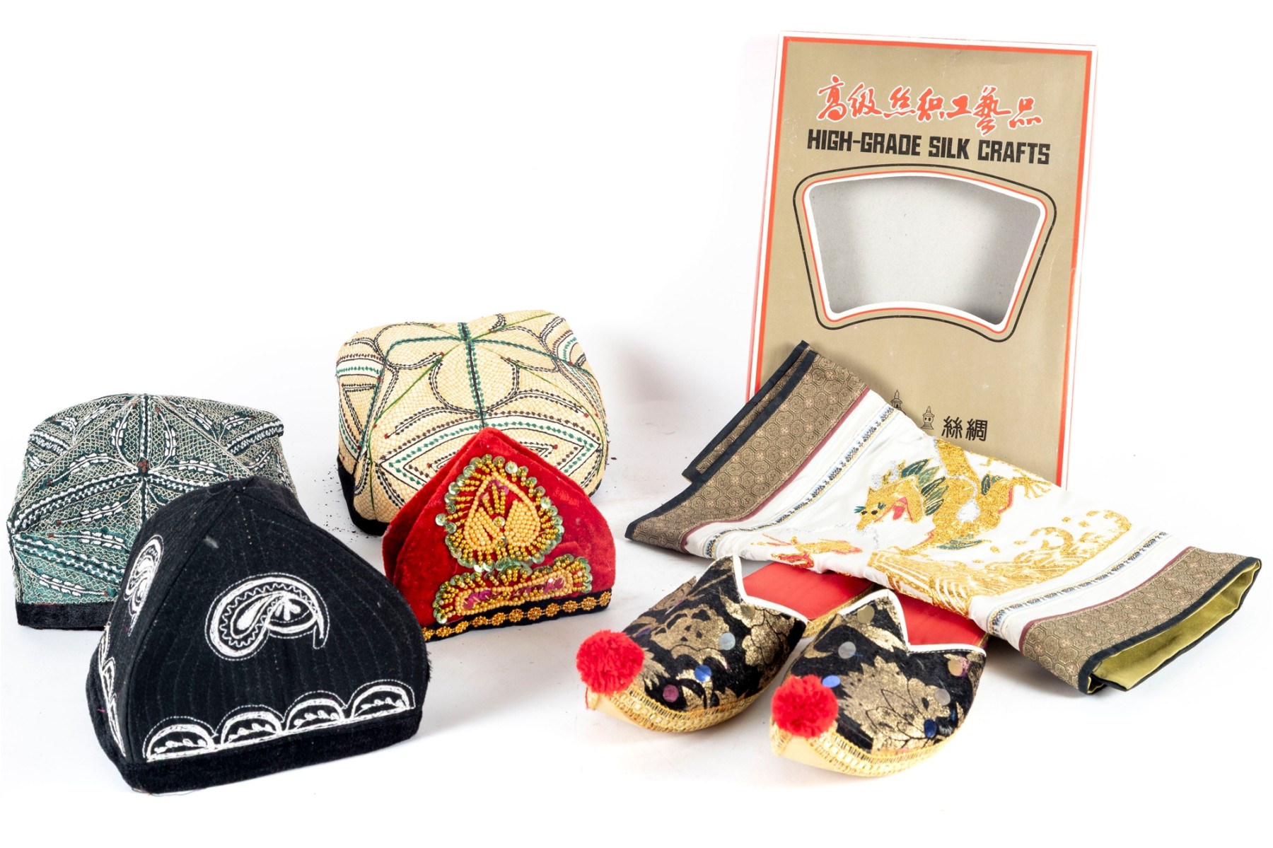 Various central Asian hats, slippers and silkcraft placemats. Contents as shown and sold as is -- see photos for details.