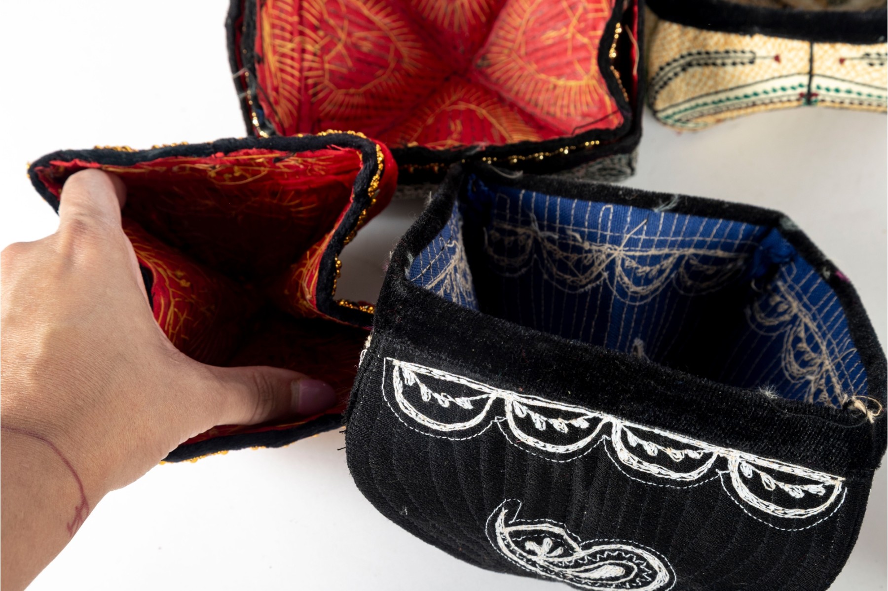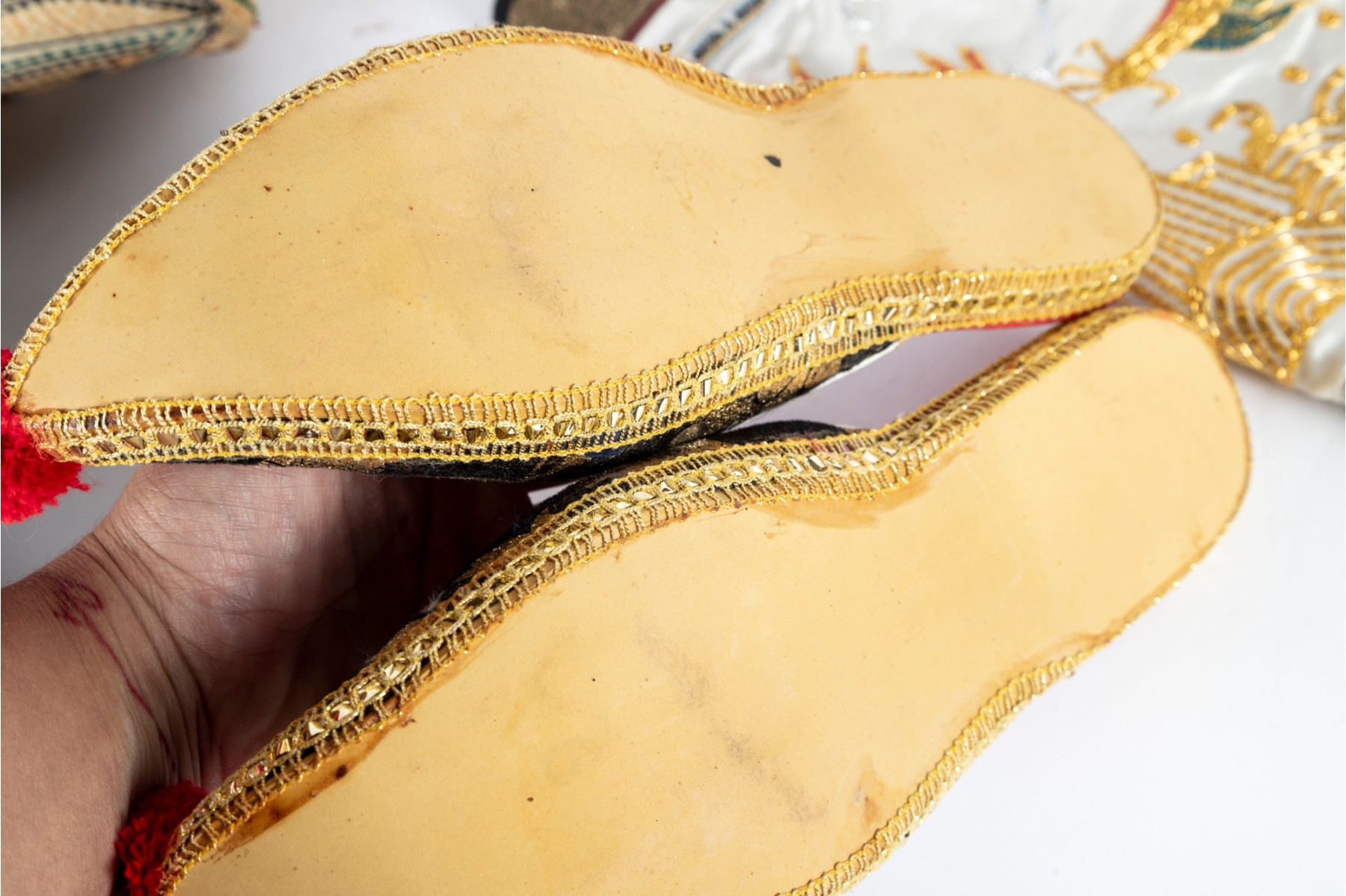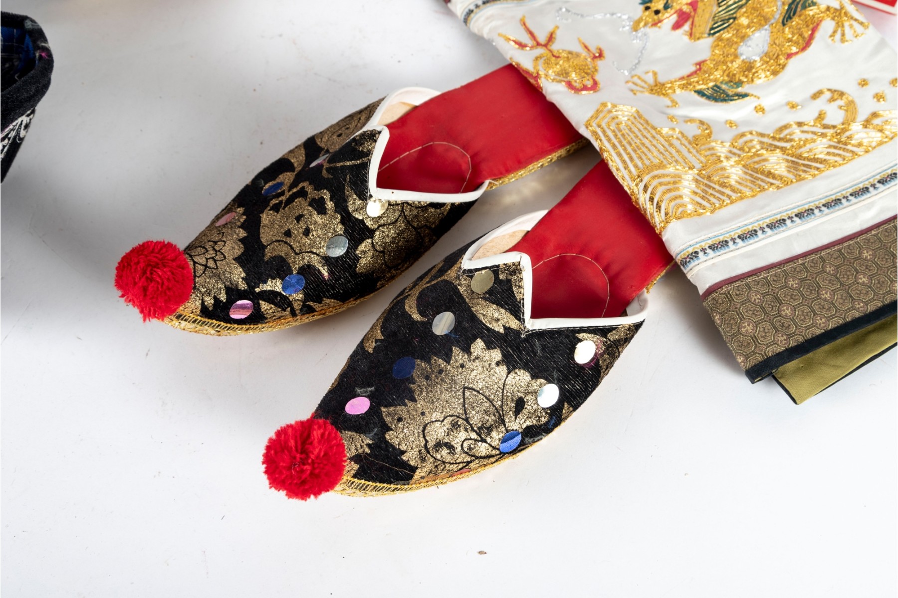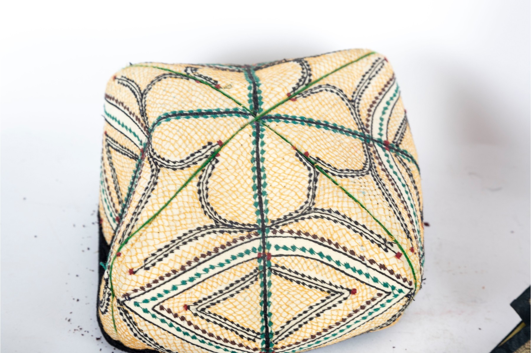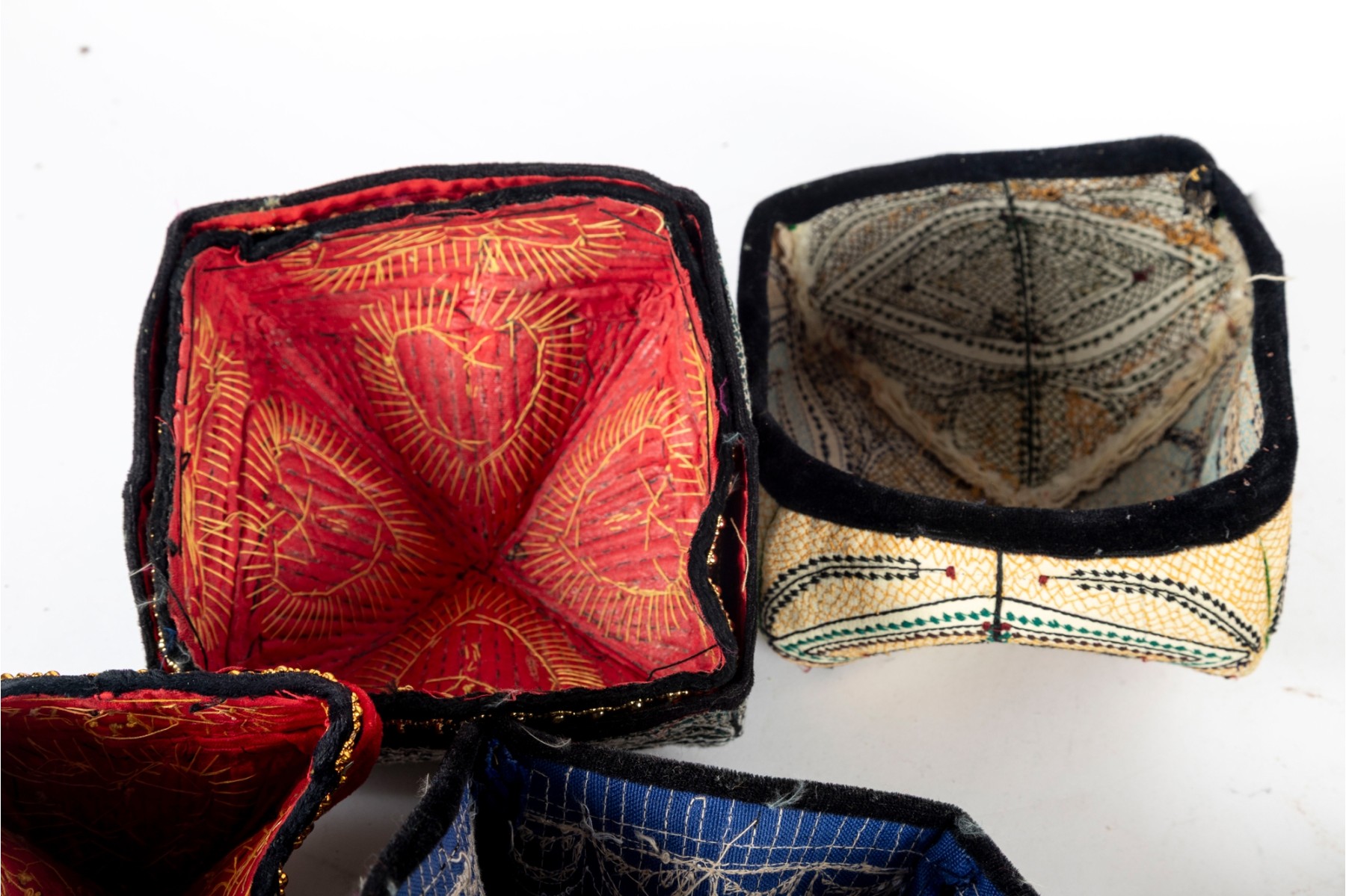 Various central Asian hats, slippers and silkcraft placemats. Contents as shown and sold as is -- see photos for details.