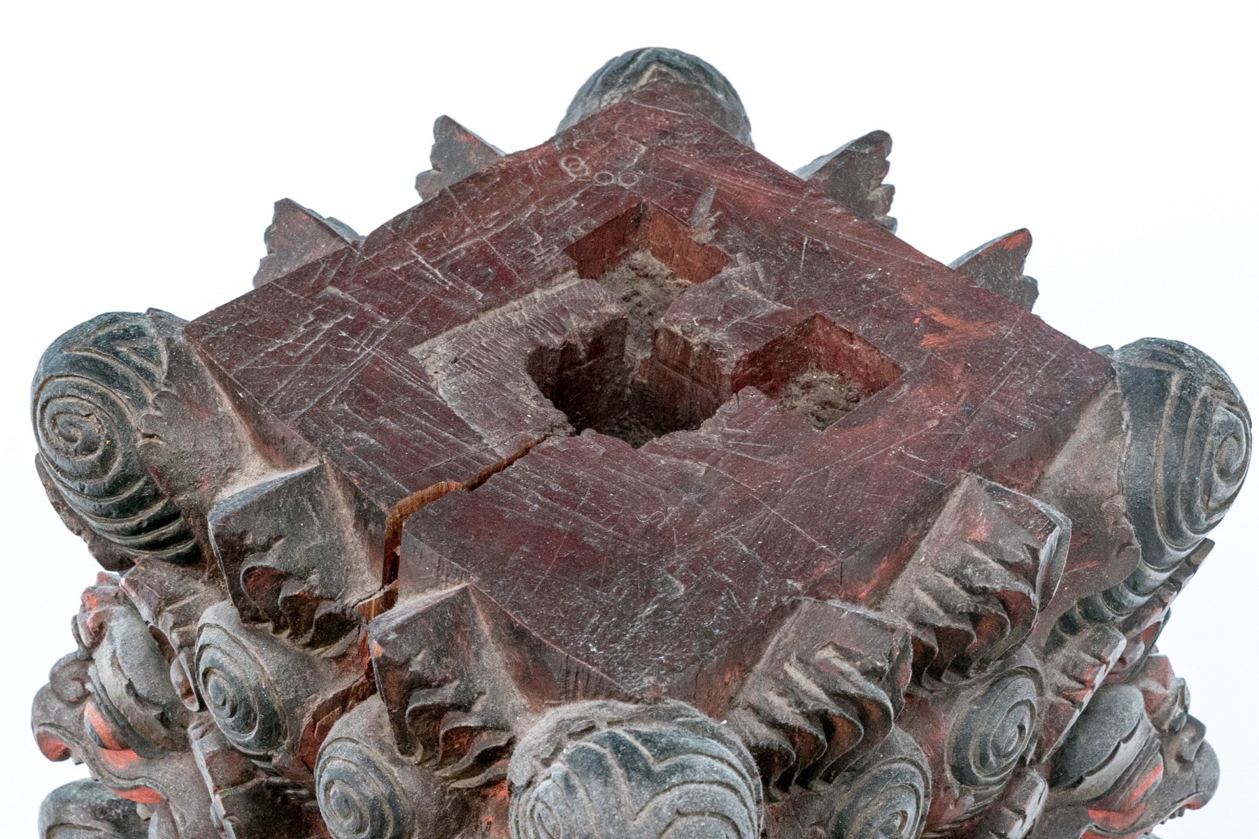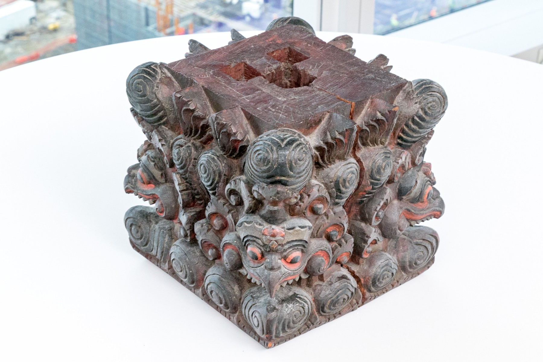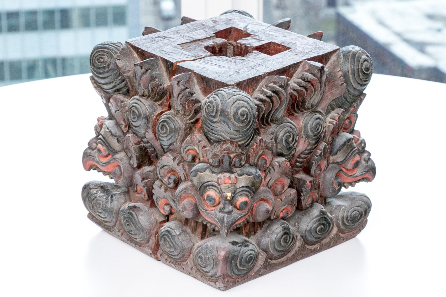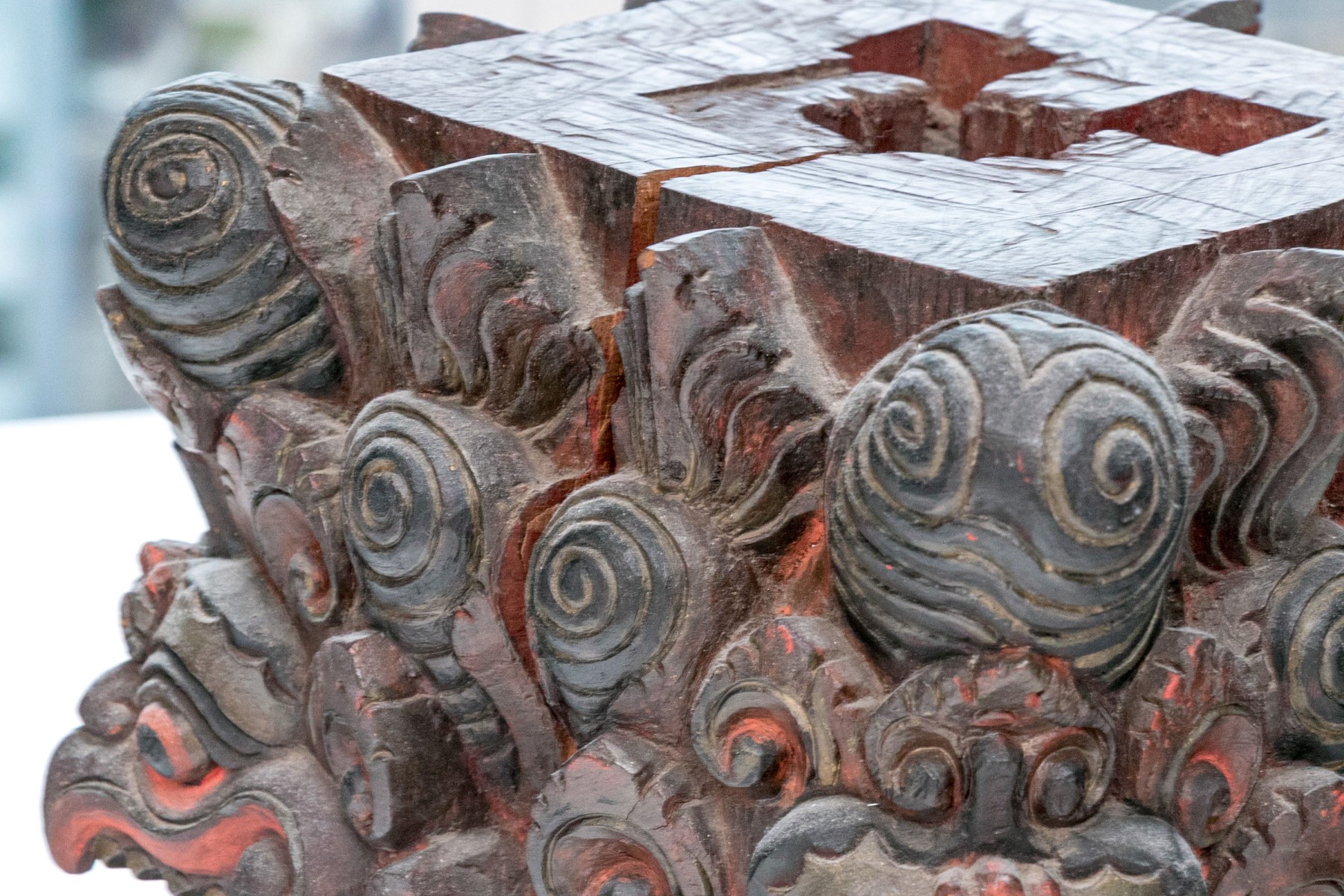 A black painted wood base with high relief carving with heads of monsters with beaks and sharp teeth and red details overall. High relief scrolls and pointed motifs above and below. The top with a carved opening for an attachment.