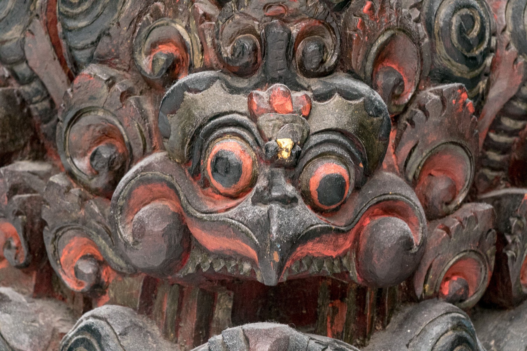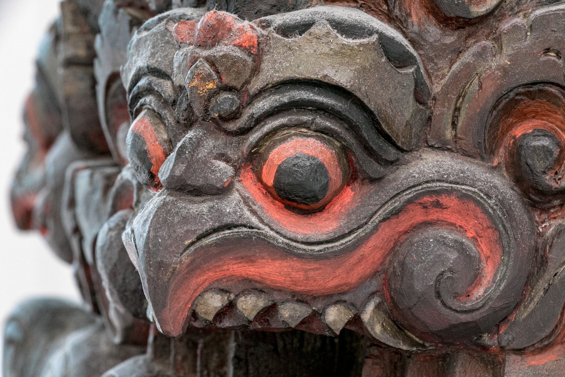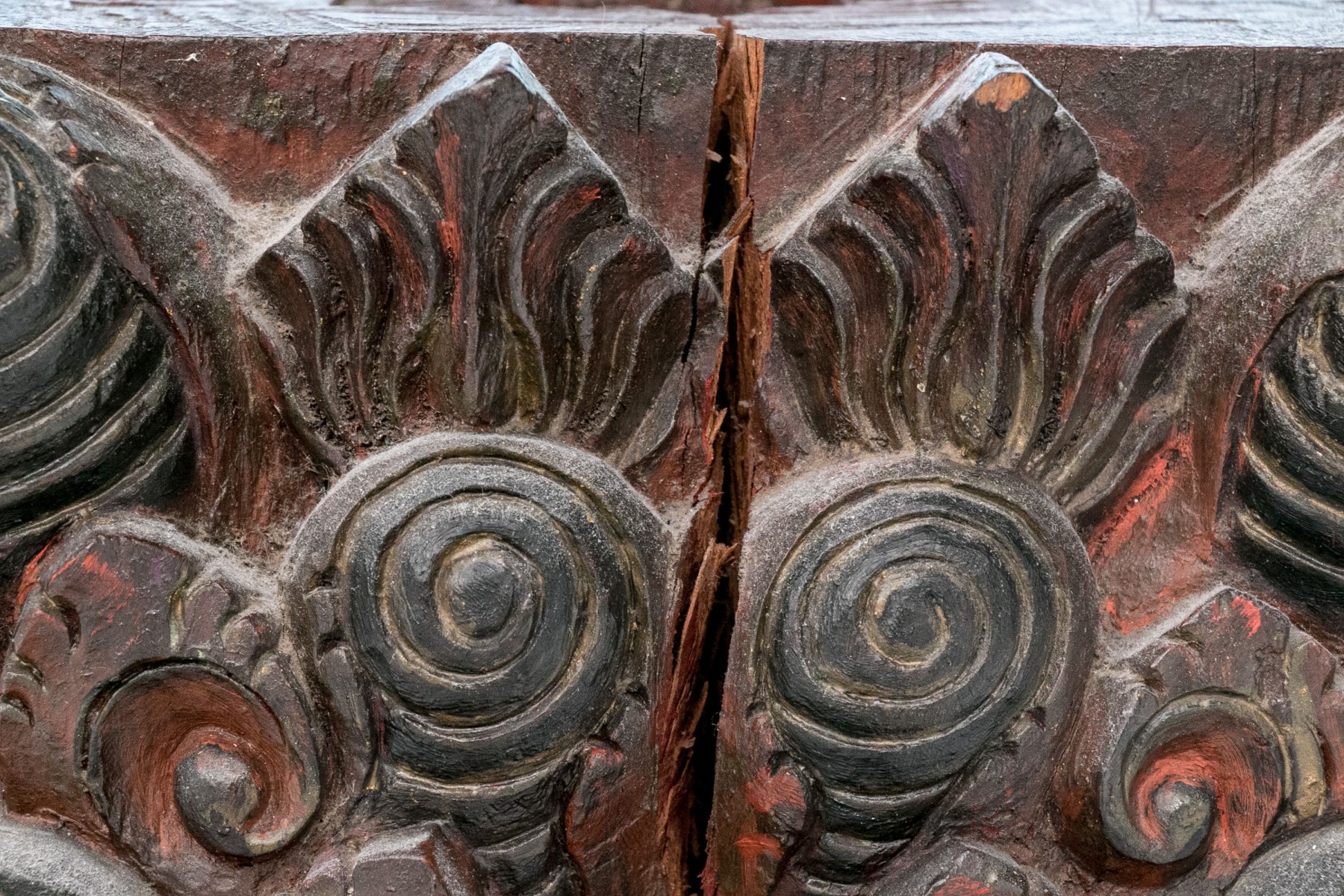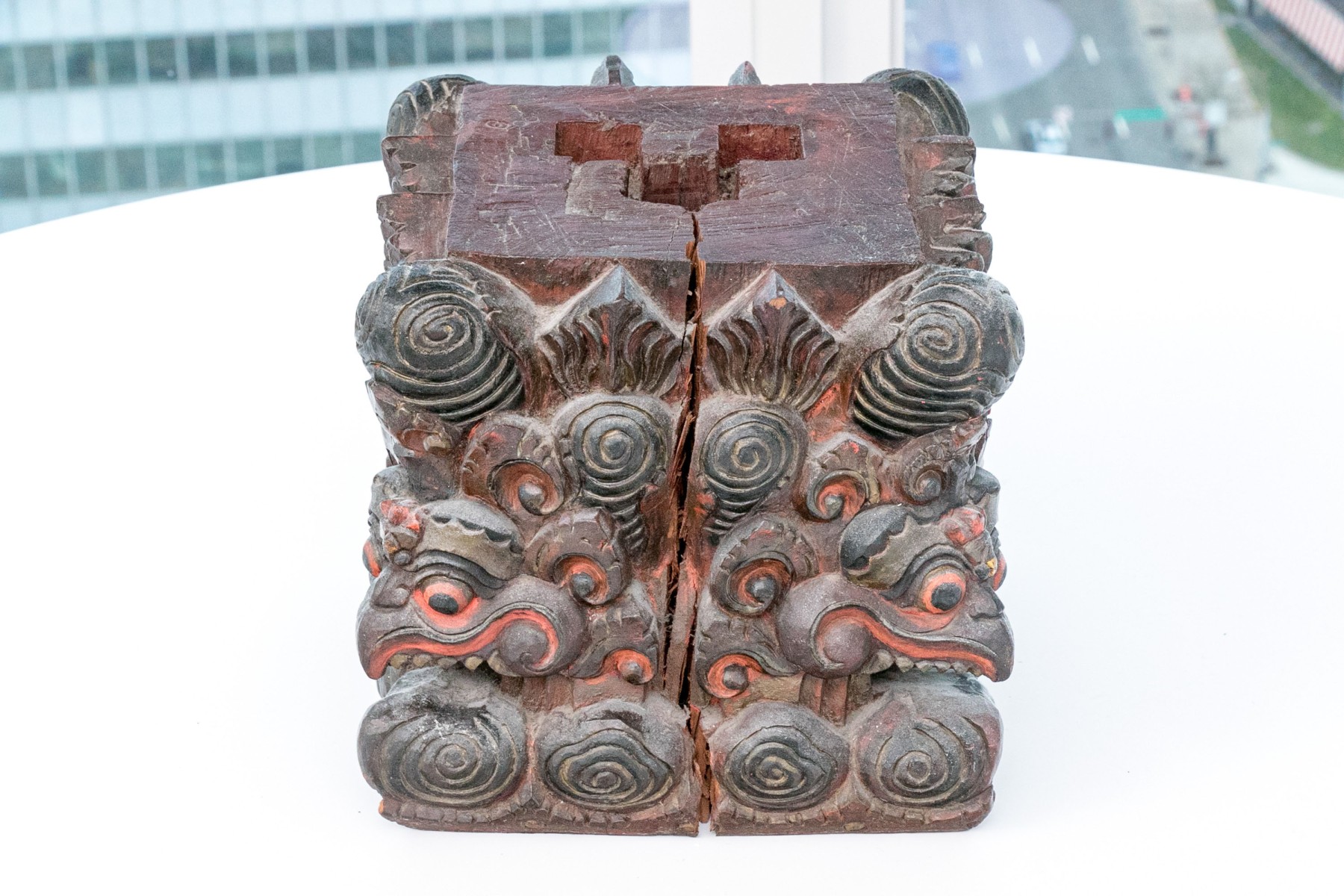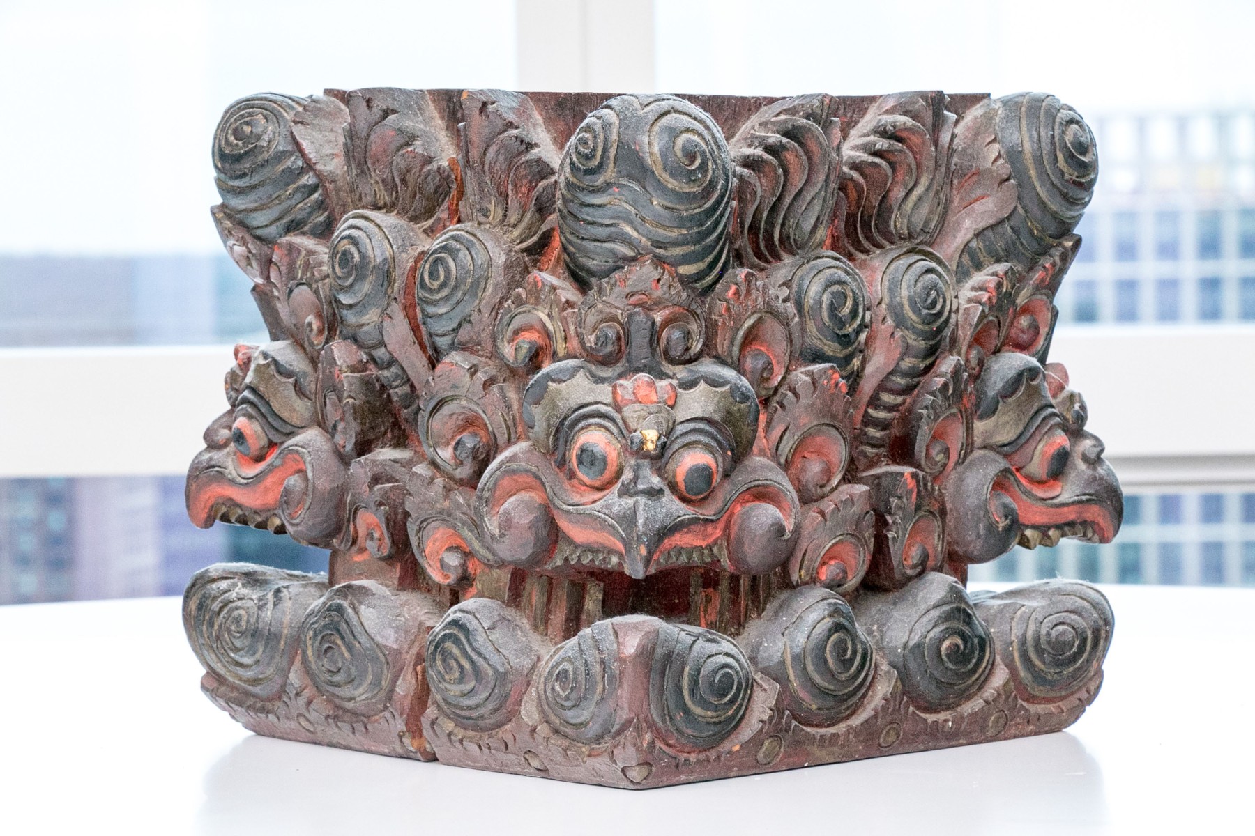 A black painted wood base with high relief carving with heads of monsters with beaks and sharp teeth and red details overall. High relief scrolls and pointed motifs above and below. The top with a carved opening for an attachment.