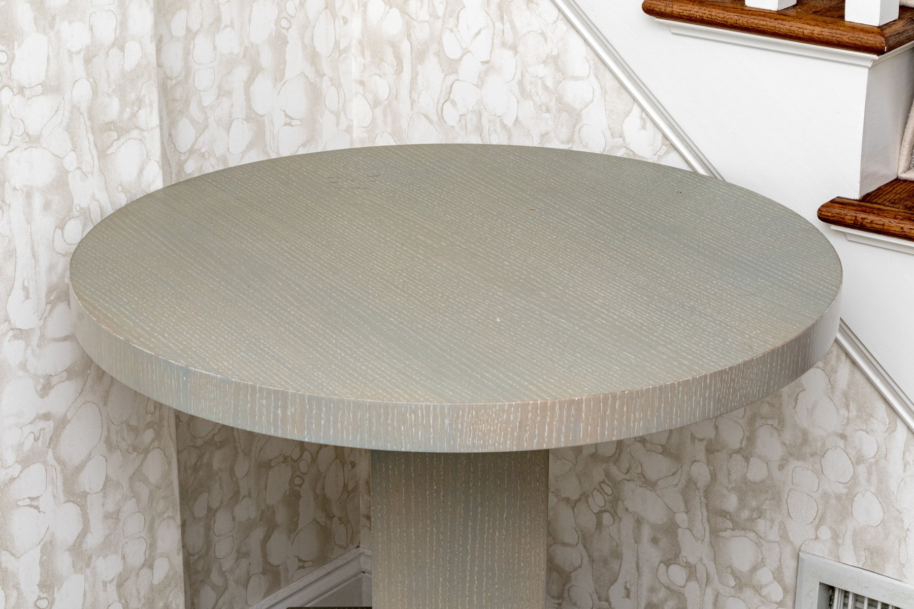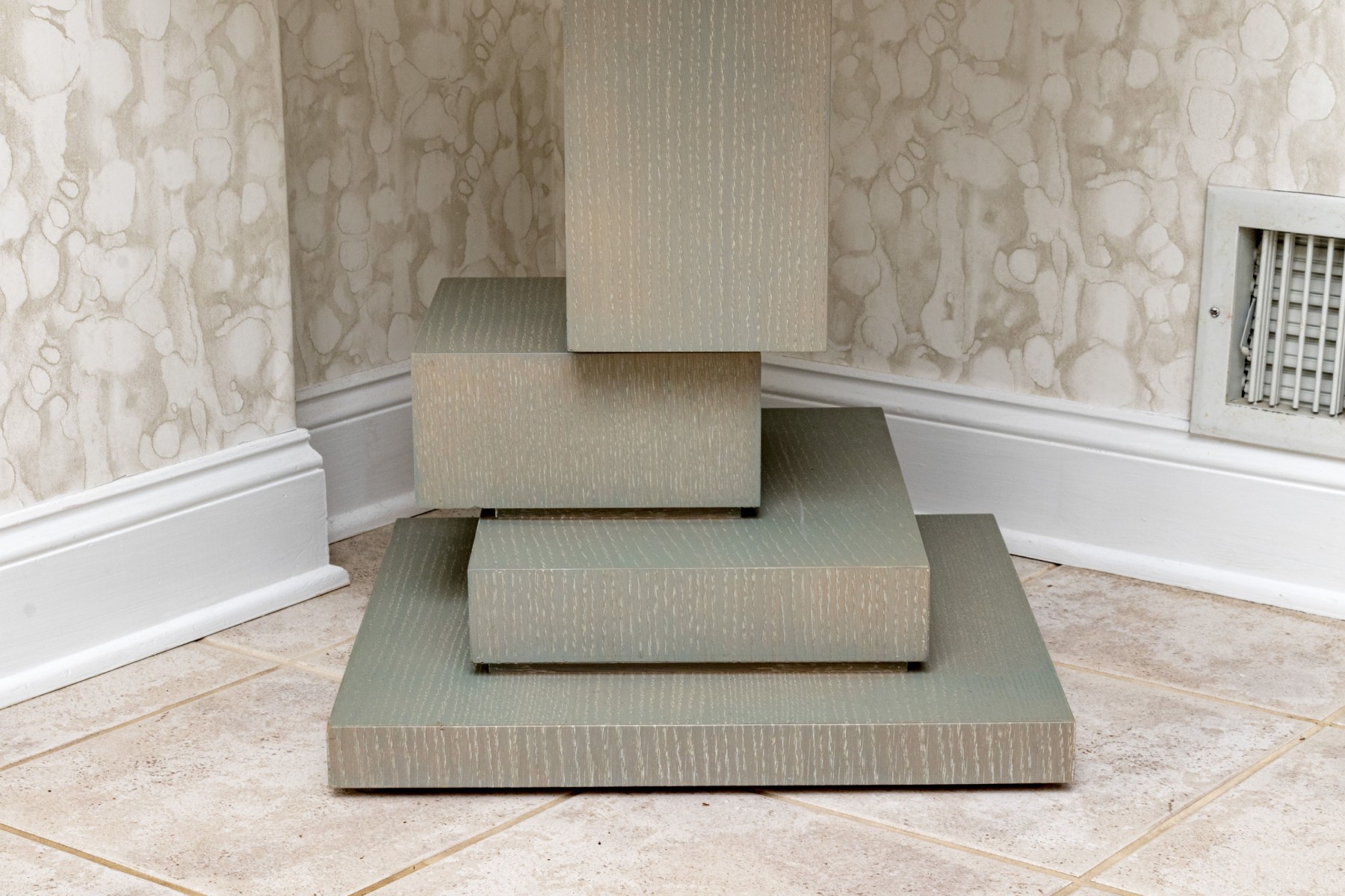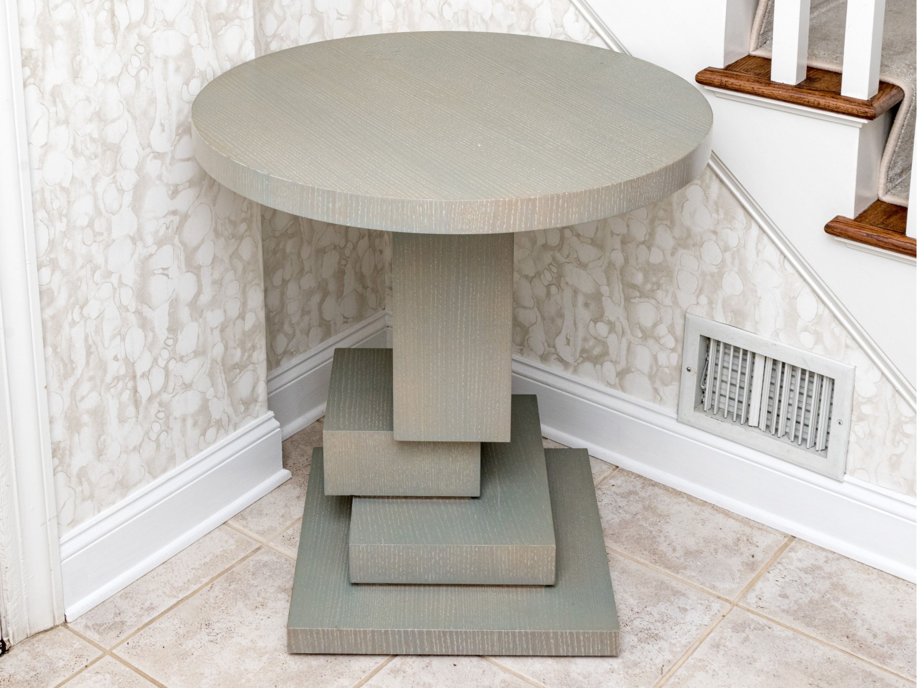 An eye-catching Century accent table in a brushed gray painted finish. Features a circular top over a cubist, asymmetrically stepped pedestal column on a square base.