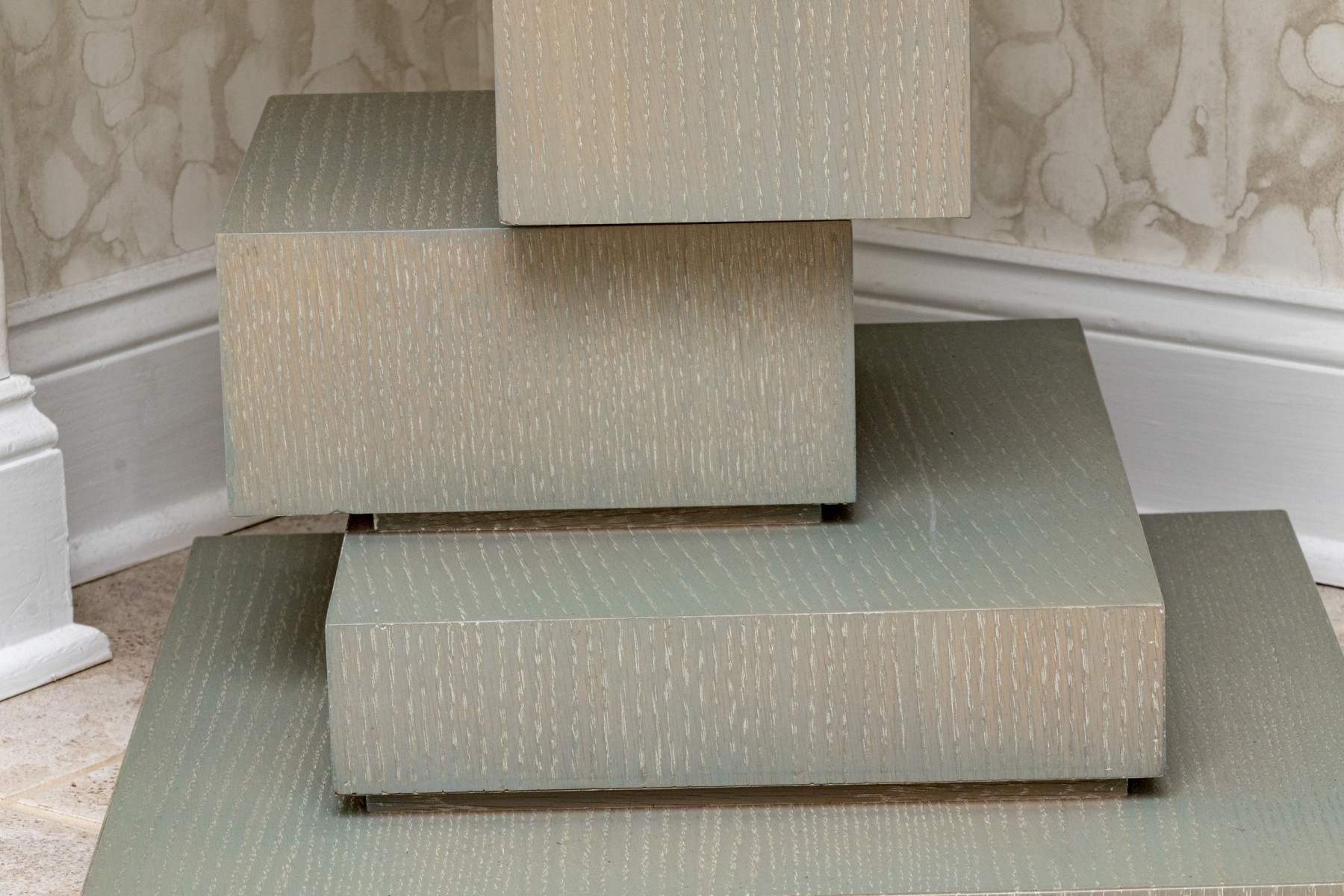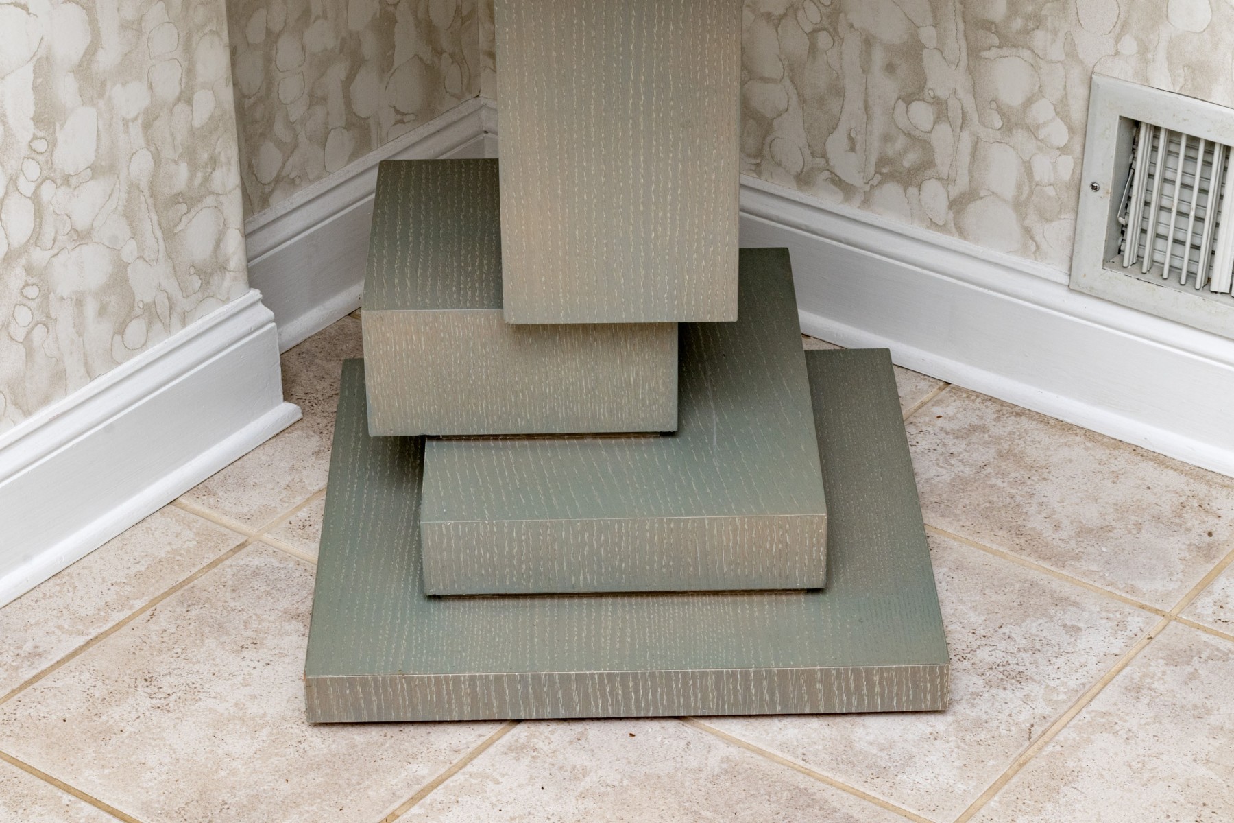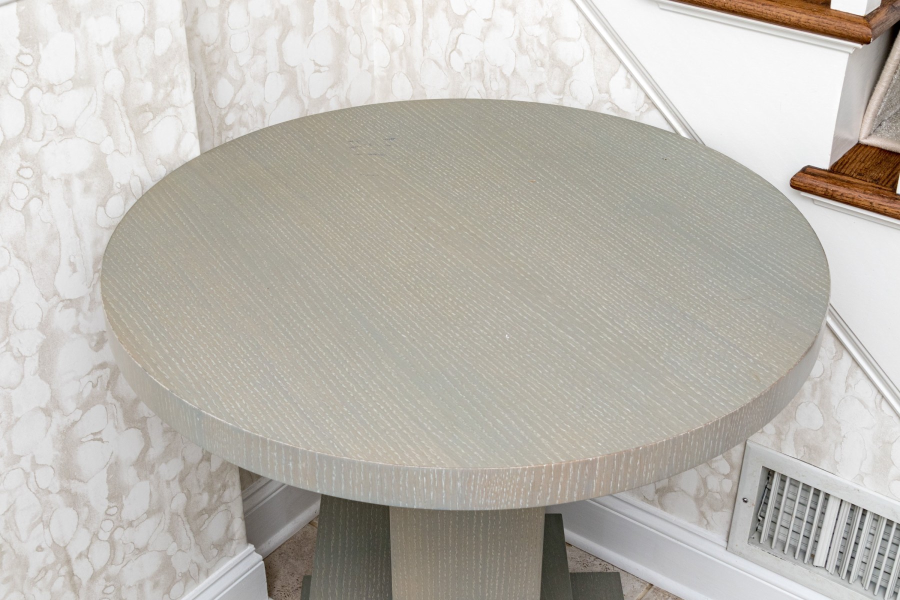An eye-catching Century accent table in a brushed gray painted finish. Features a circular top over a cubist, asymmetrically stepped pedestal column on a square base.