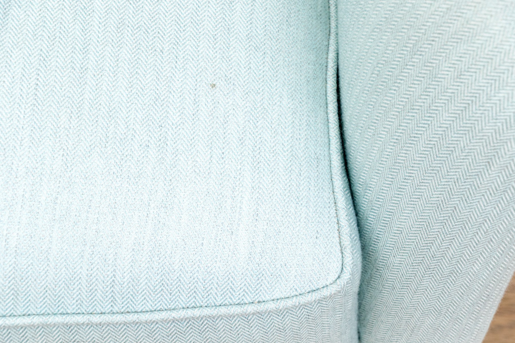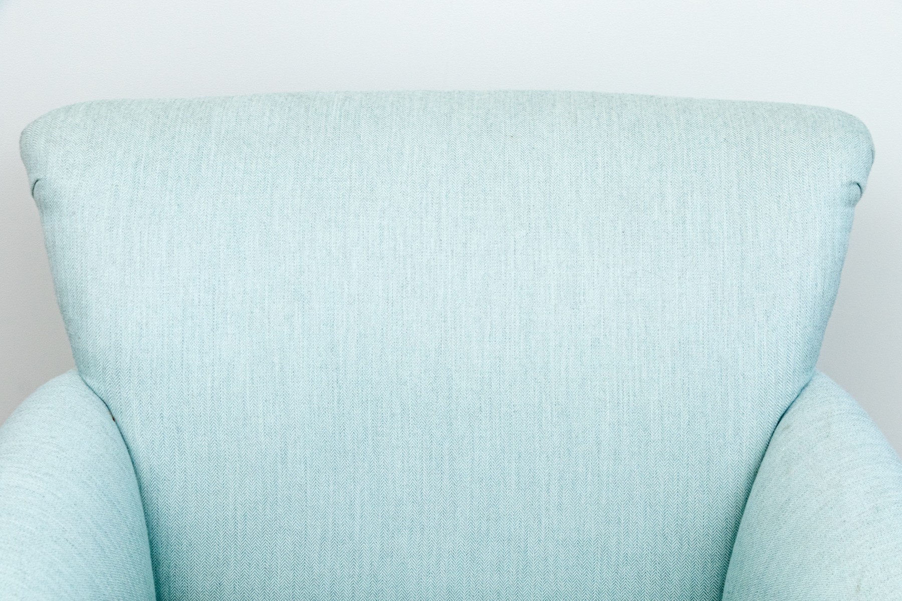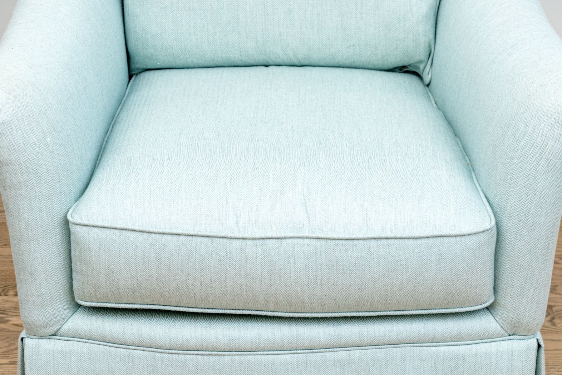 Upholstered in a charming light blue hued fabric; the swivel armchair features an apron to conceal the swivel base underfoot. The chair with rolled arms, a rolled seat back with loose upholstered seat cushion with piped trim, in addition to a loose upholstered seat back cushion.