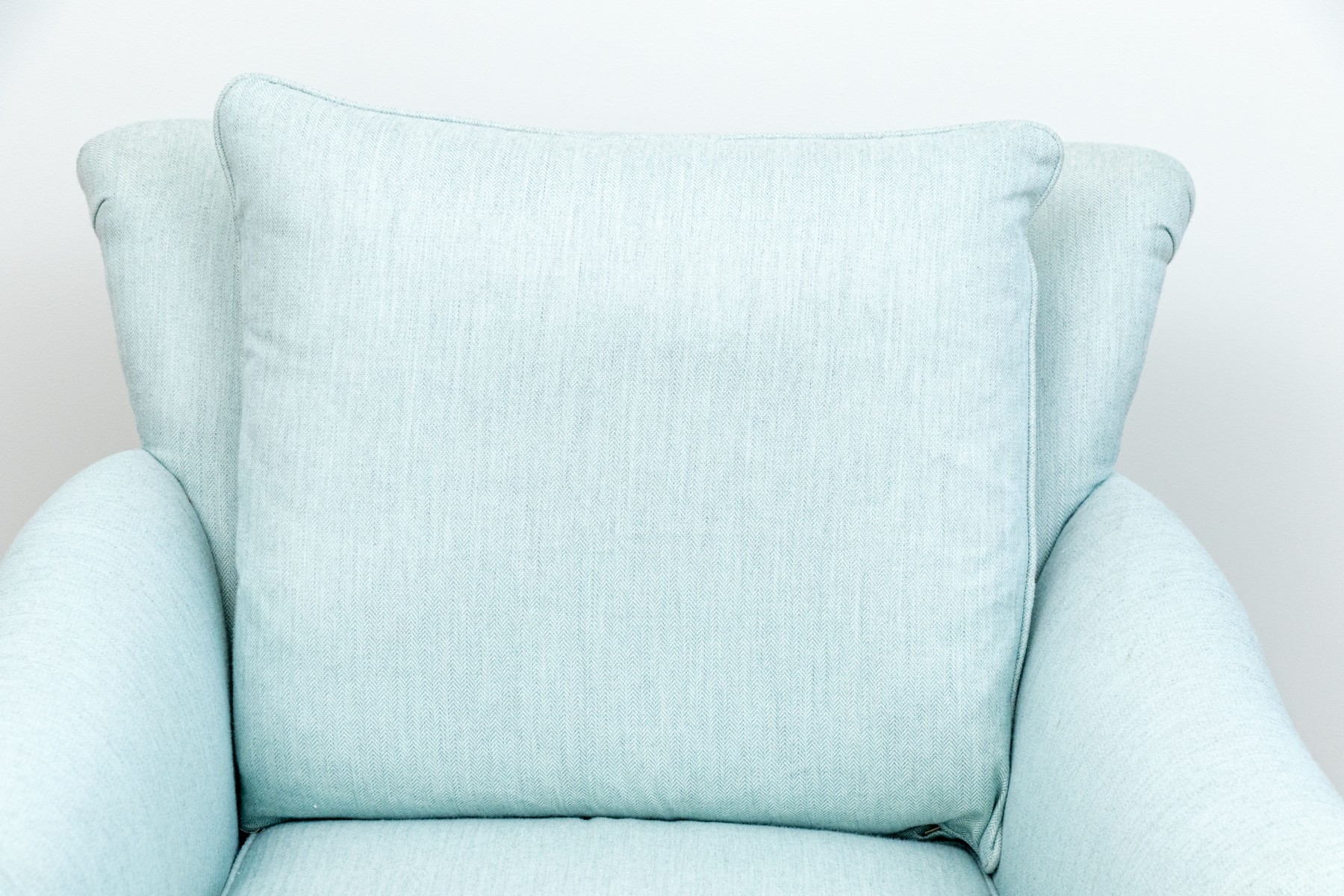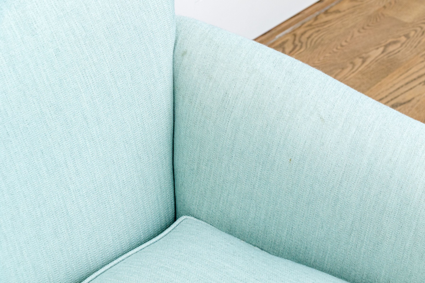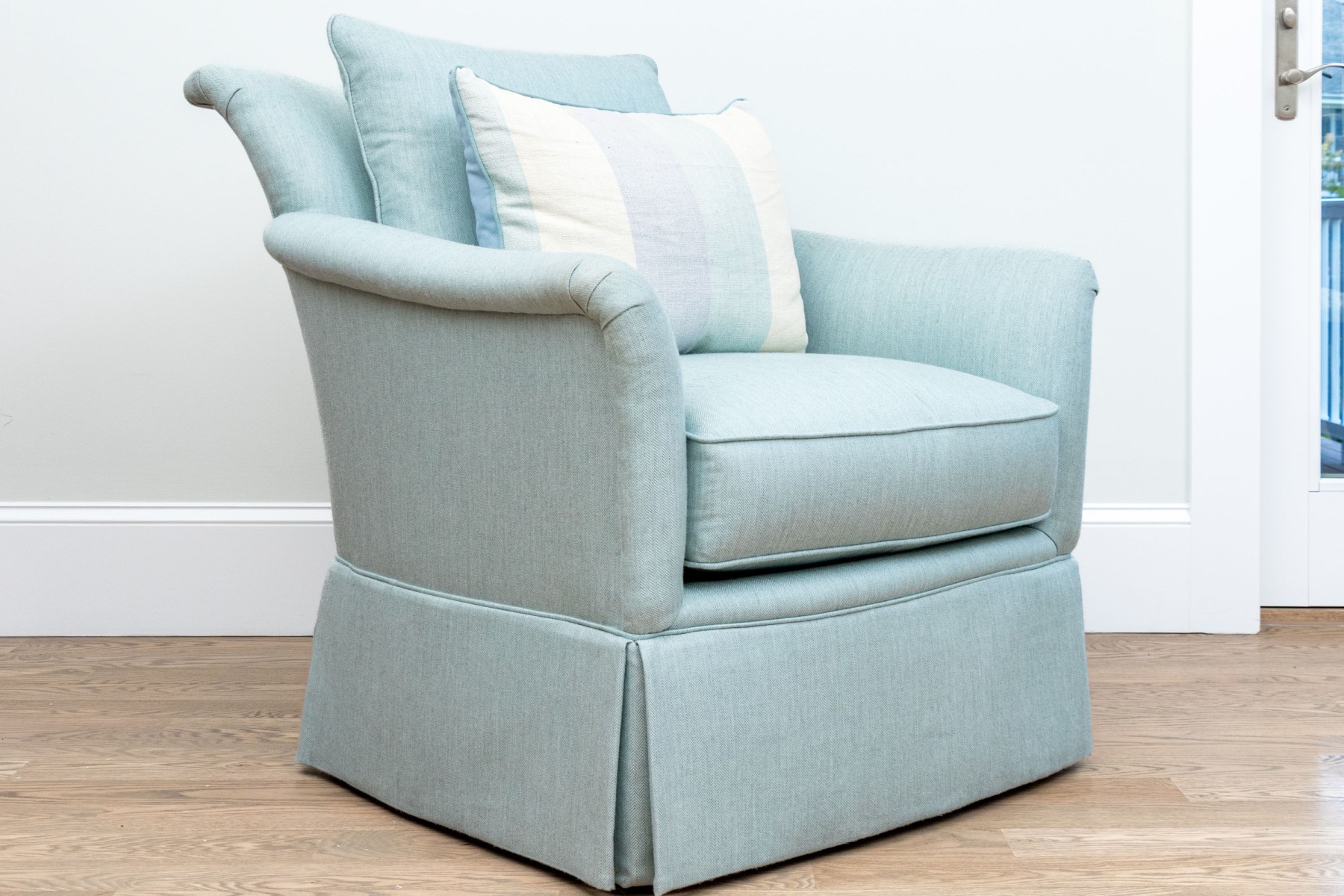 Upholstered in a charming light blue hued fabric; the swivel armchair features an apron to conceal the swivel base underfoot. The chair with rolled arms, a rolled seat back with loose upholstered seat cushion with piped trim, in addition to a loose upholstered seat back cushion.