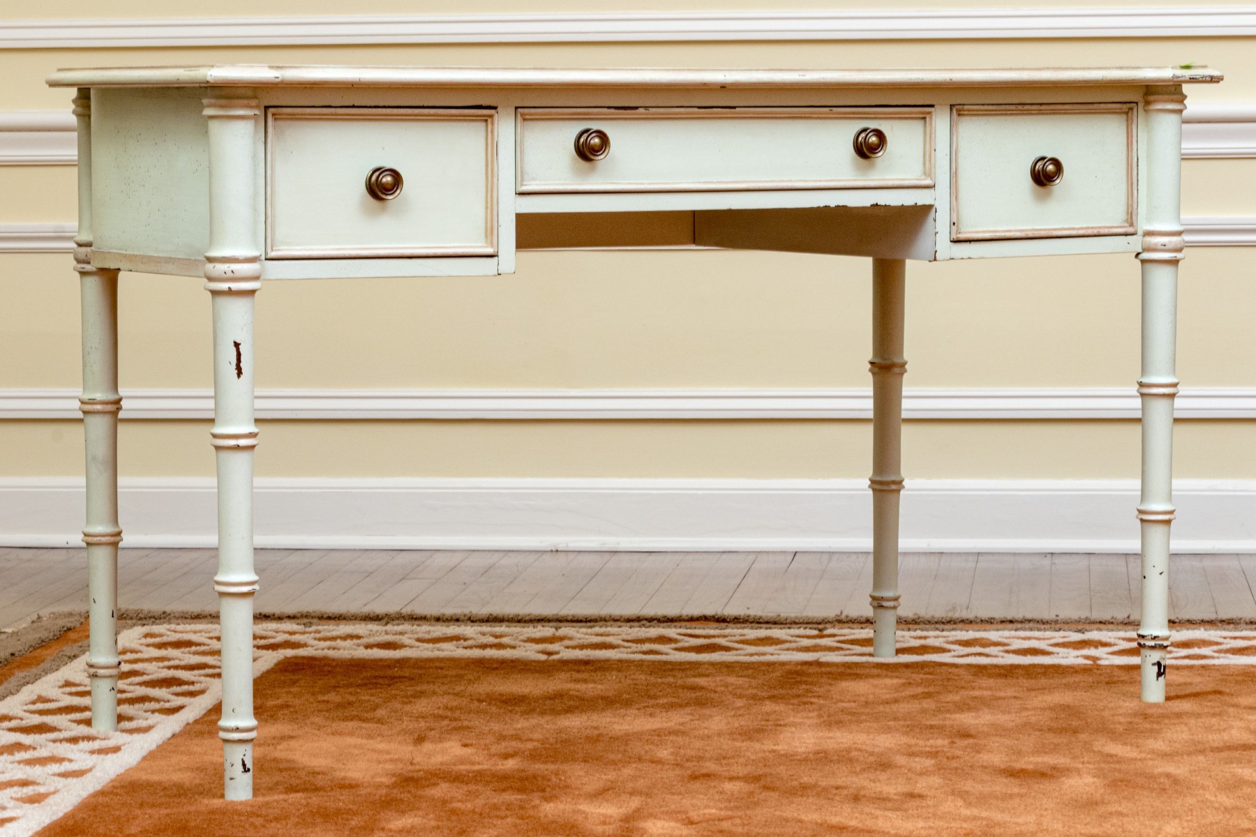 The desk is wonderfully raised on four carved, faux bamboo form legs, the case is fitted with a pair of short drawers flanking a central long drawer. All with brass knob drawer pulls.