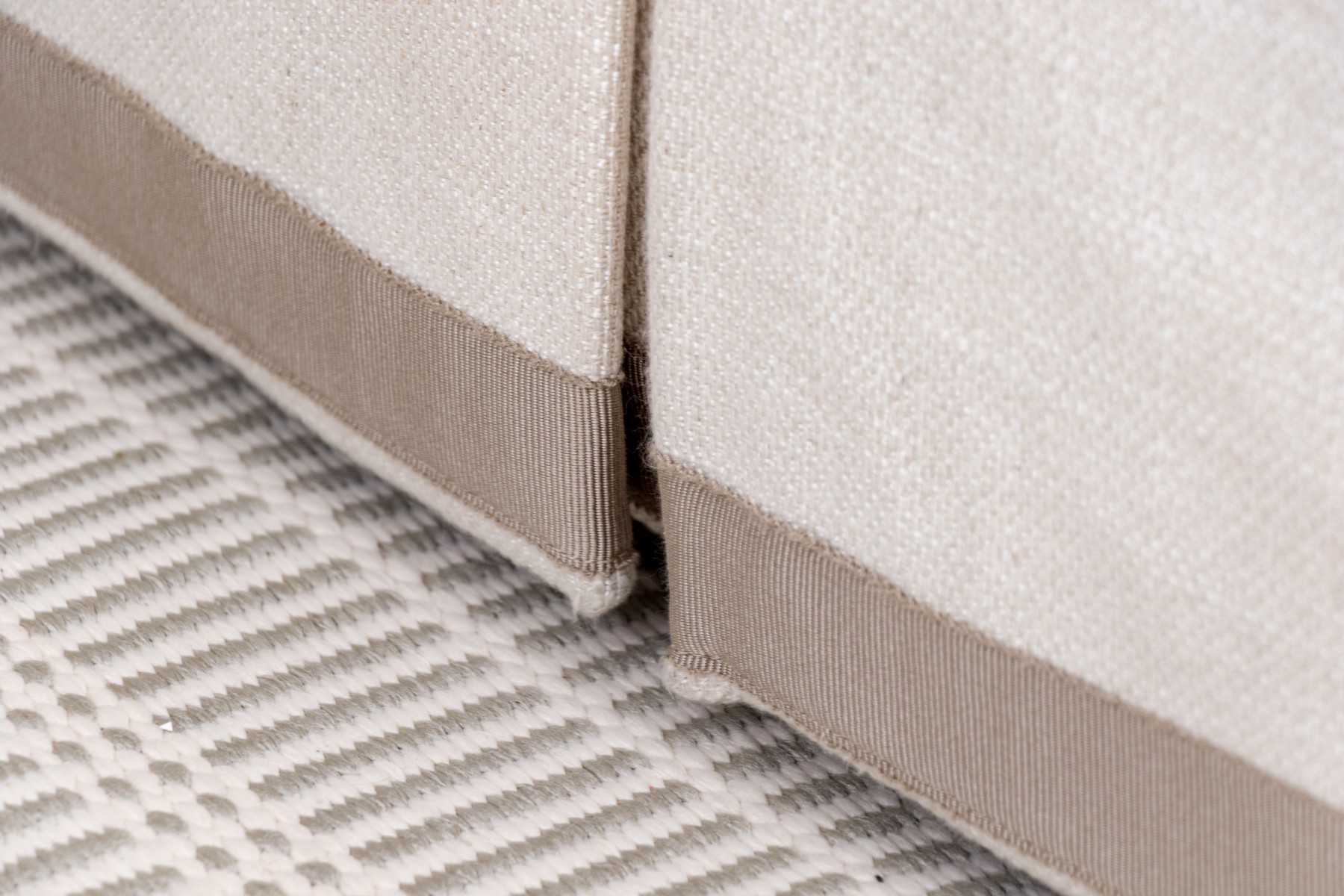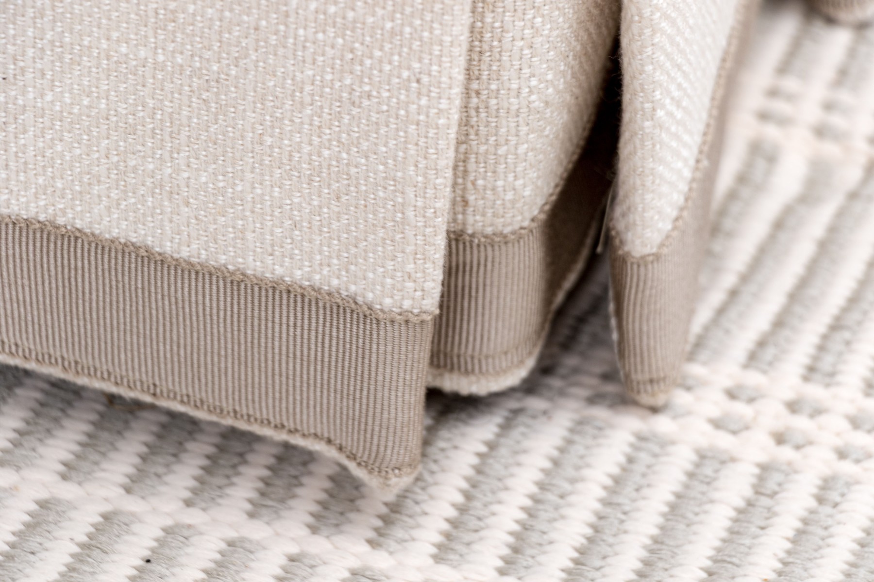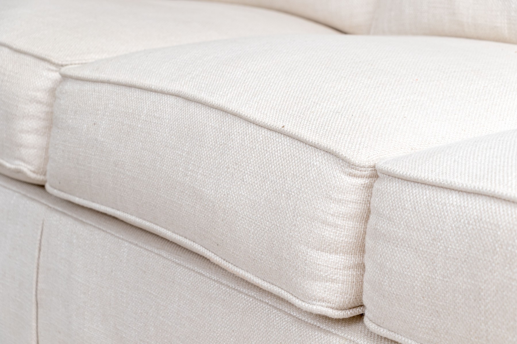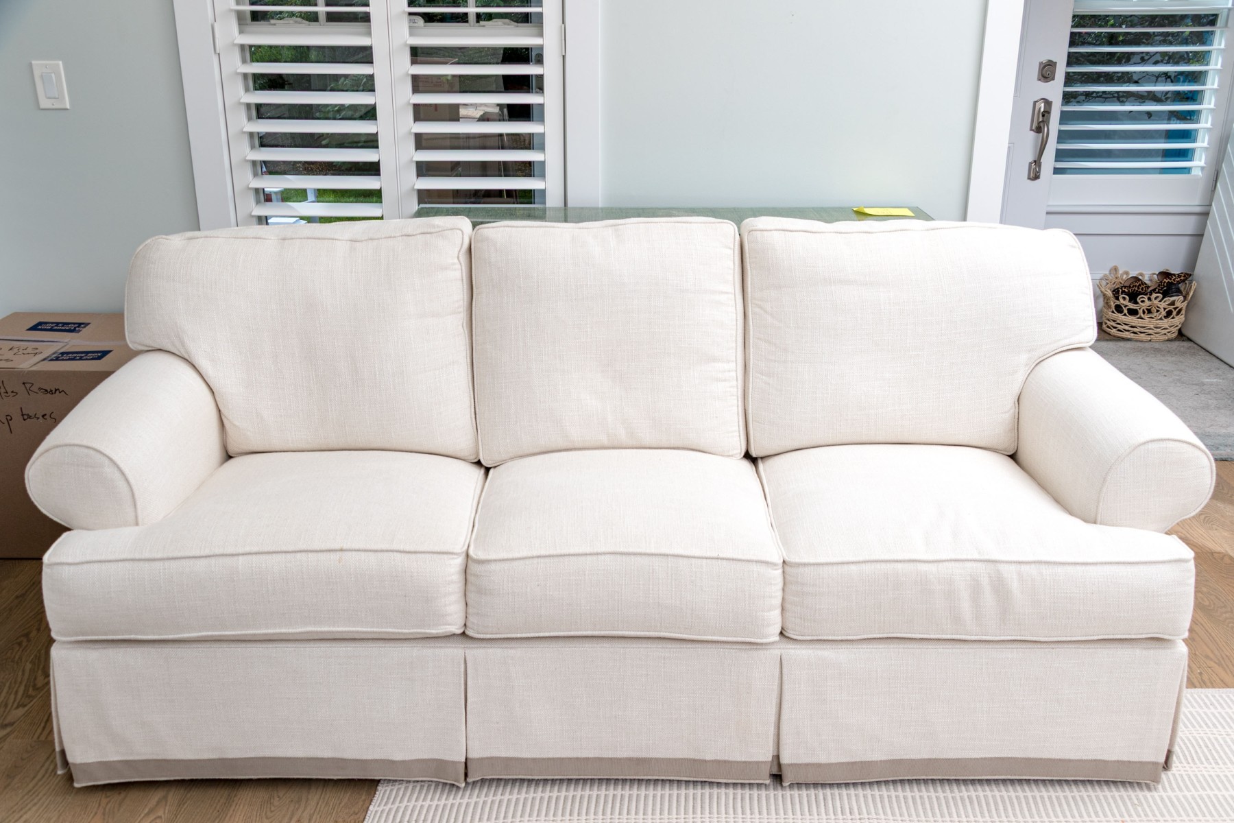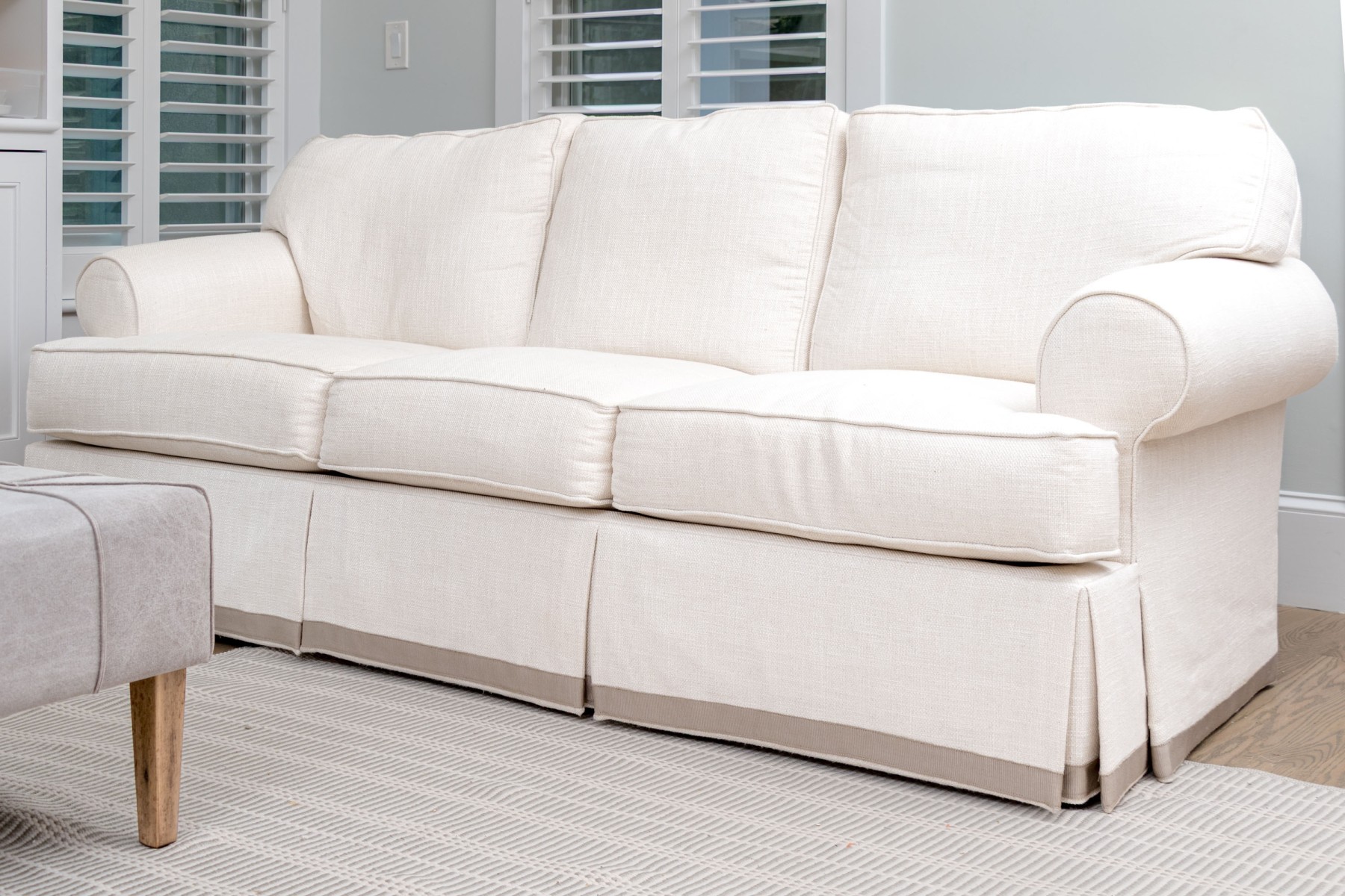 A charming Century Furniture "Cornerstone" three seater sofa with classic transitional appeal, deigned with spring down medium cushion and fiber down back pillows. The sofa has an apron with decorative braided trim band to bottom of the sofa apron, just above foot to conceal underside with three loose seat cushions and three loose seat back.