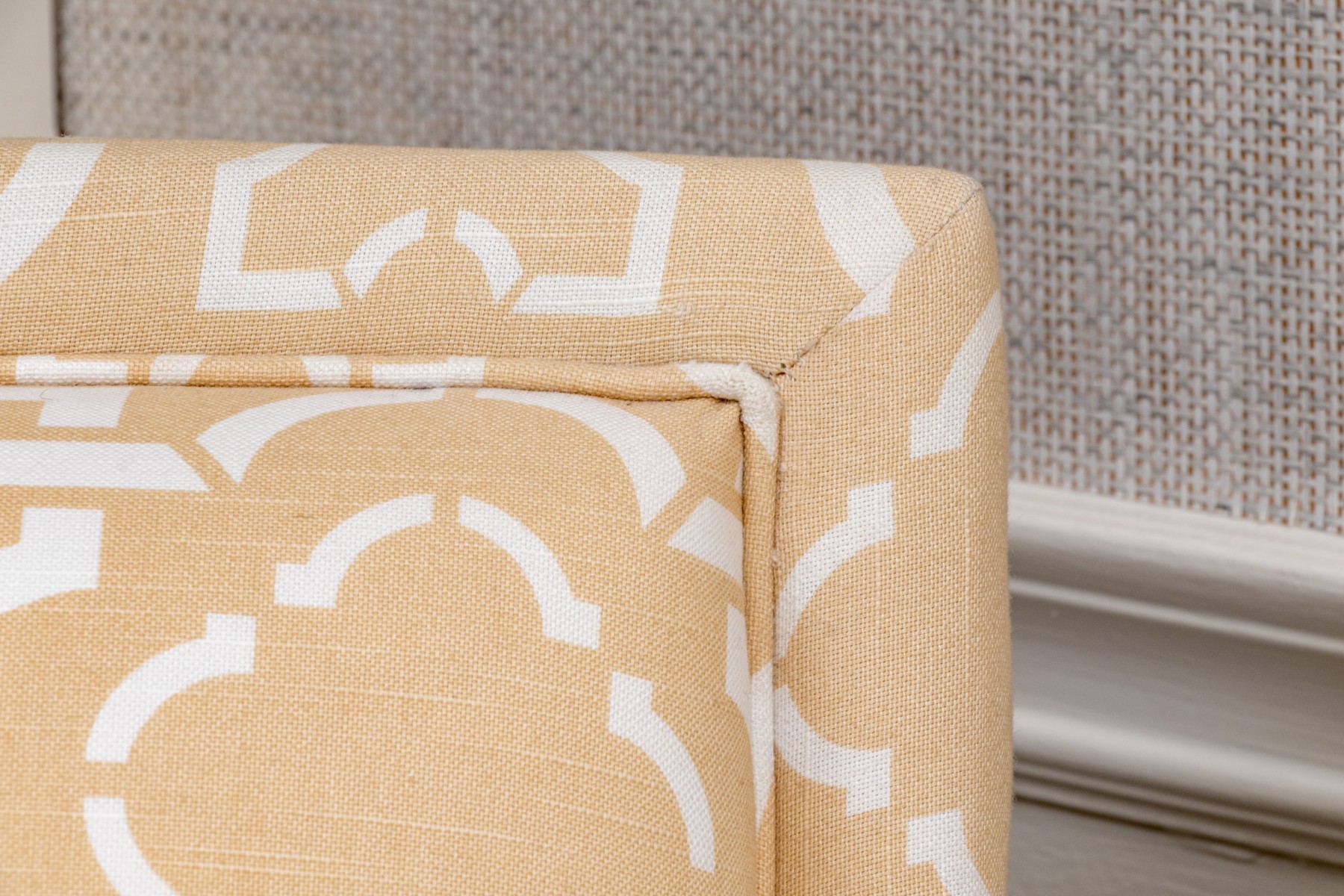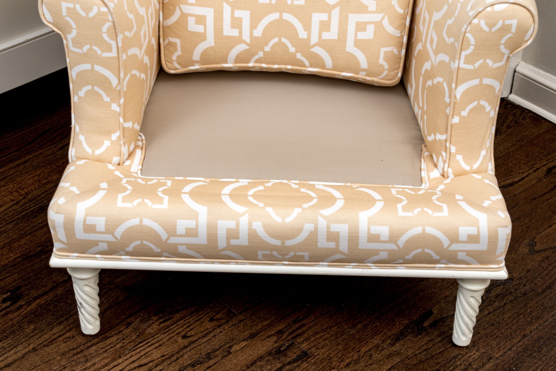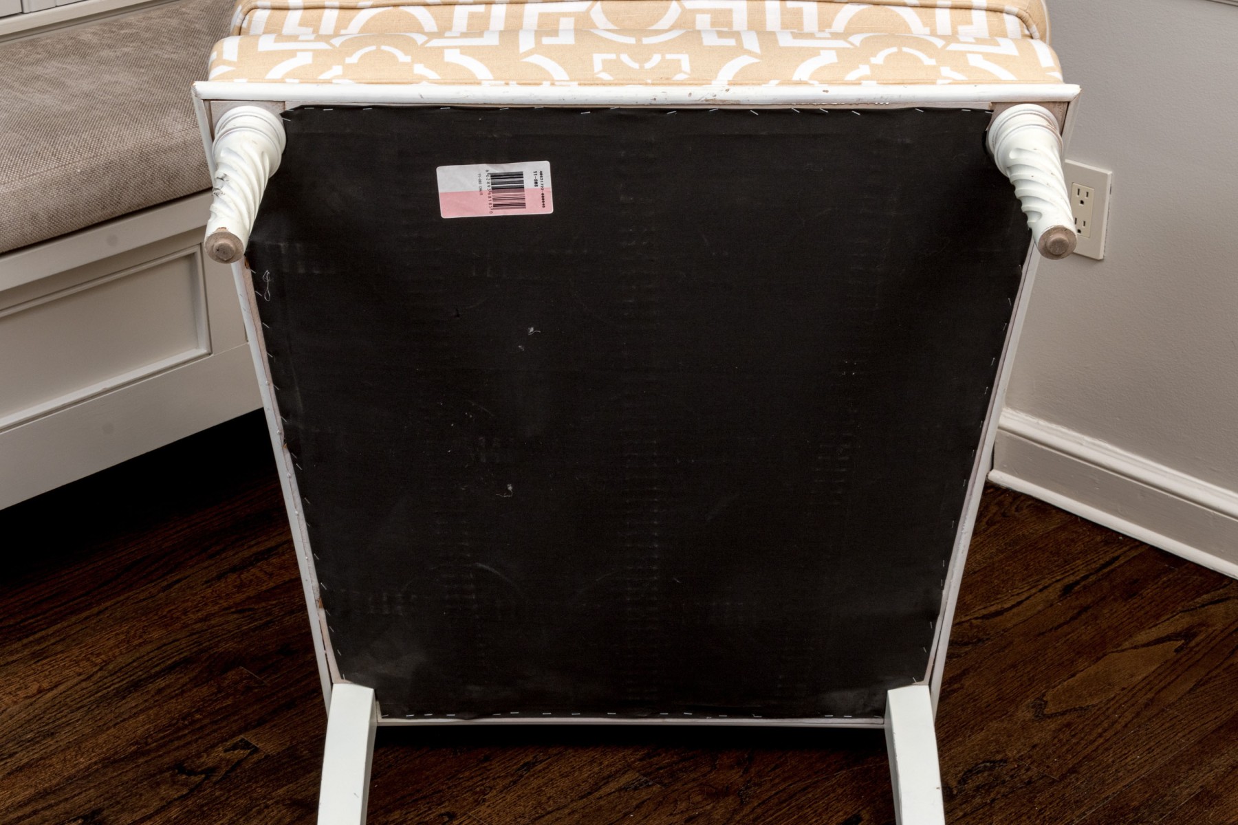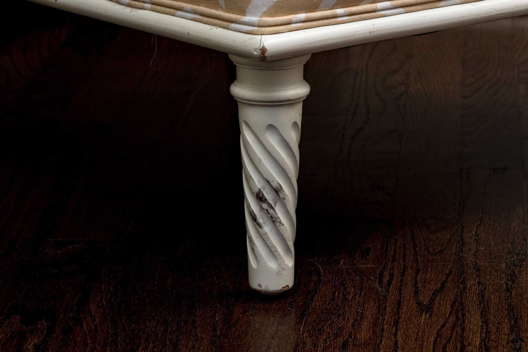 Fitted with a loose, upholstered cushion and raised upon twist turned, paint finished front legs.