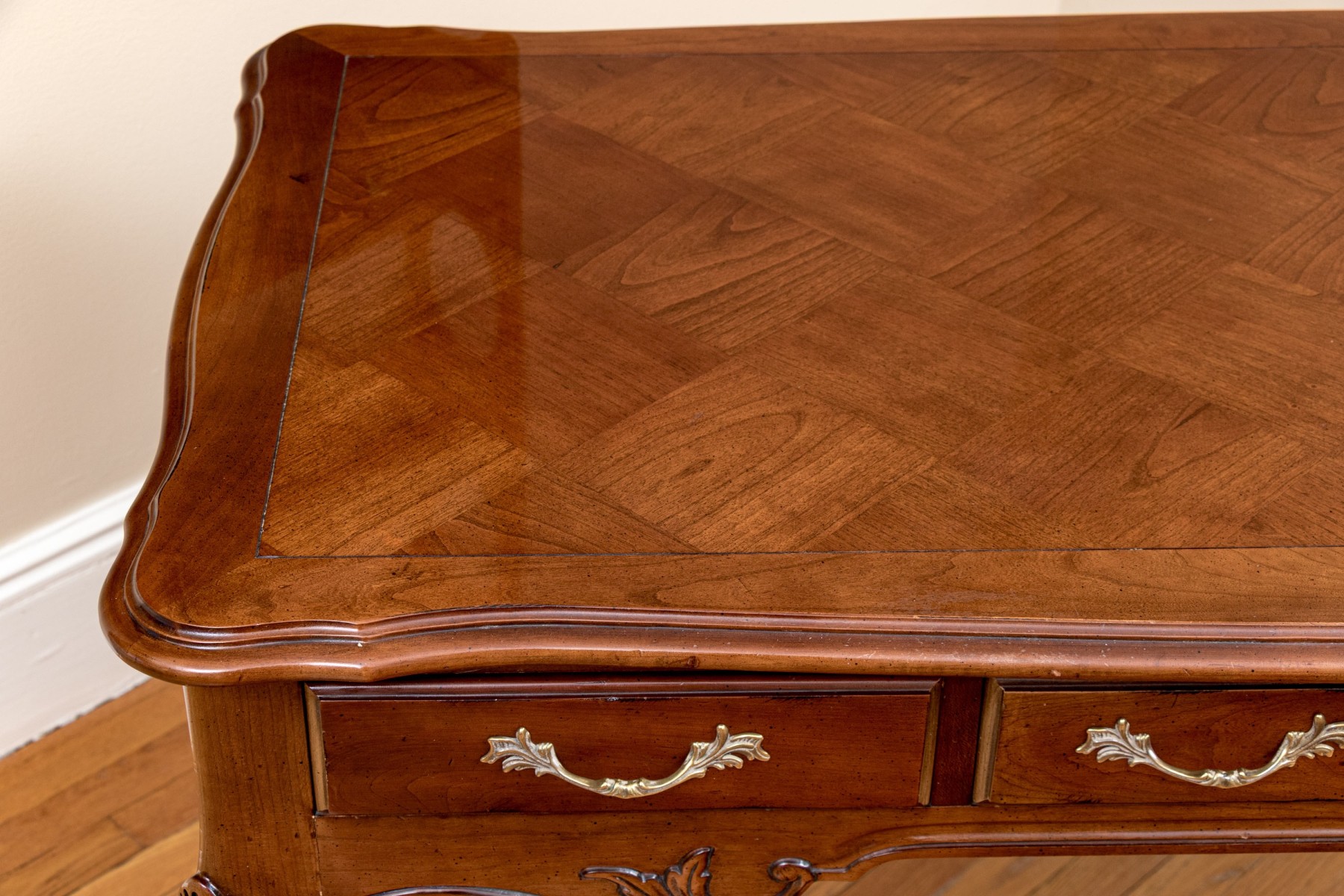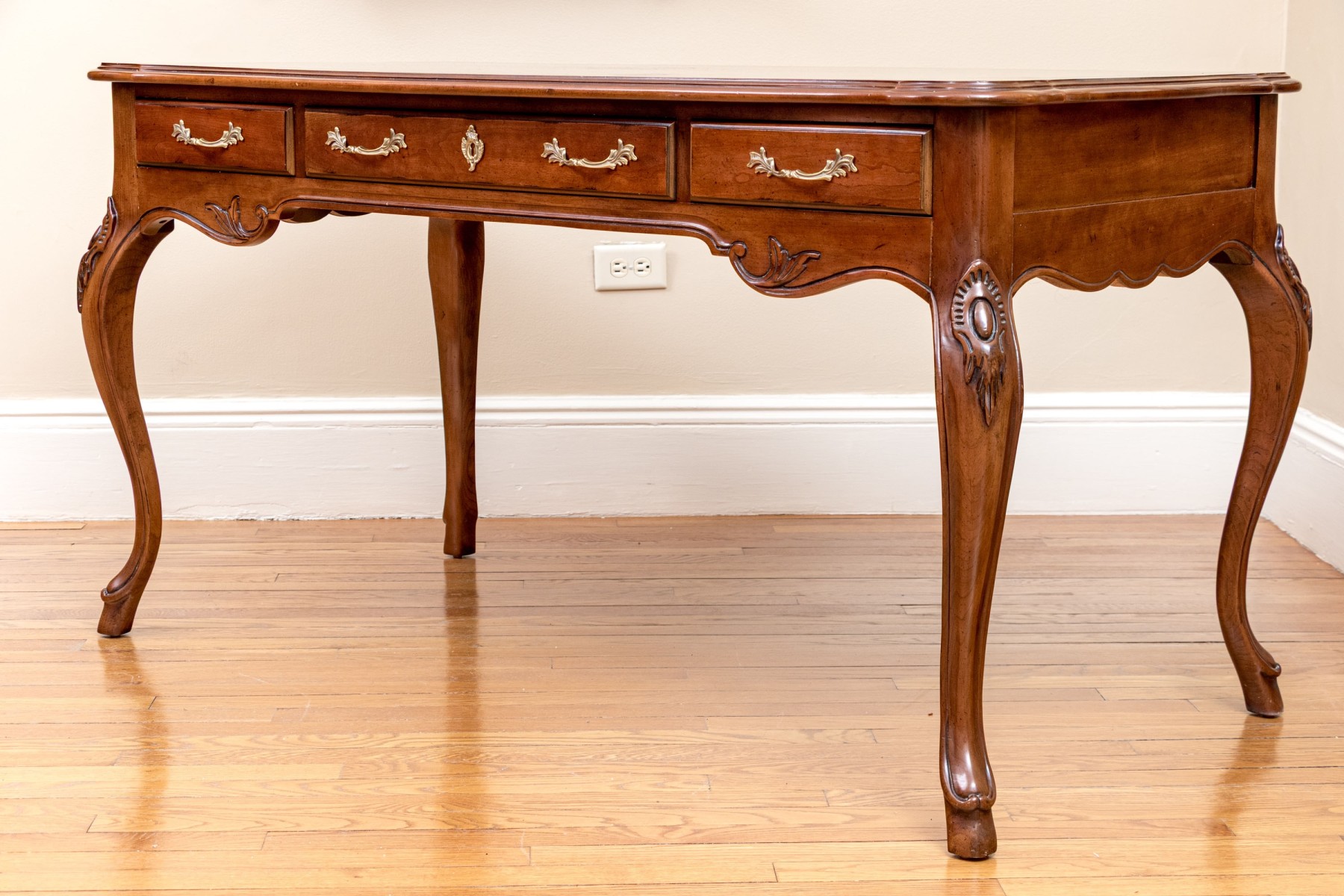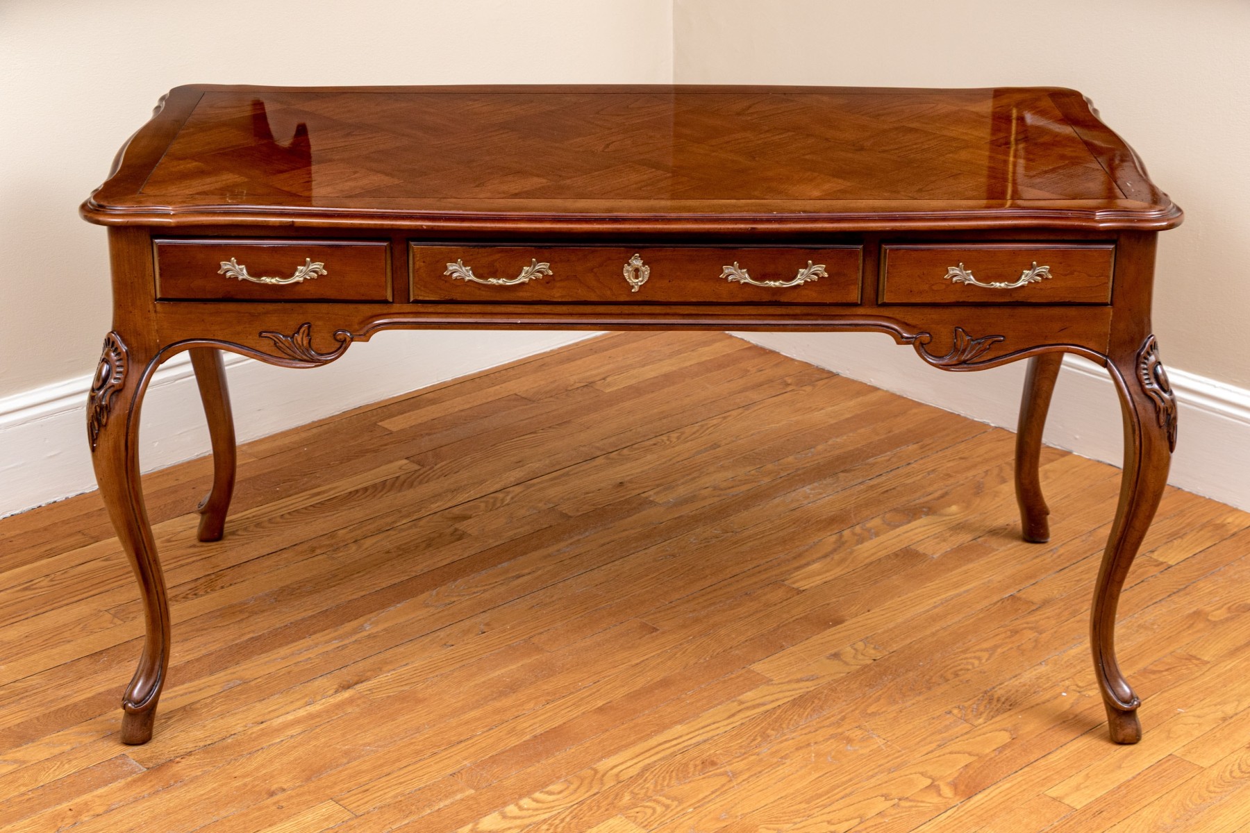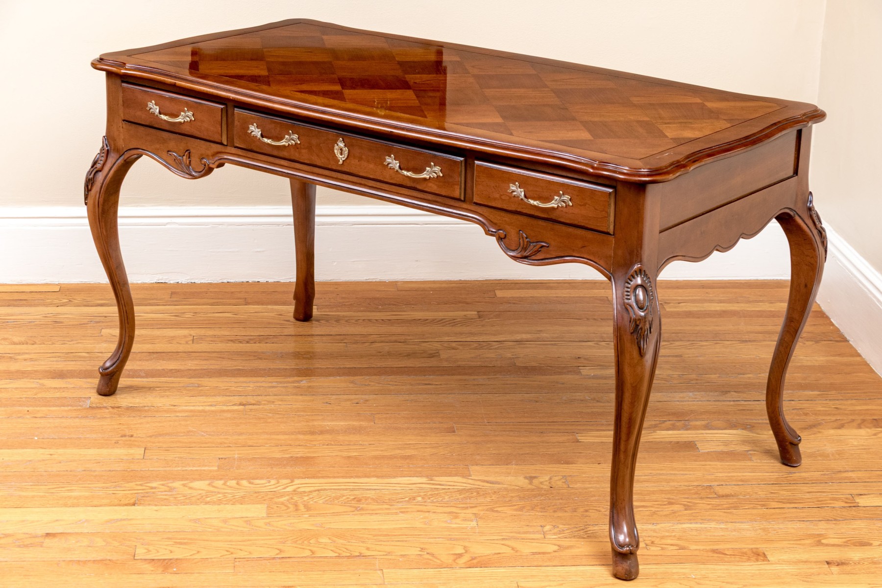 A high quality Century desk in classic Louis XV style, well crafted in rich, warm-toned medium brown wood with a gorgeous checkered marquetry top in a glossy finish. Fitted with three drawers adorned with brass foliate handles and raised over a carved apron with relief flourishes on the knees of cabriole legs.