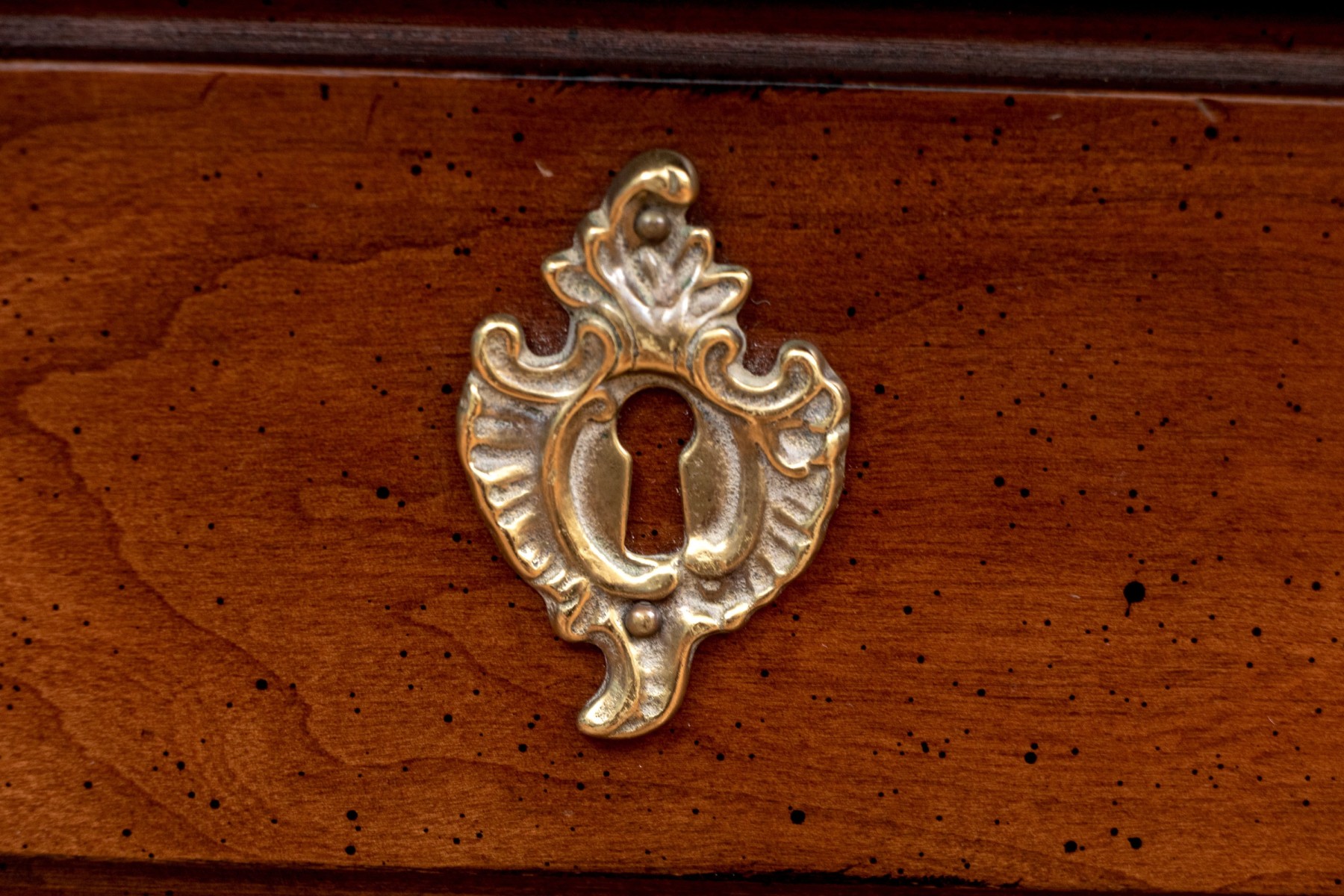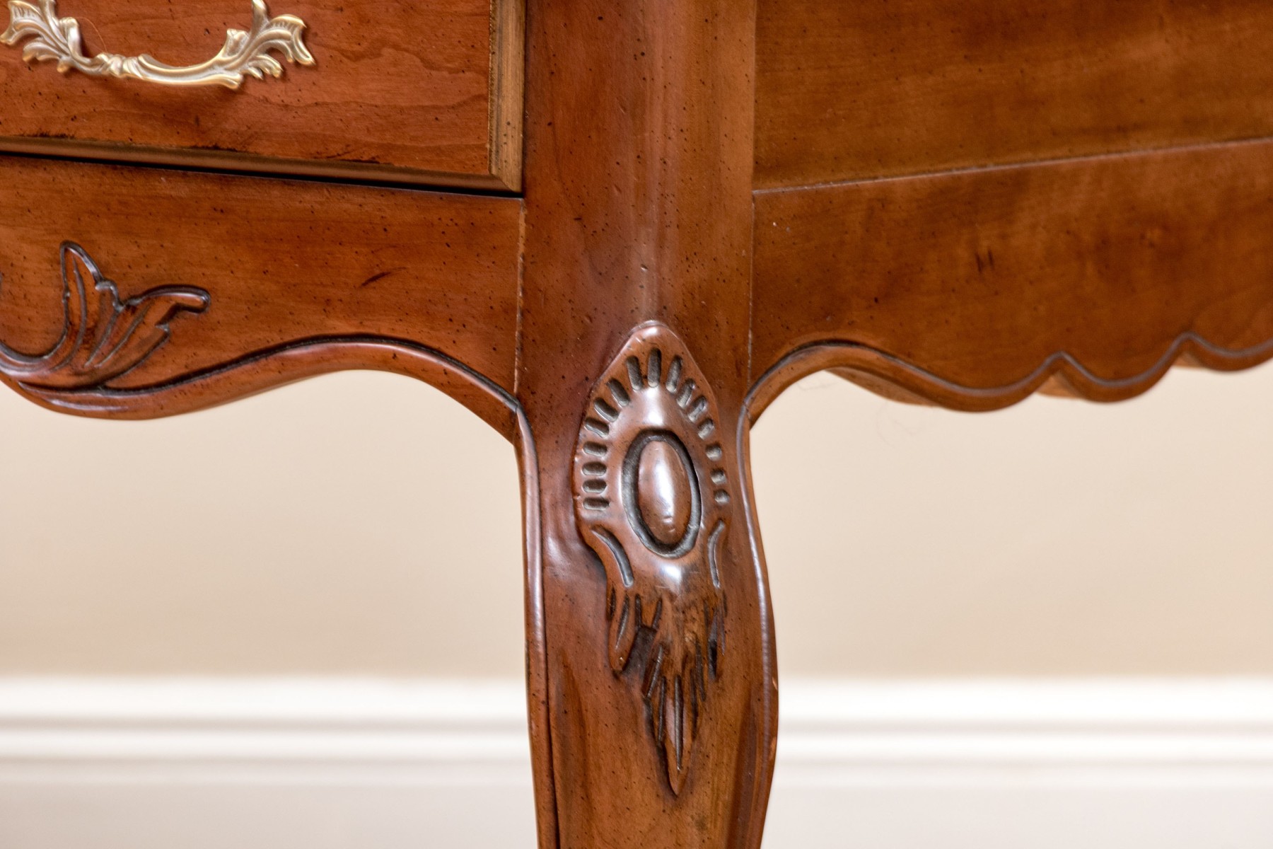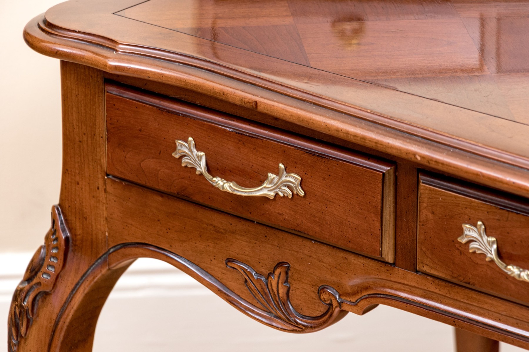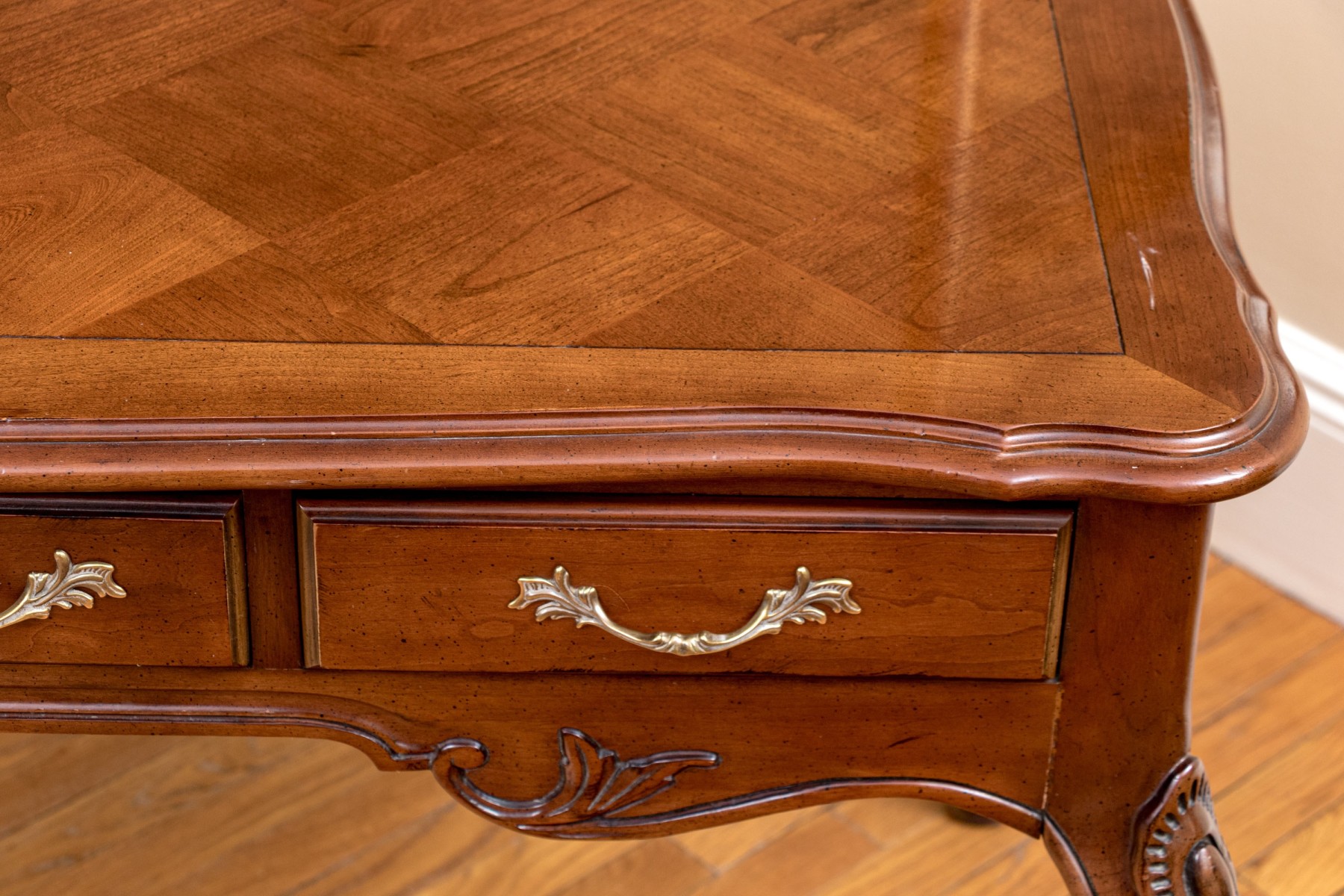 A high quality Century desk in classic Louis XV style, well crafted in rich, warm-toned medium brown wood with a gorgeous checkered marquetry top in a glossy finish. Fitted with three drawers adorned with brass foliate handles and raised over a carved apron with relief flourishes on the knees of cabriole legs.