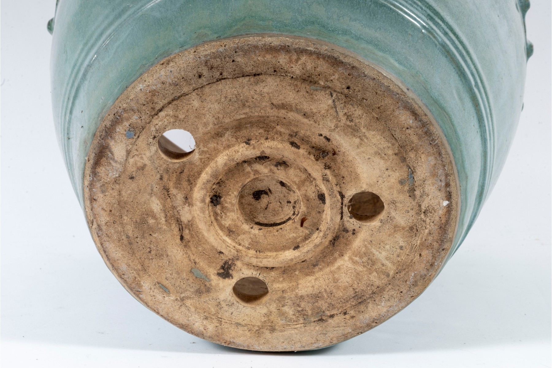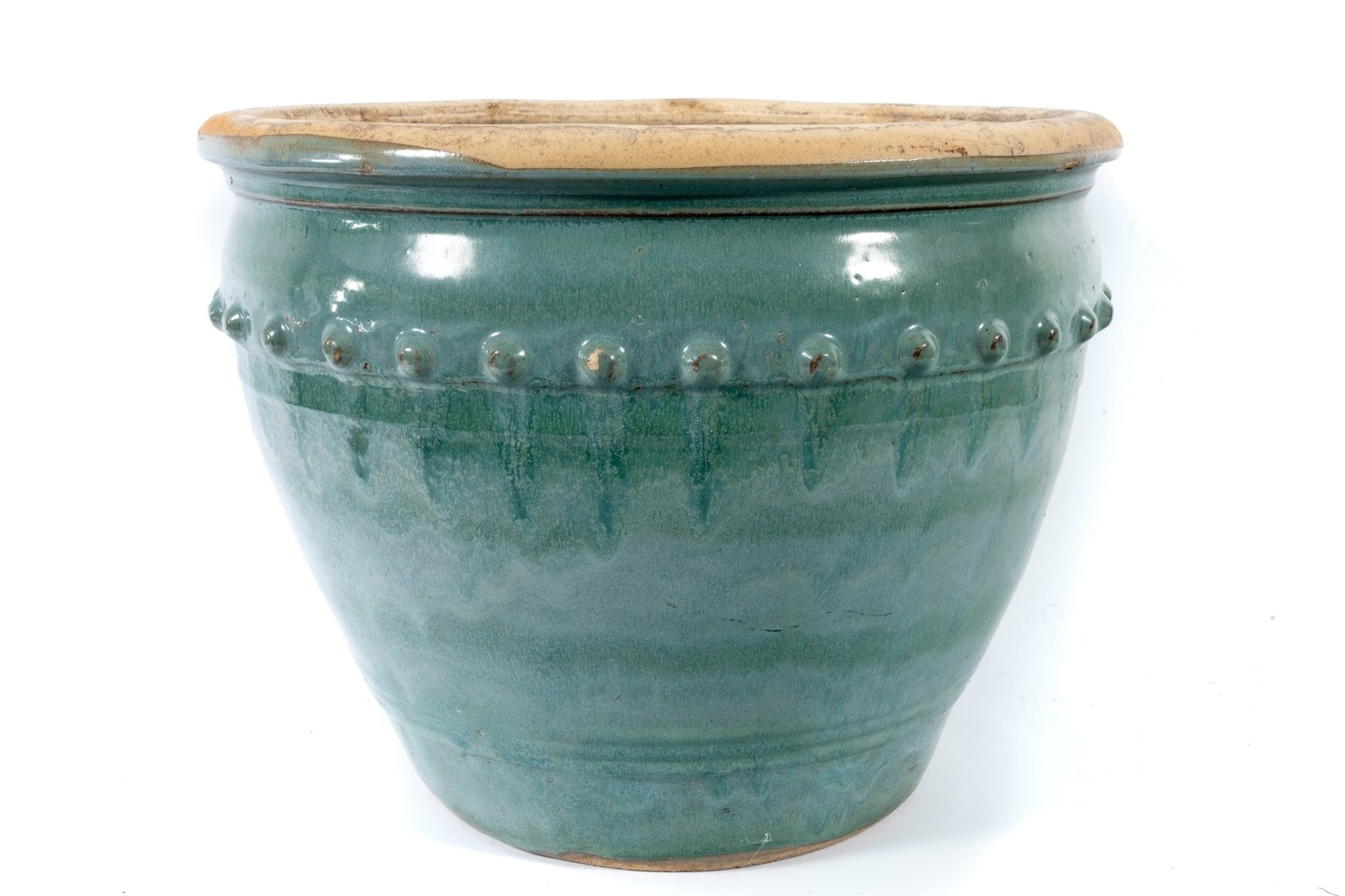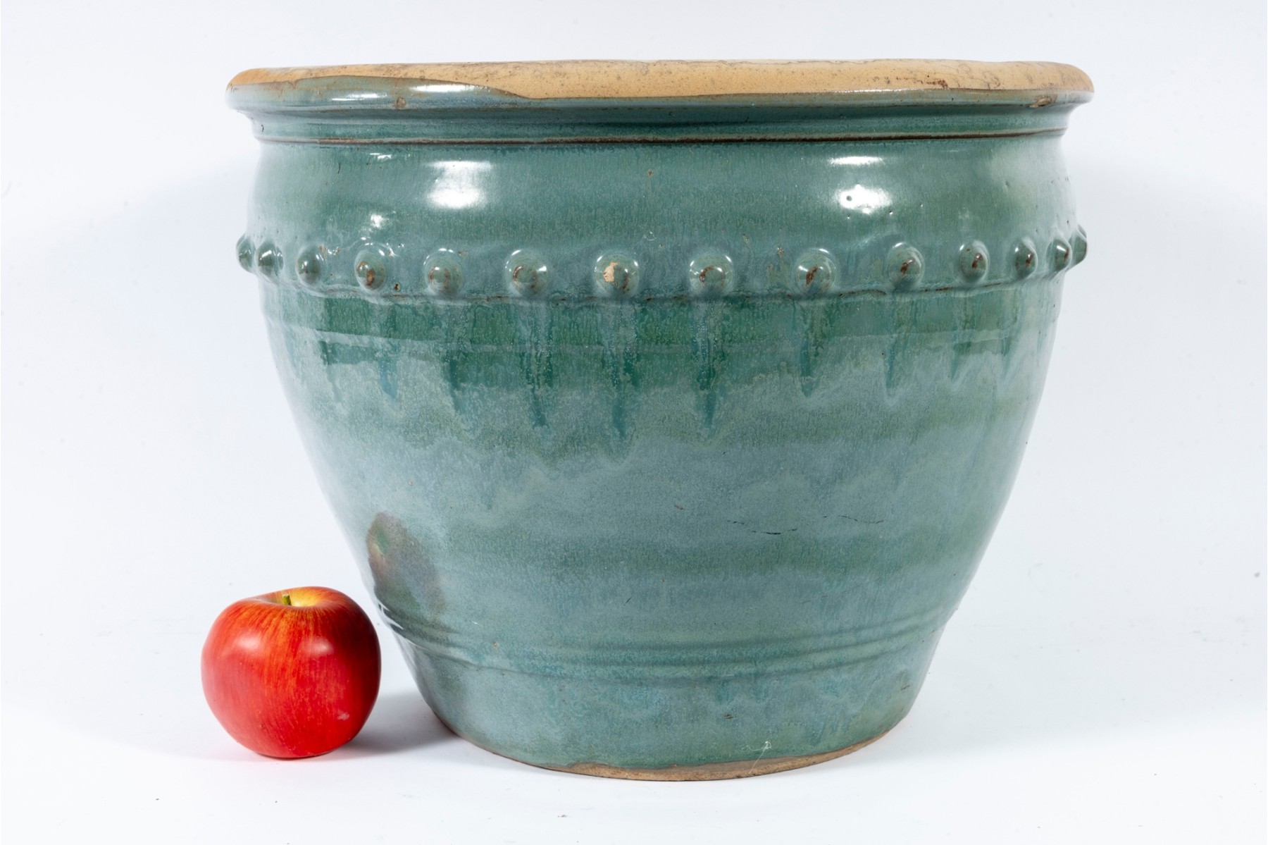 A handsome ceramic planter pot with a stout, flared rim over a rotund apple shaped body in an eye-catching teal celadon glaze with drippy green and blue variations in color adding excellent visual interest. Detailed with a border of hobnails around the top, and subtle ringed borders near the foot. Finished with three drainage holes in the bottom.