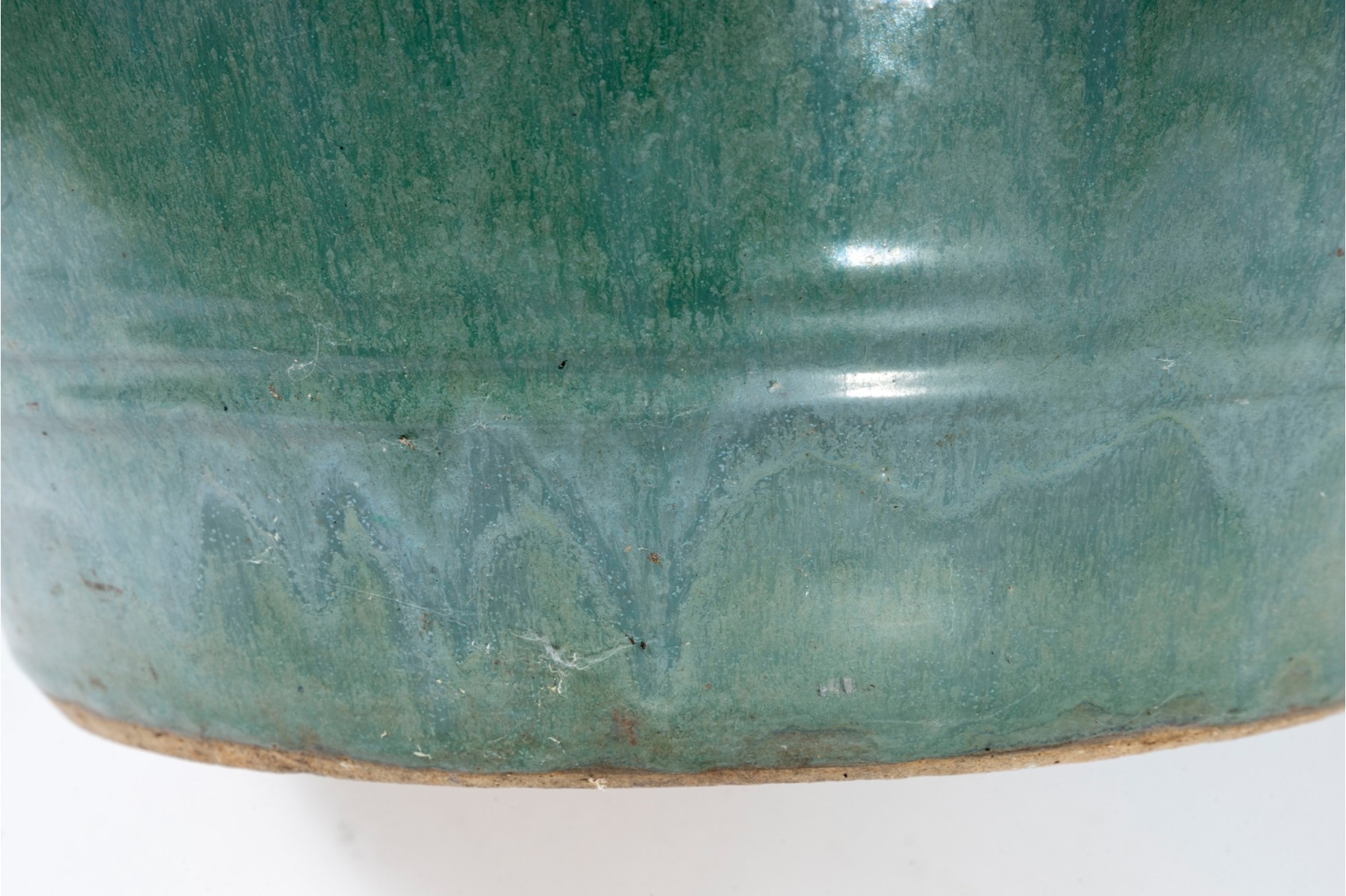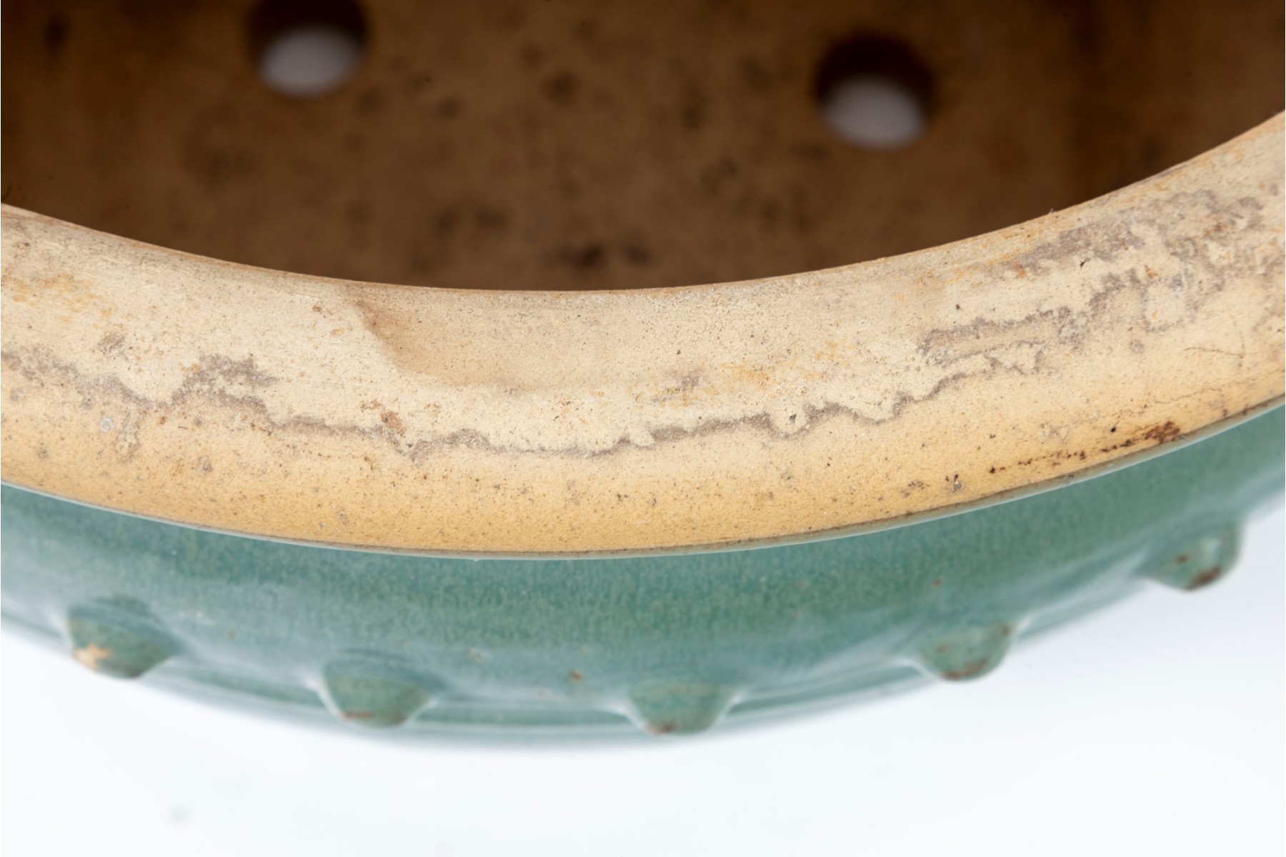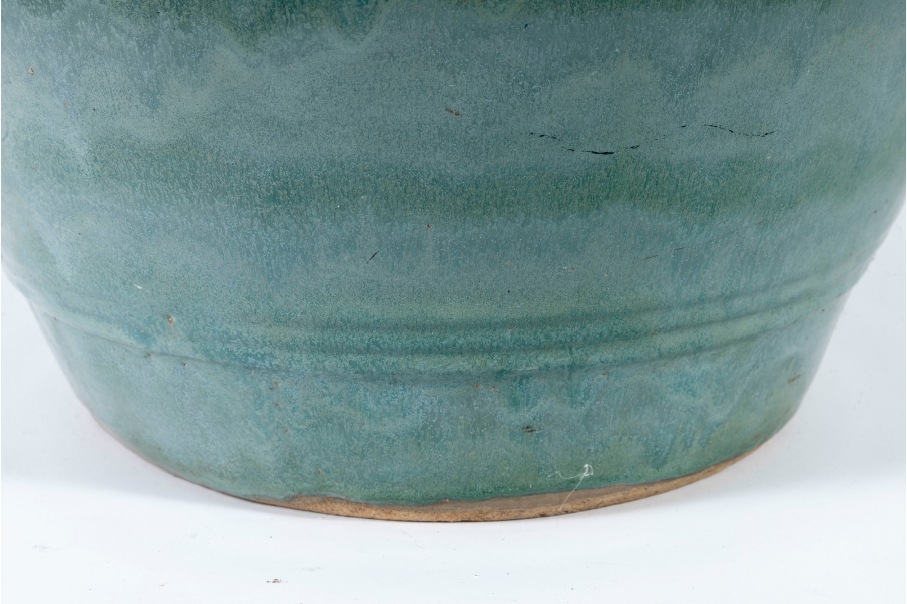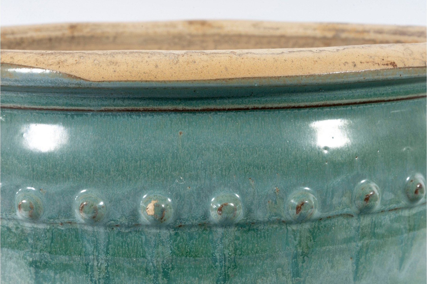 A handsome ceramic planter pot with a stout, flared rim over a rotund apple shaped body in an eye-catching teal celadon glaze with drippy green and blue variations in color adding excellent visual interest. Detailed with a border of hobnails around the top, and subtle ringed borders near the foot. Finished with three drainage holes in the bottom.