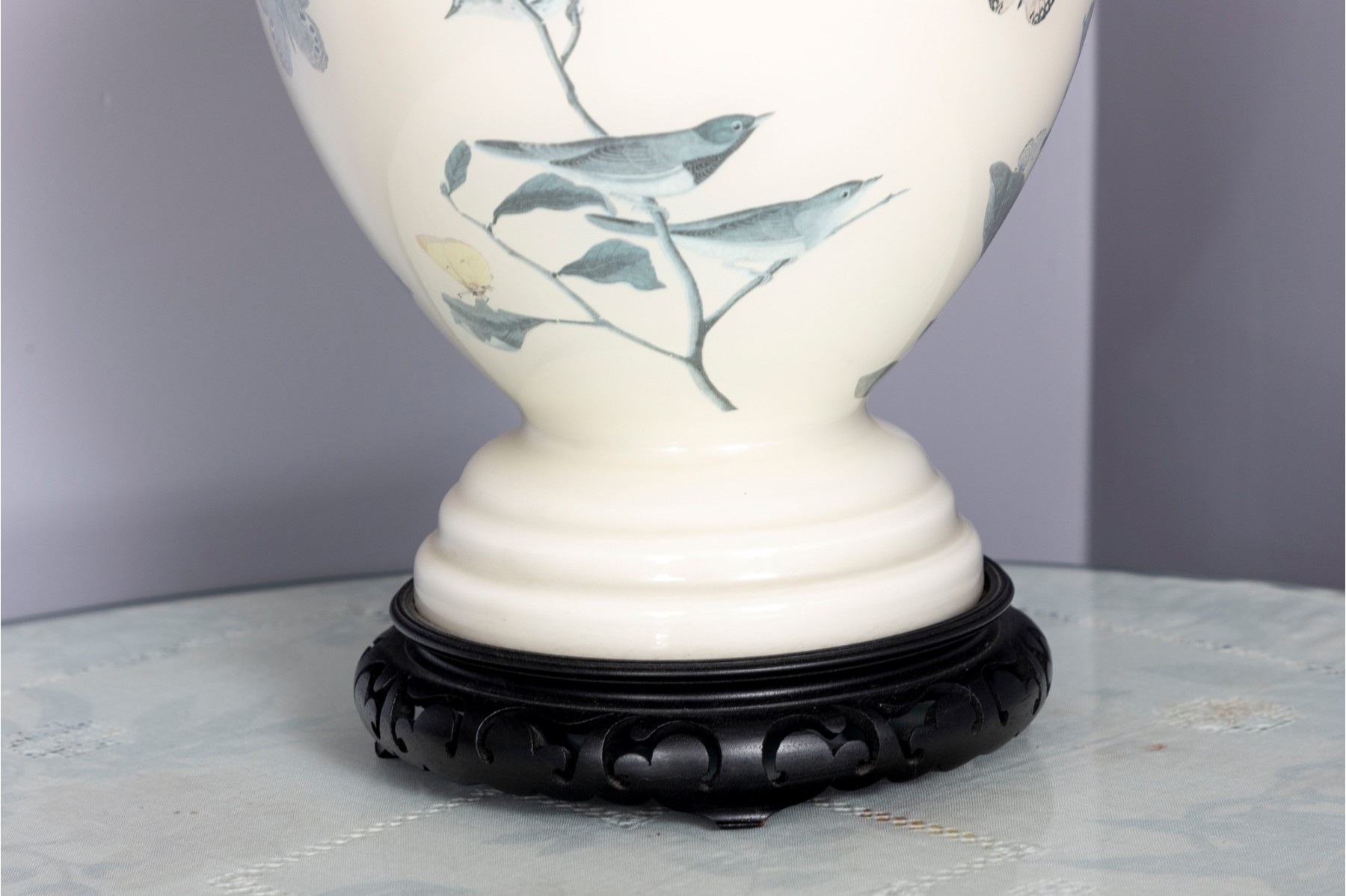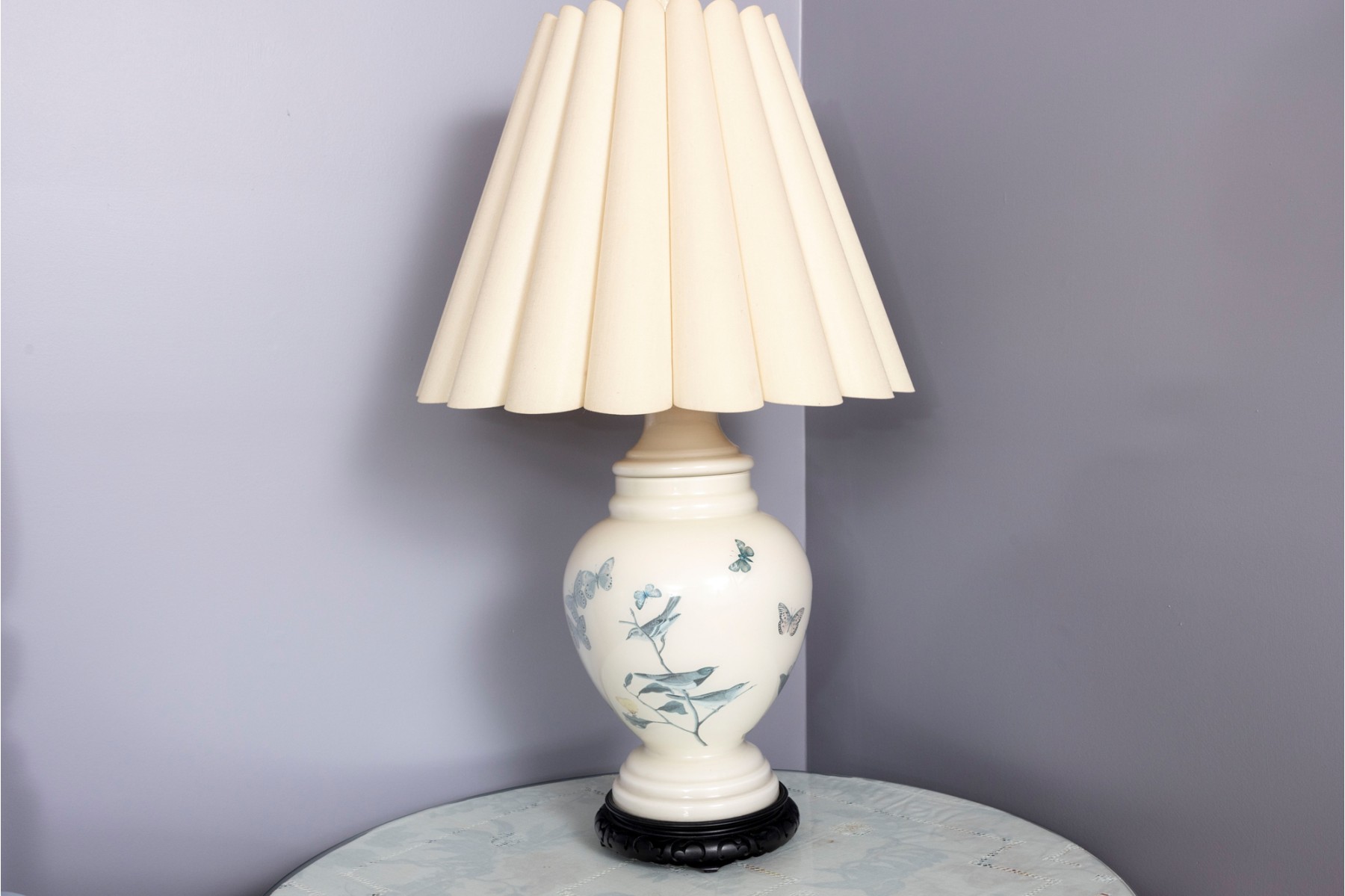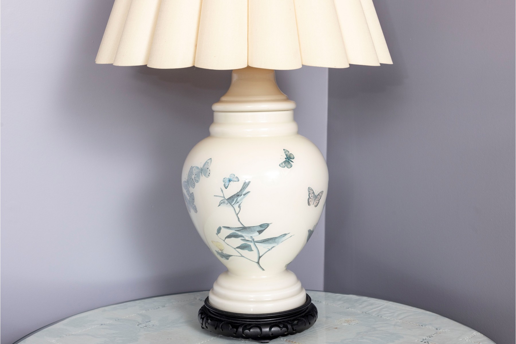 A charming table lamp featuring a white ceramic ginger jar form body decorated with birds and butterflies painted in reverse. Topped with a white scalloped shade.