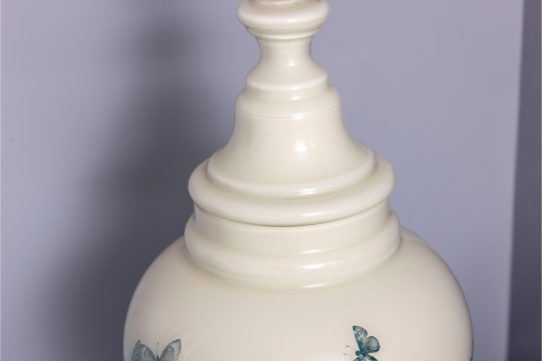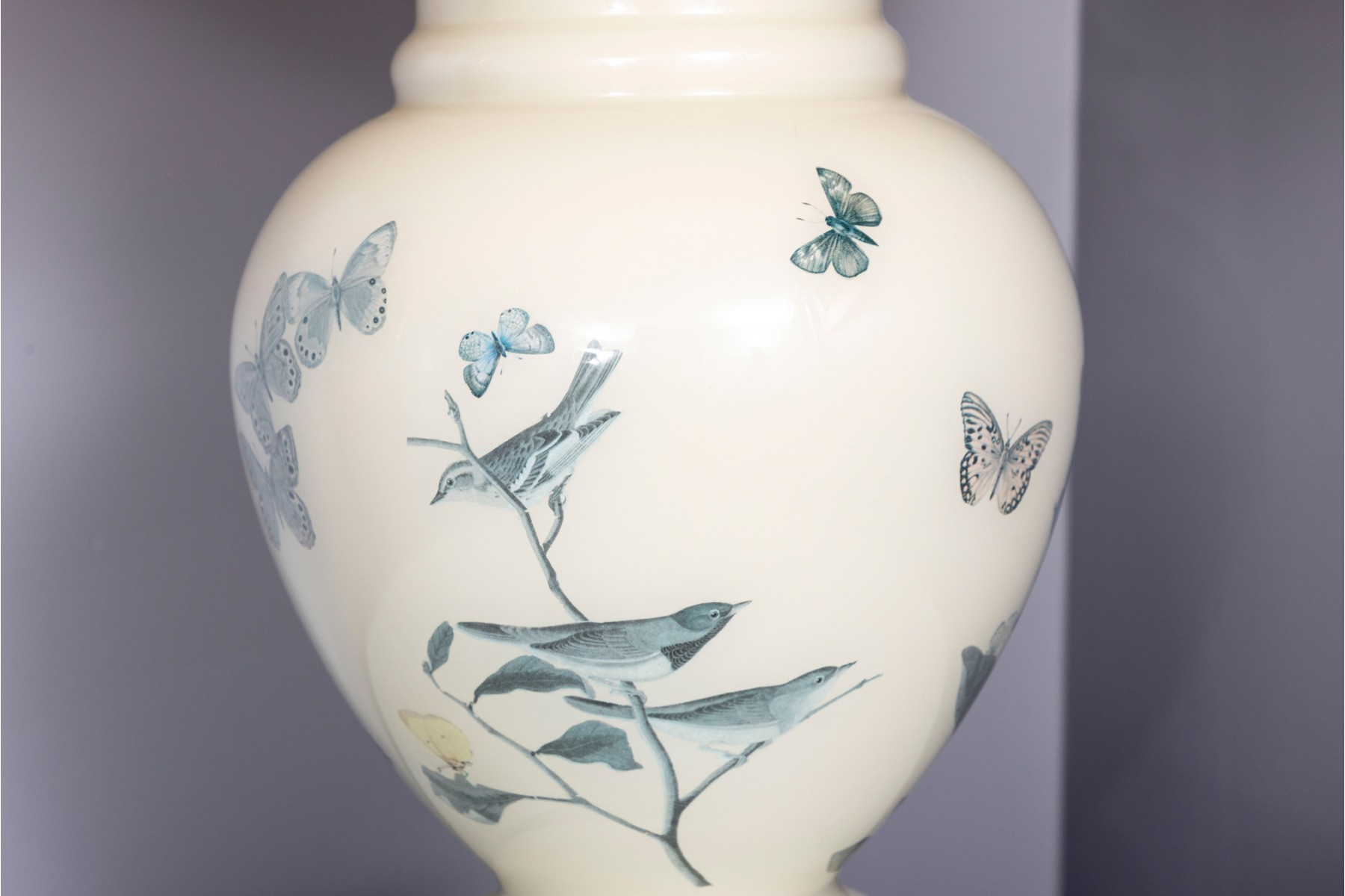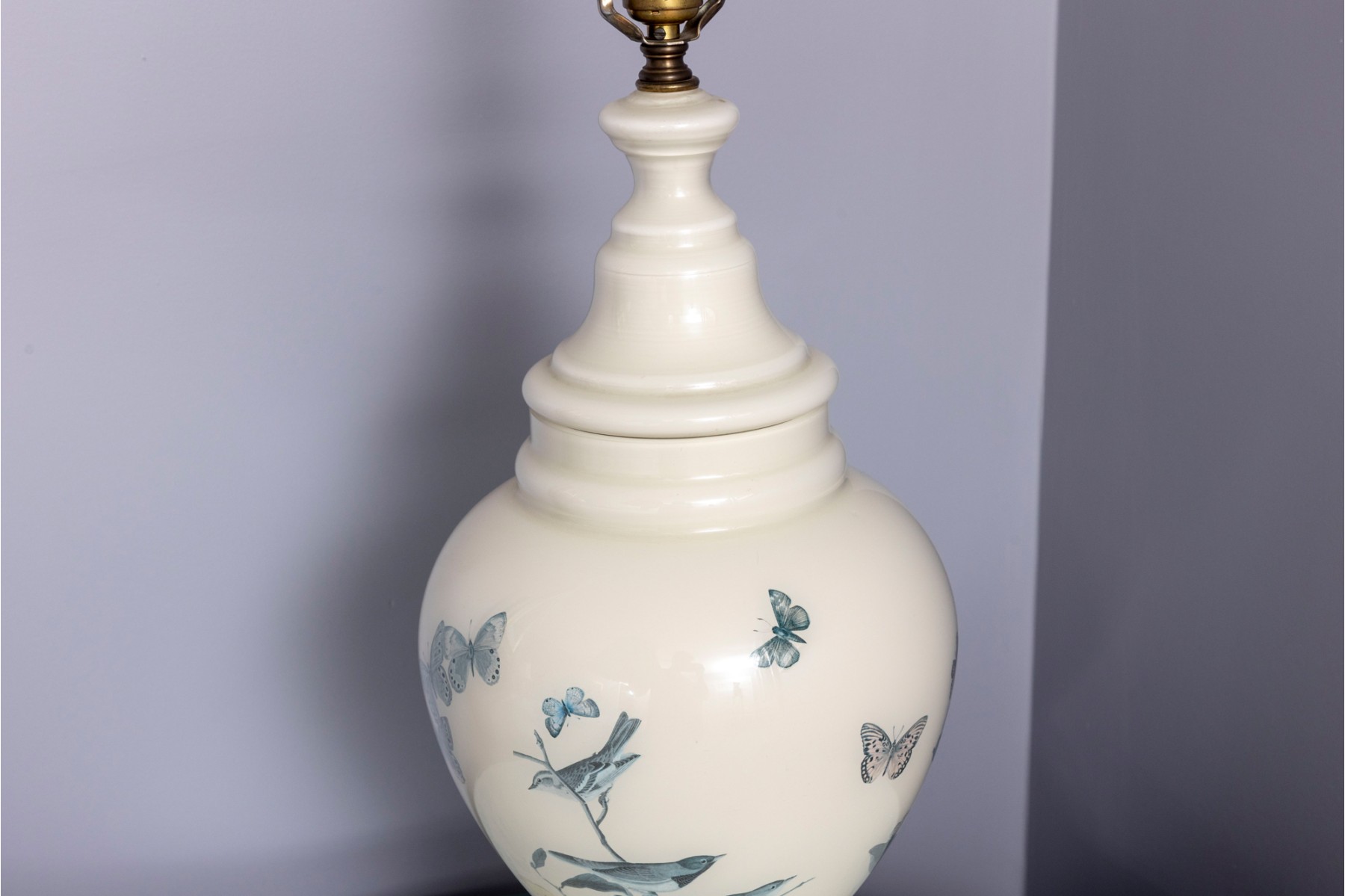 A charming table lamp featuring a white ceramic ginger jar form body decorated with birds and butterflies painted in reverse. Topped with a white scalloped shade.