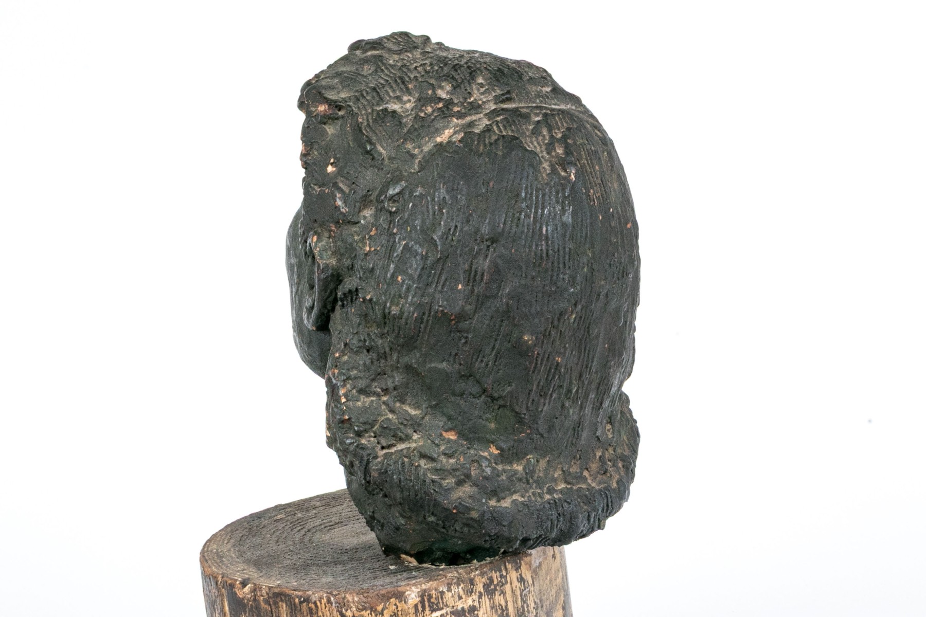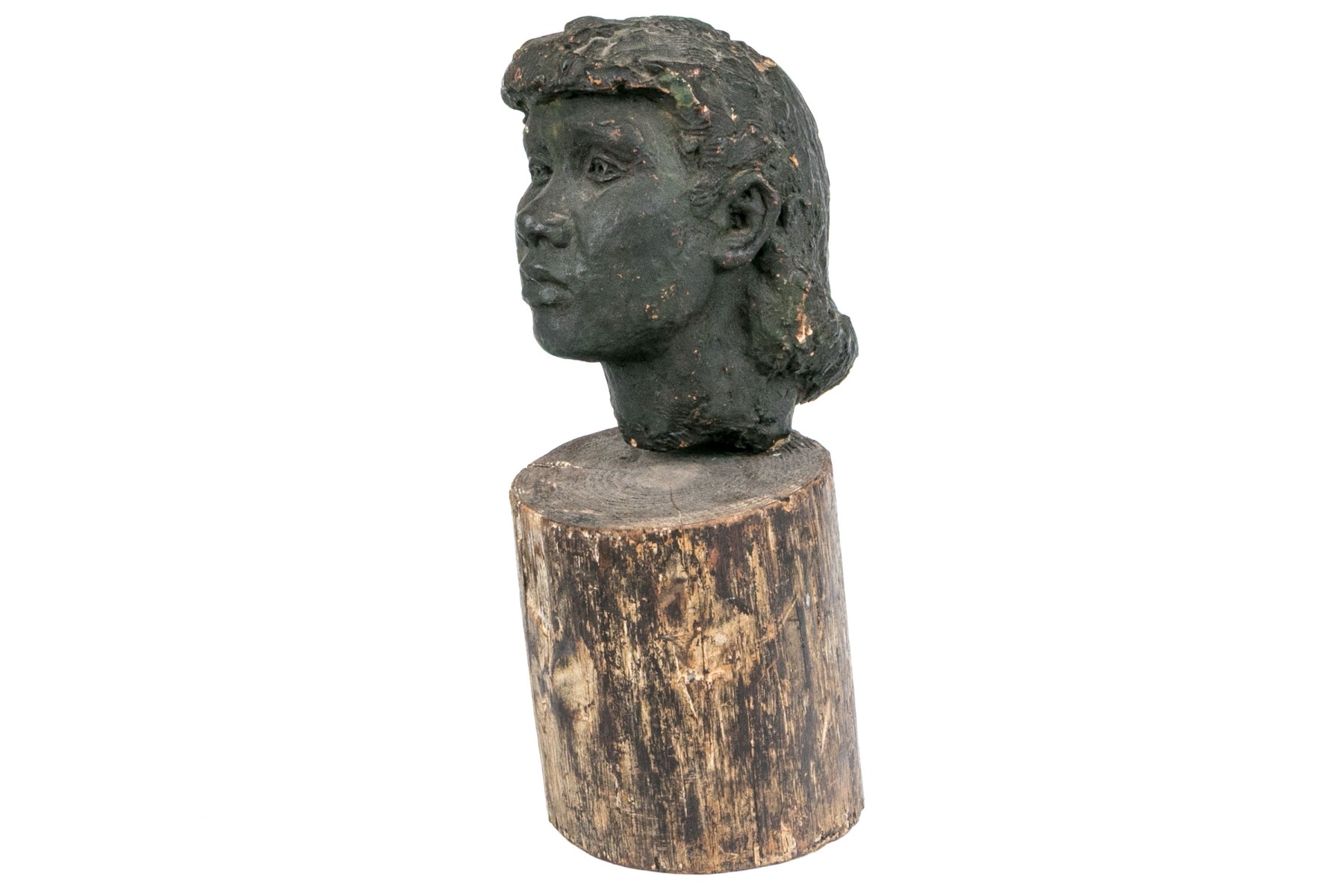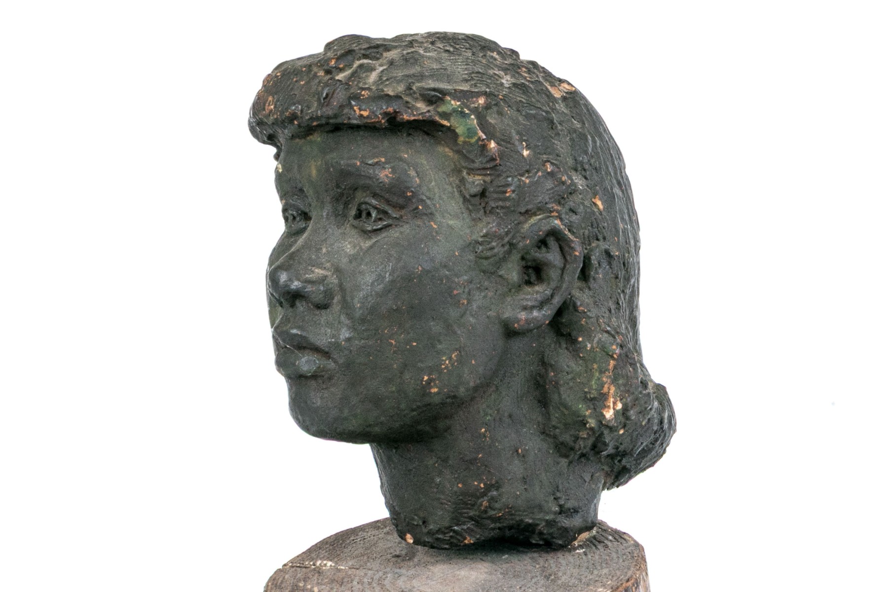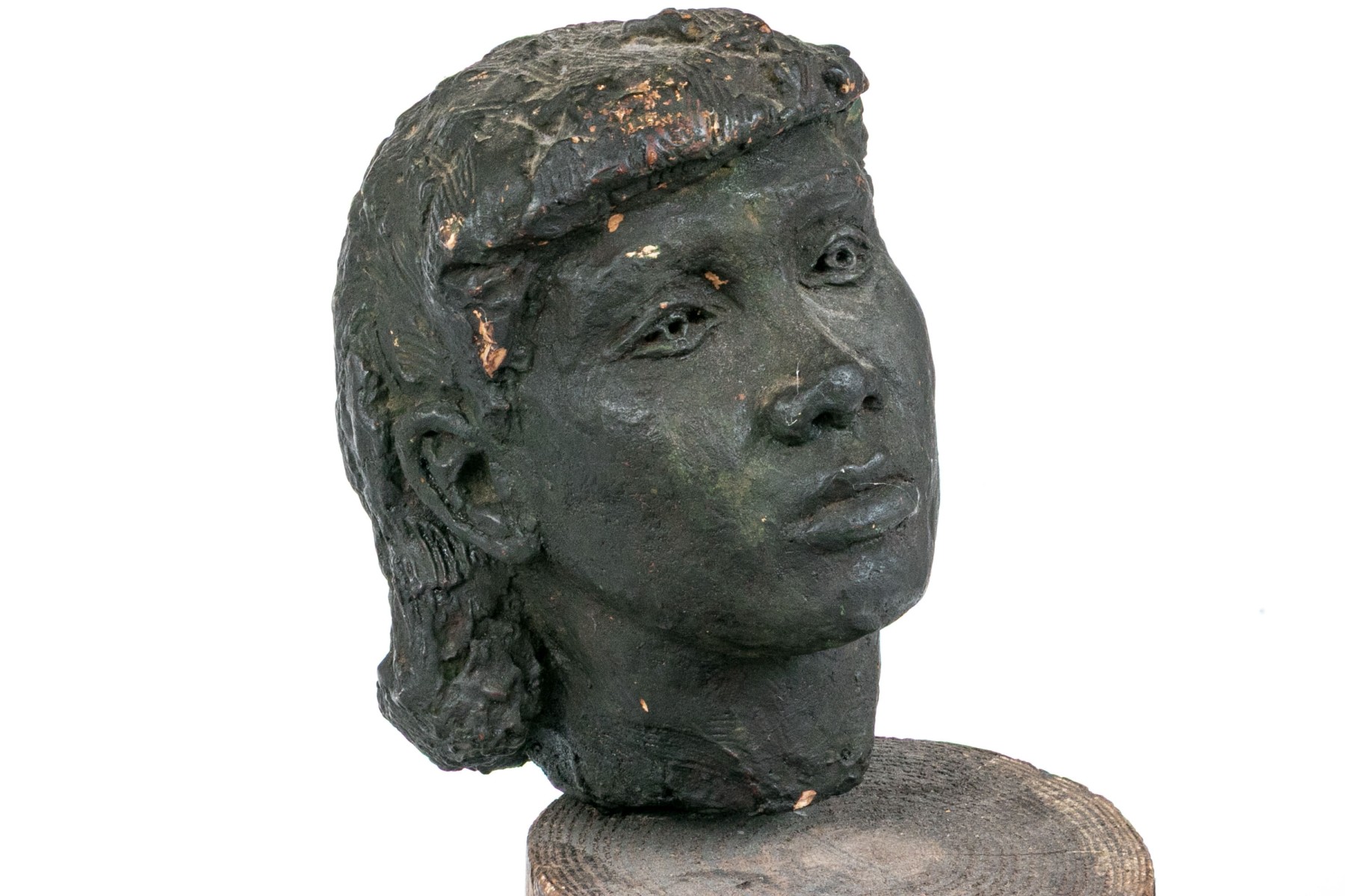 A charming ceramic sculpture of a woman's head in a matte black finish, mounted over a cylindrical trunk base. The head is nicely detailed with a medium length hairstyle and straight fringe and a neutral expression.