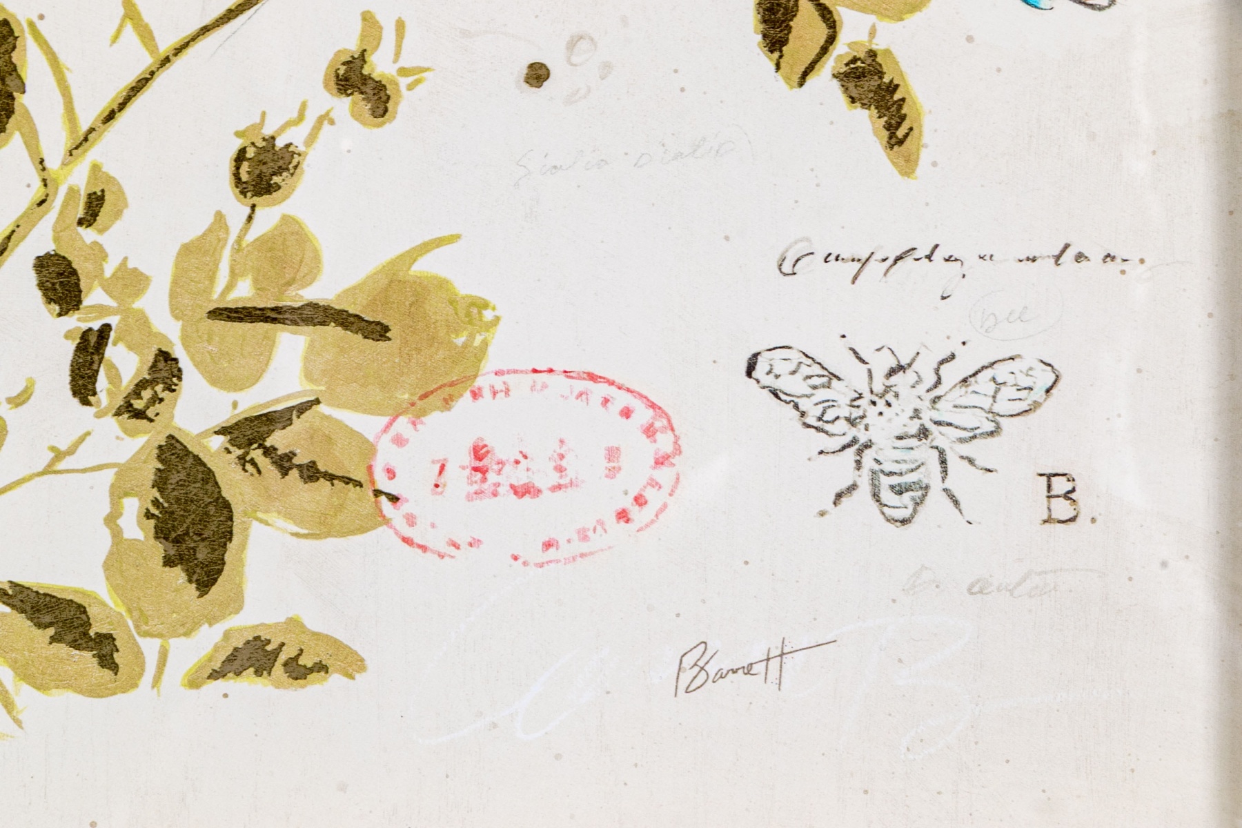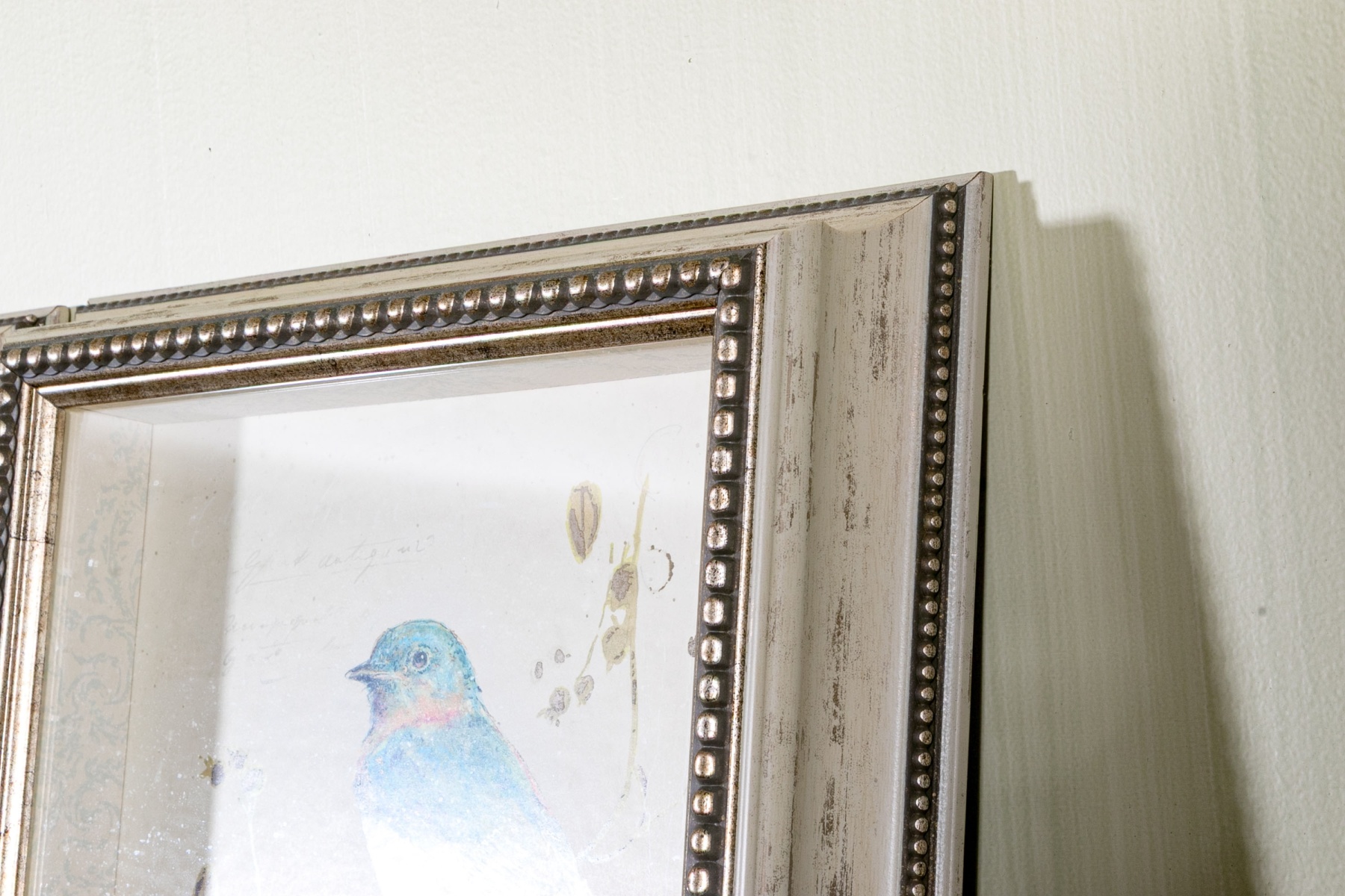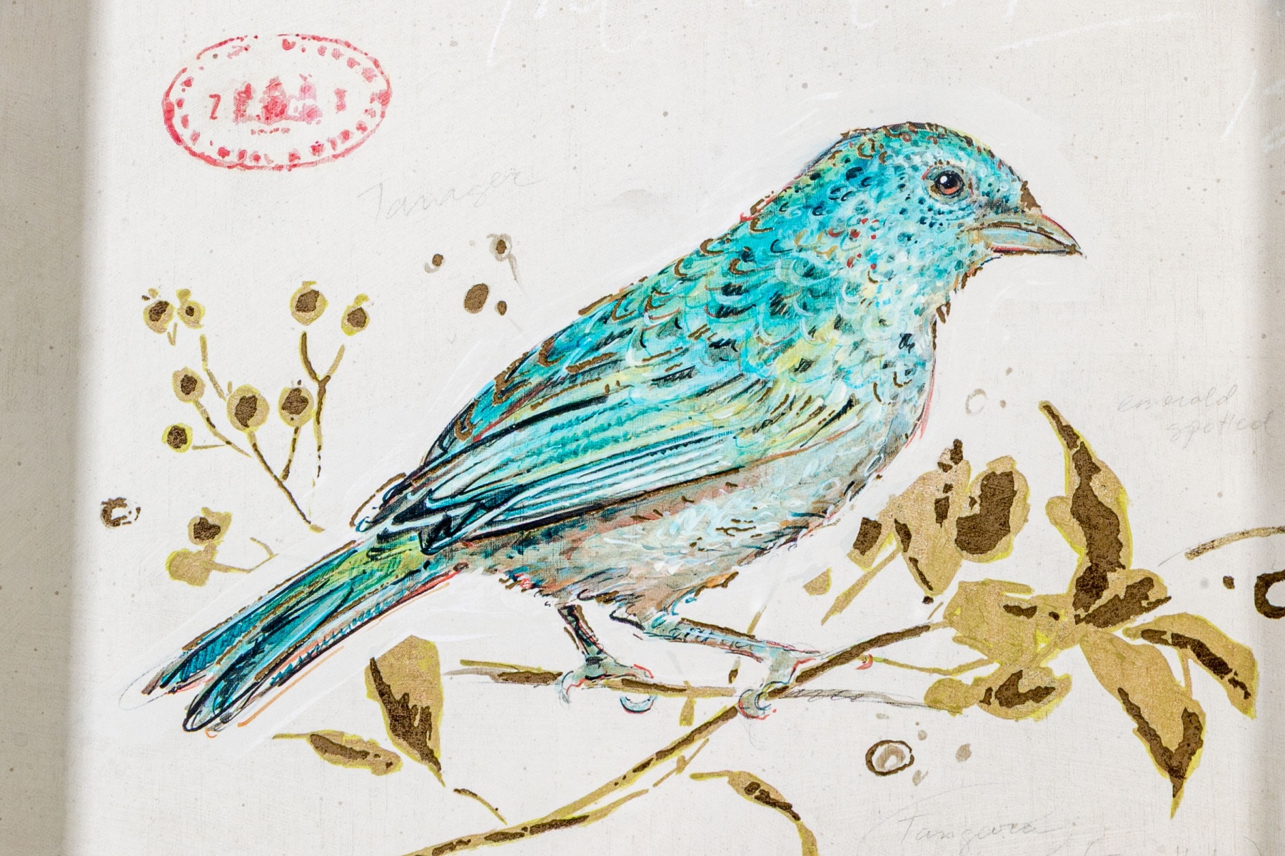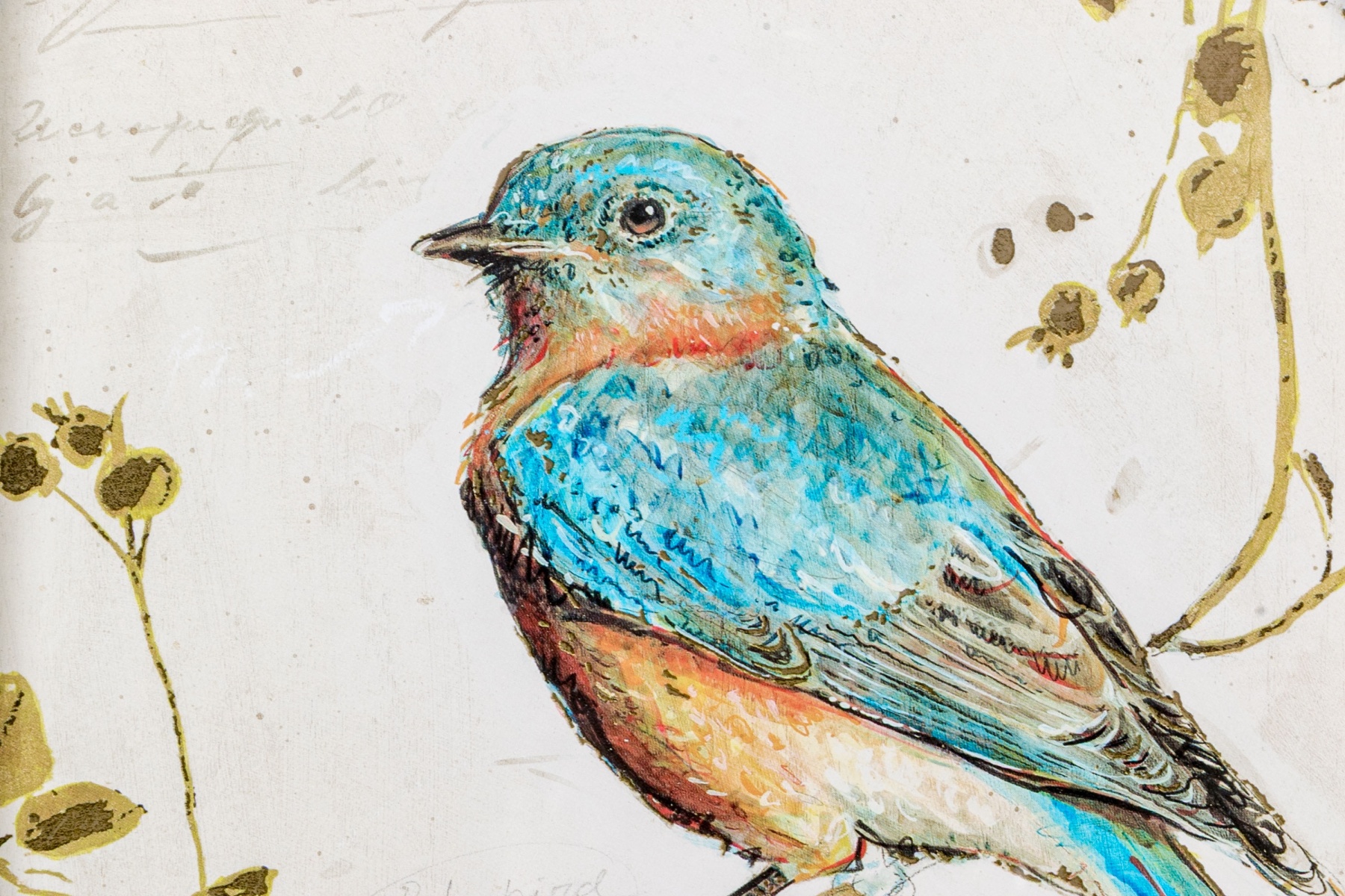Chad Barrett (American, 20th C.) "Songbird 4" and "Gilded Songbird 1" prints depicting vibrant aqua blue birds with hints of green and orange perched on ecru branches against white grounds accented by stamped imagery of insects and handwriting.