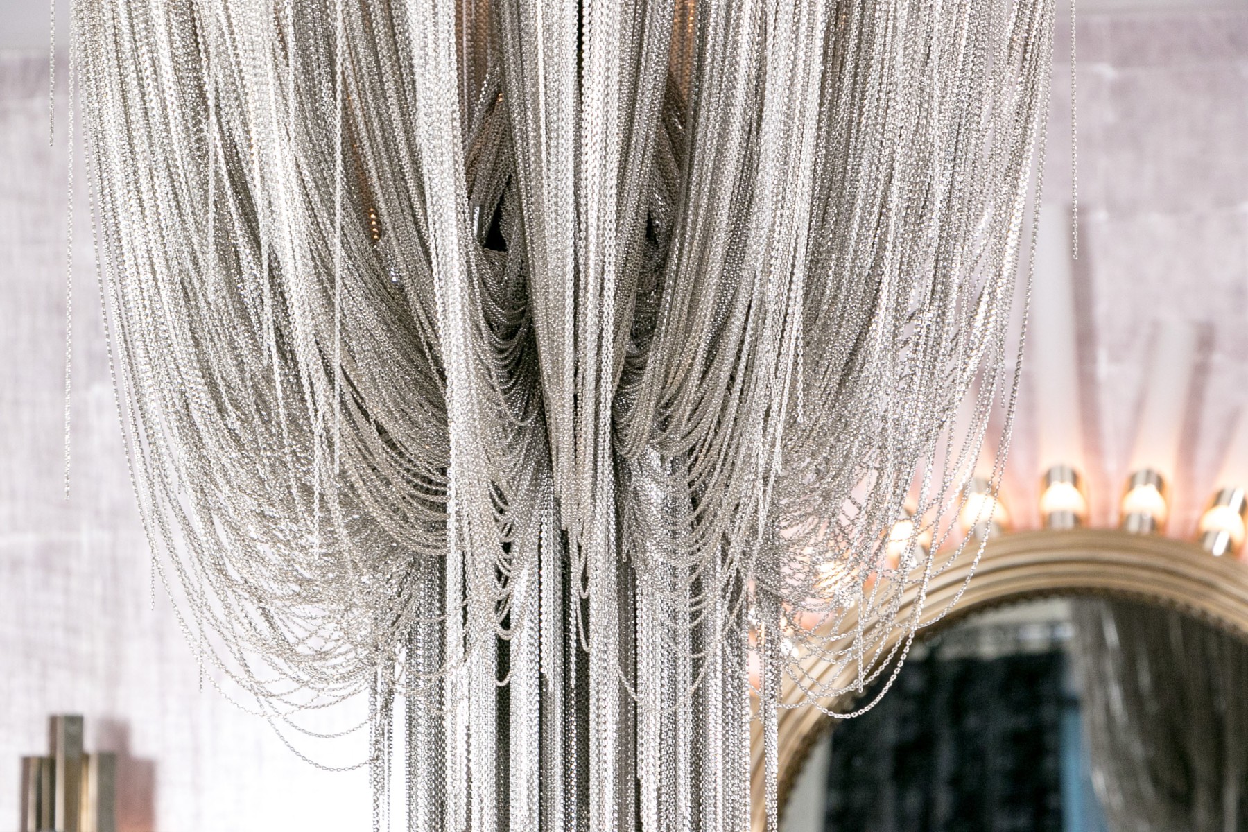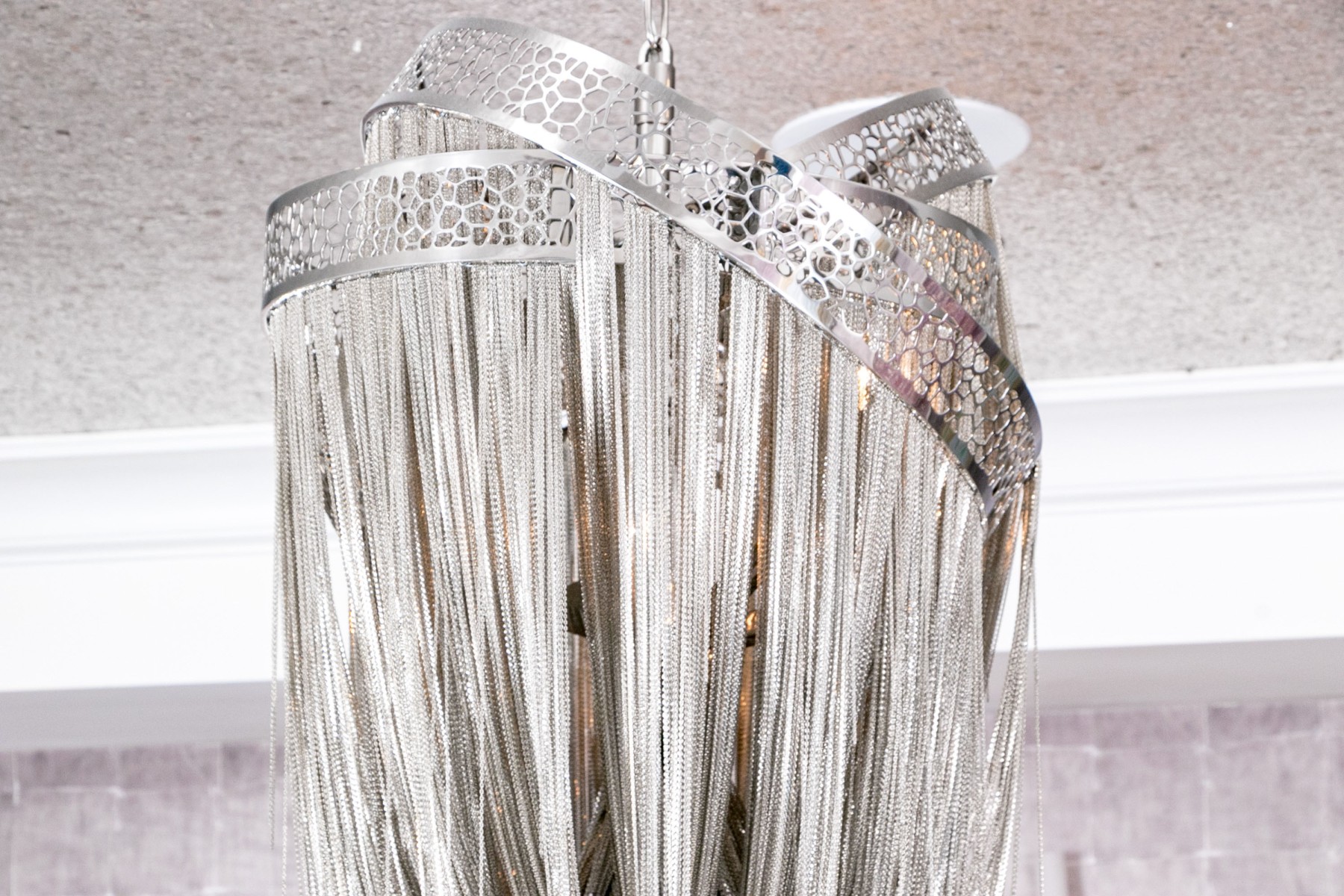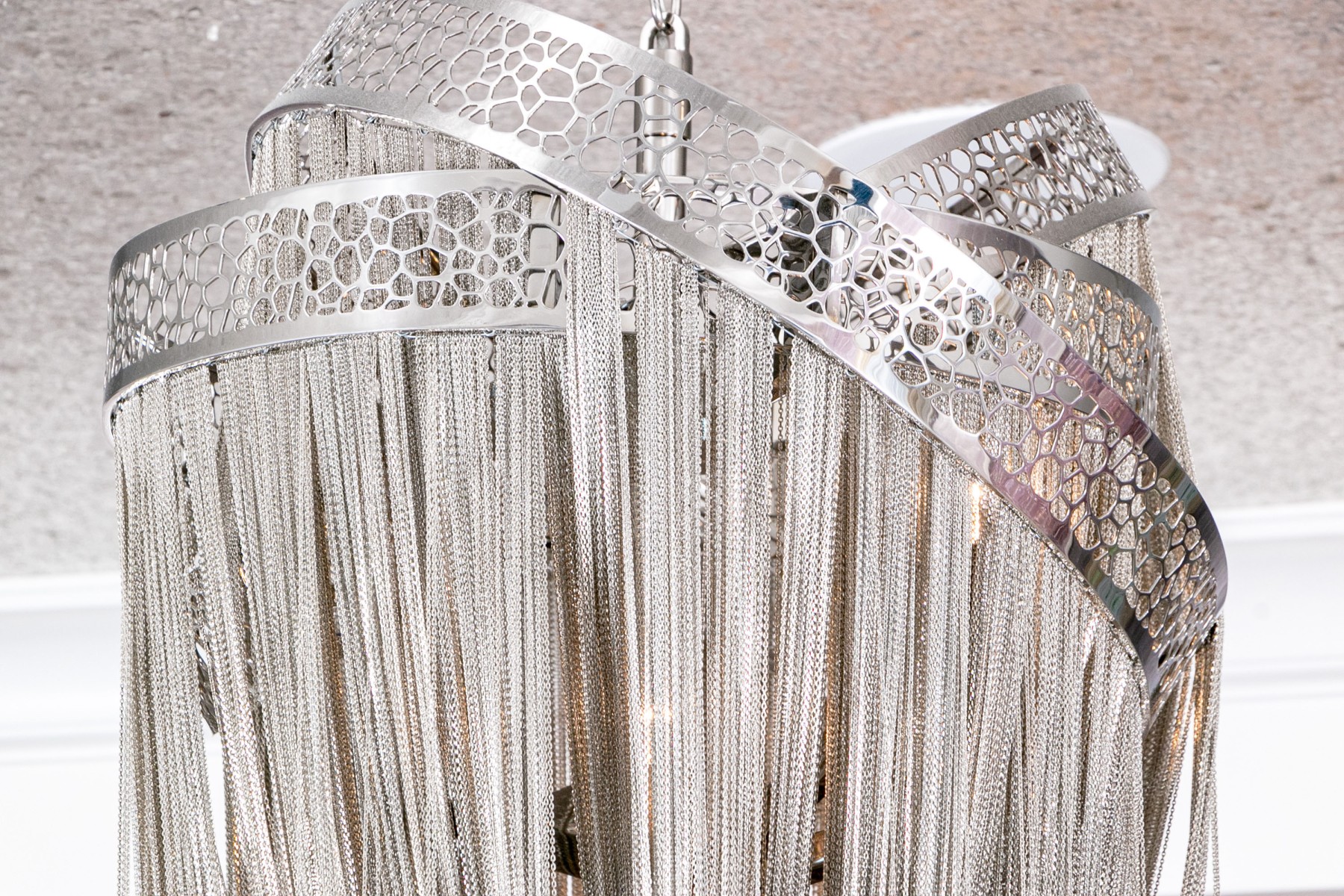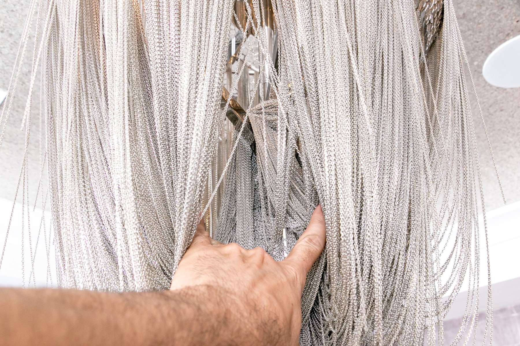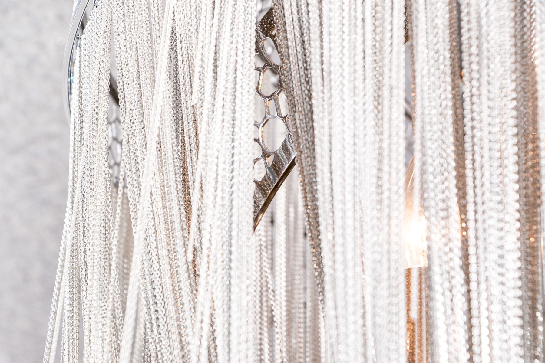 Approximately three miles of jewelry quality chains are meticulously hand-crafted by highly skilled artisans and draped from a polished stainless steel frame. The drama and elegance of this piece when lit in a darkened room is extraordinary.