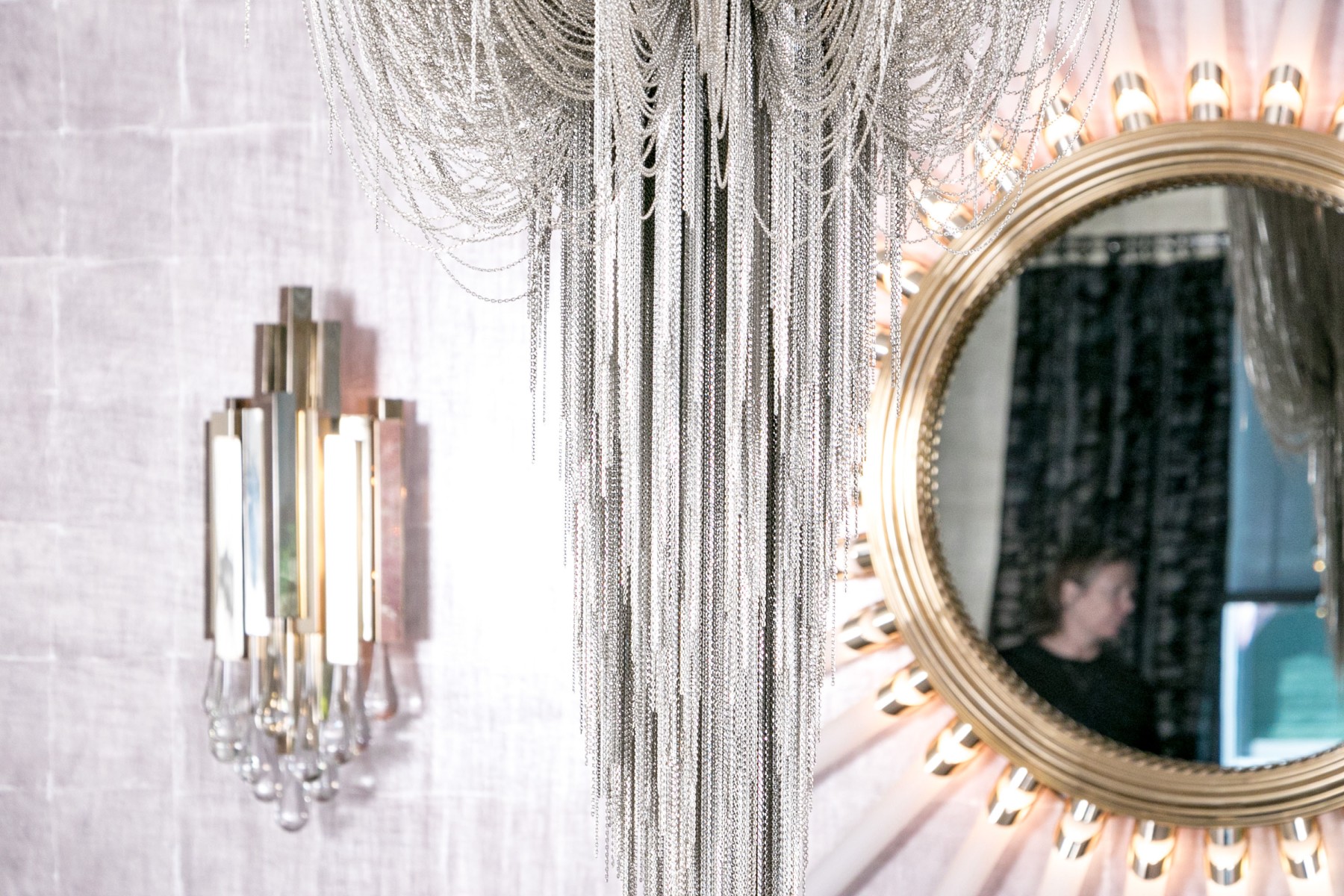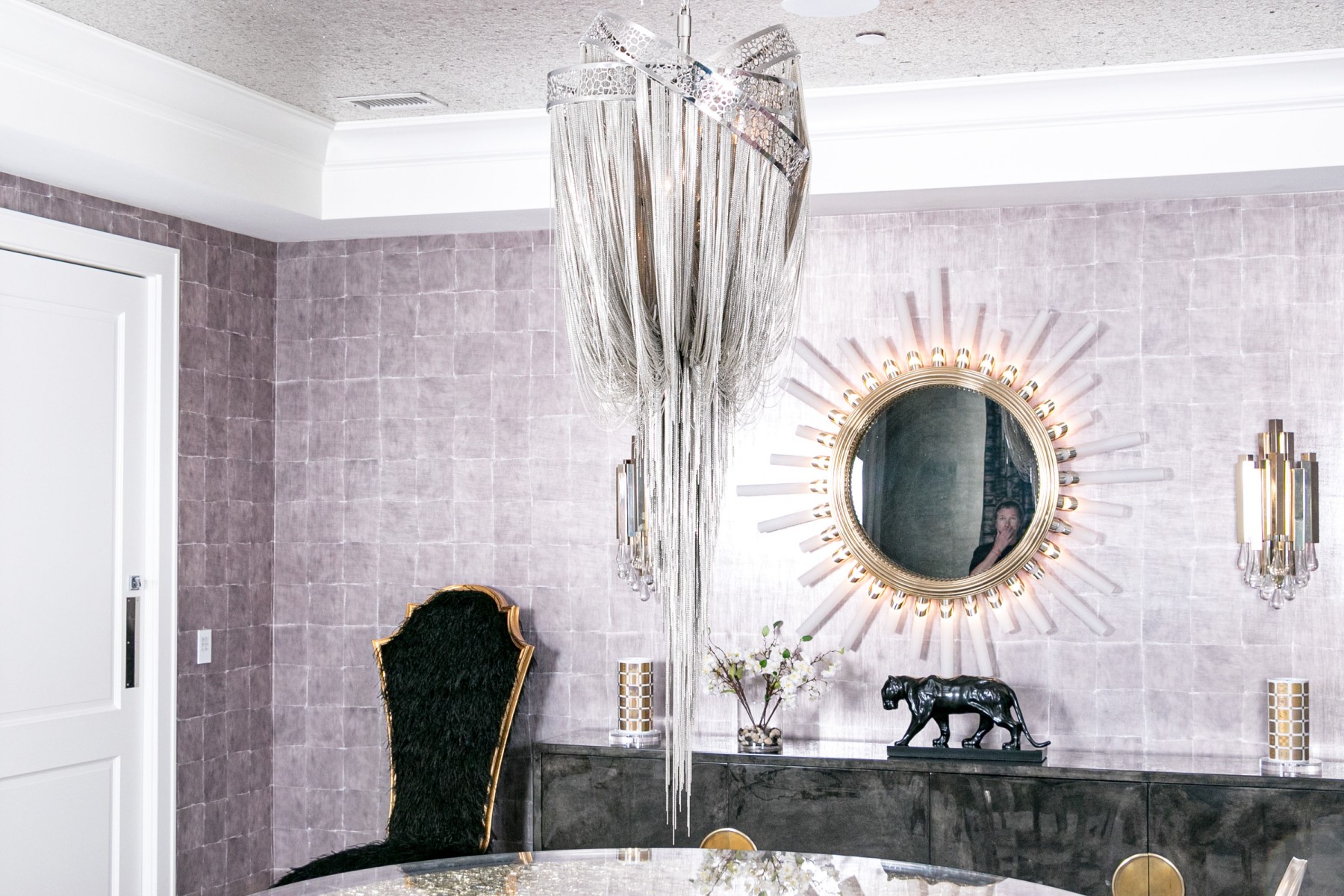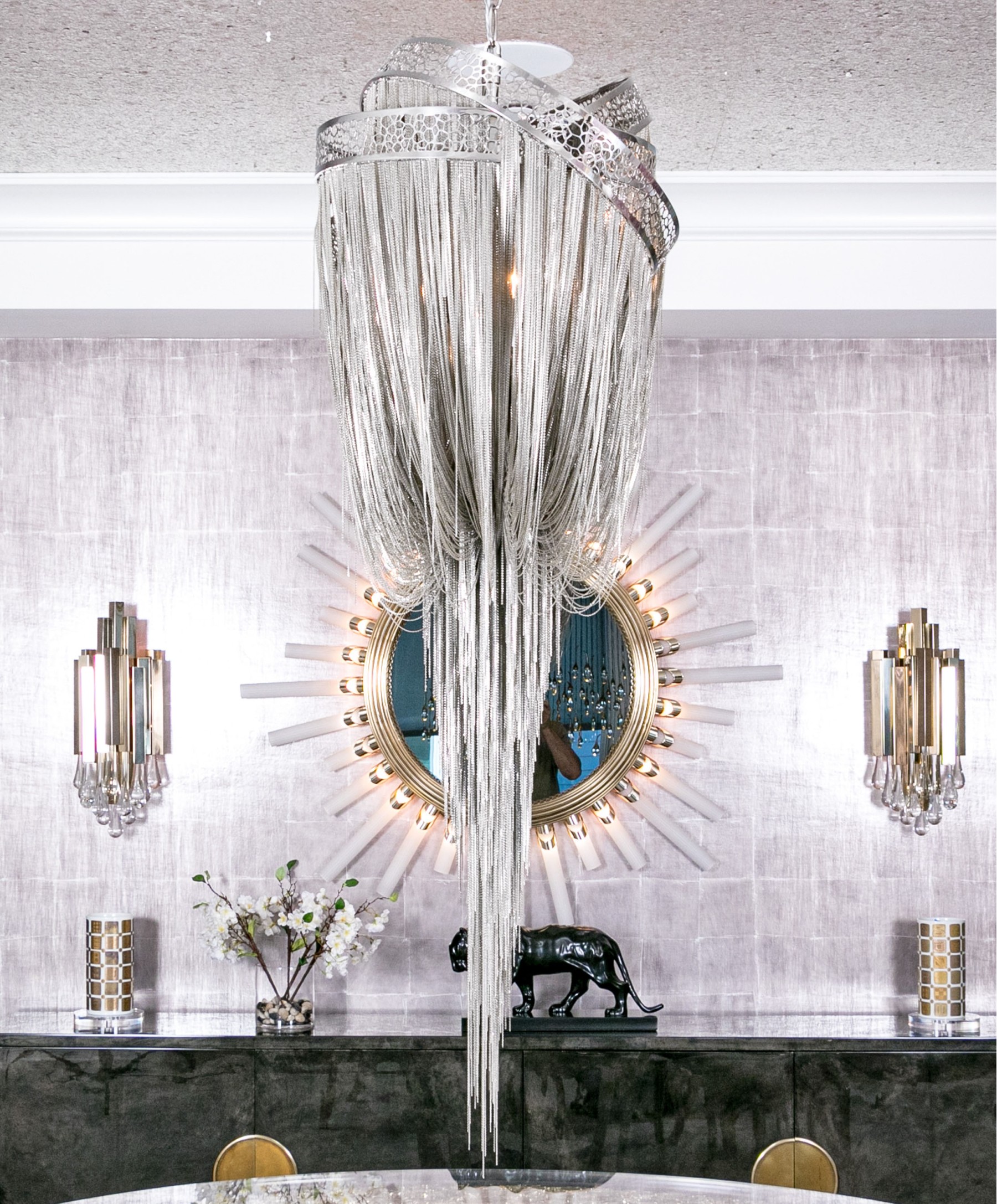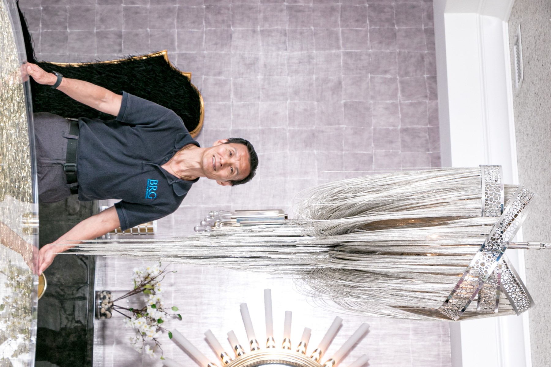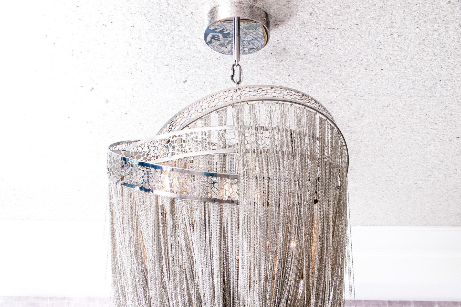 Approximately three miles of jewelry quality chains are meticulously hand-crafted by highly skilled artisans and draped from a polished stainless steel frame. The drama and elegance of this piece when lit in a darkened room is extraordinary.